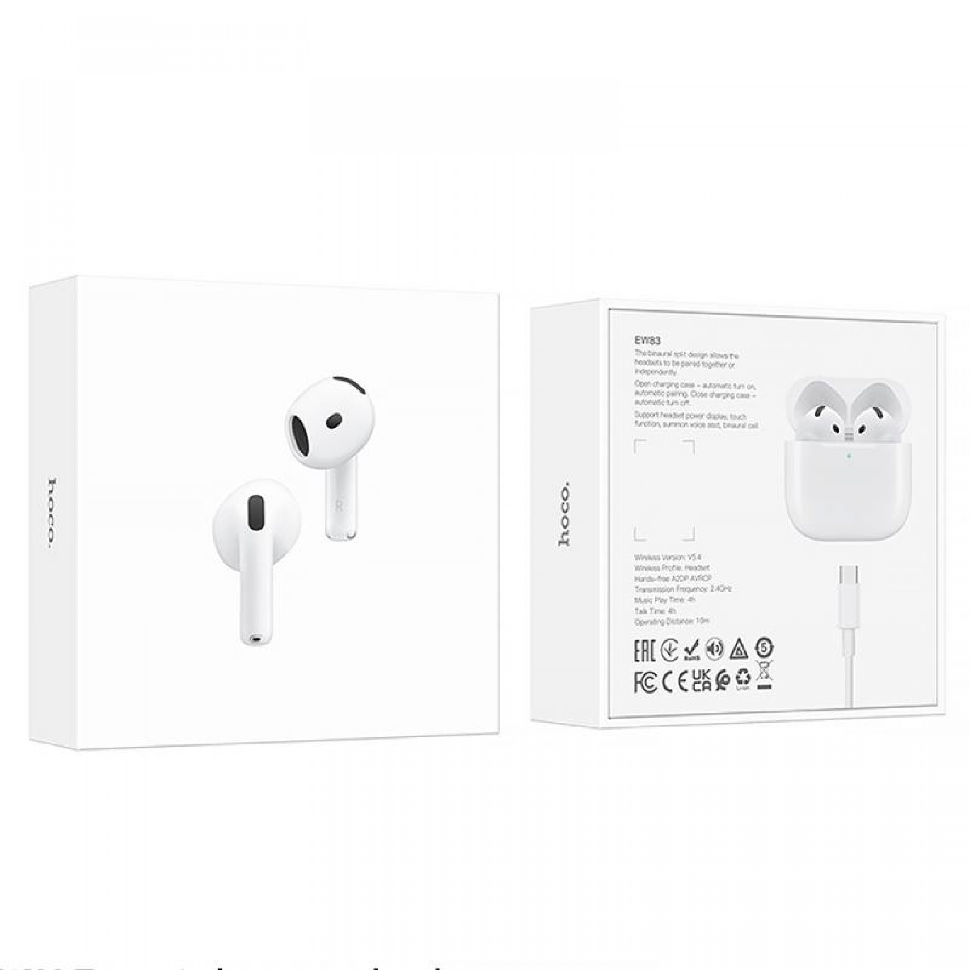 Навушники Hoco EW83 відрізняються сучасним дизайном та високими технічними характеристиками. Вони забезпечують стабільне підключення через Bluetooth 5.4 та мають дальність дії до 10 метрів. Ємність акумулятора навушників становить 30 мАг, а кейса — 300 мАг, що дозволяє насолоджуватися музикою до 4 годин без підзарядки. Зарядка здійснюється через інтерфейс Type-C, а повний цикл зарядки займає всього 1.5 години.