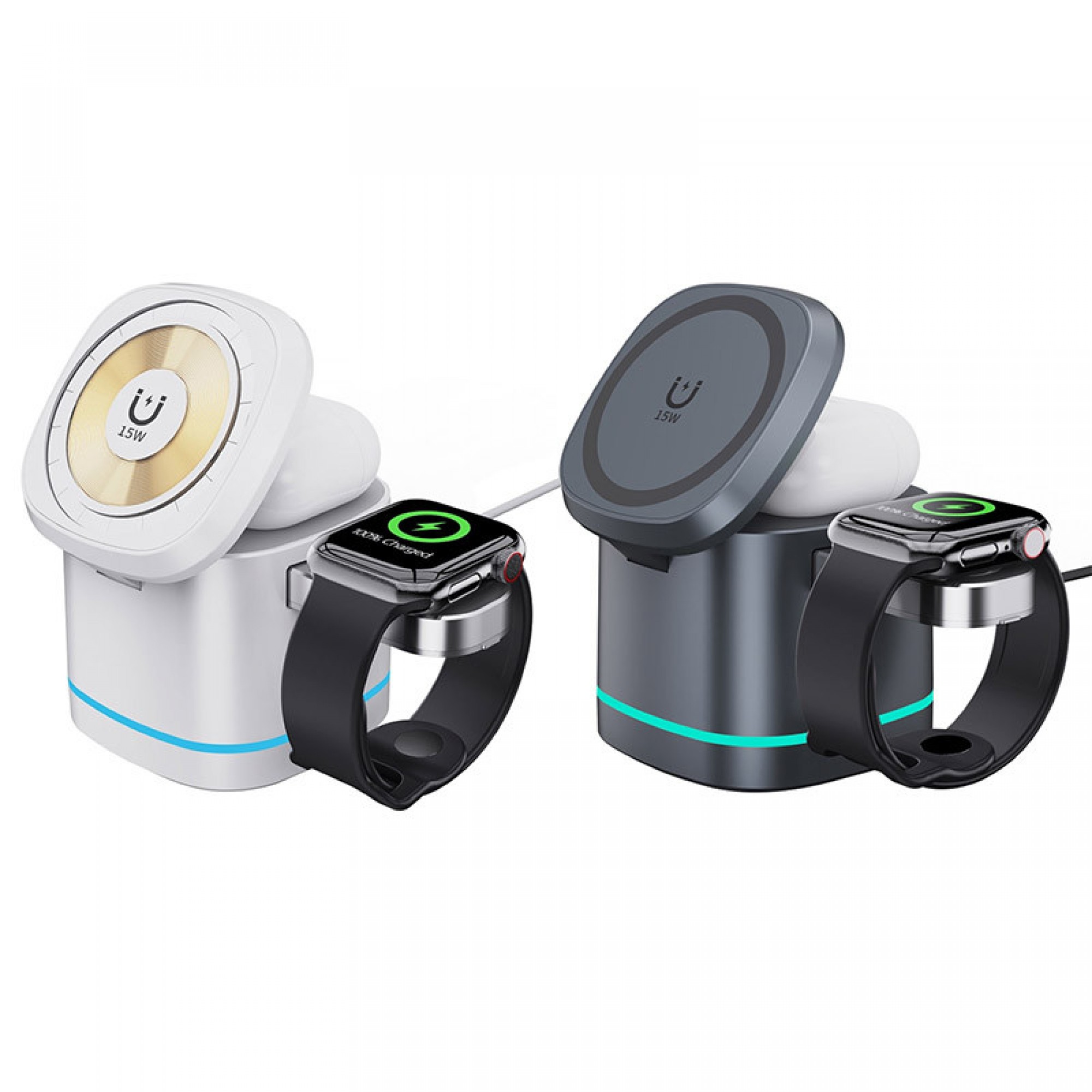 Поєднуючи функції заряджання для телефонів, навушників і годинників, ця компактна станція стане незамінним аксесуаром для робочого столу або нічного столика.