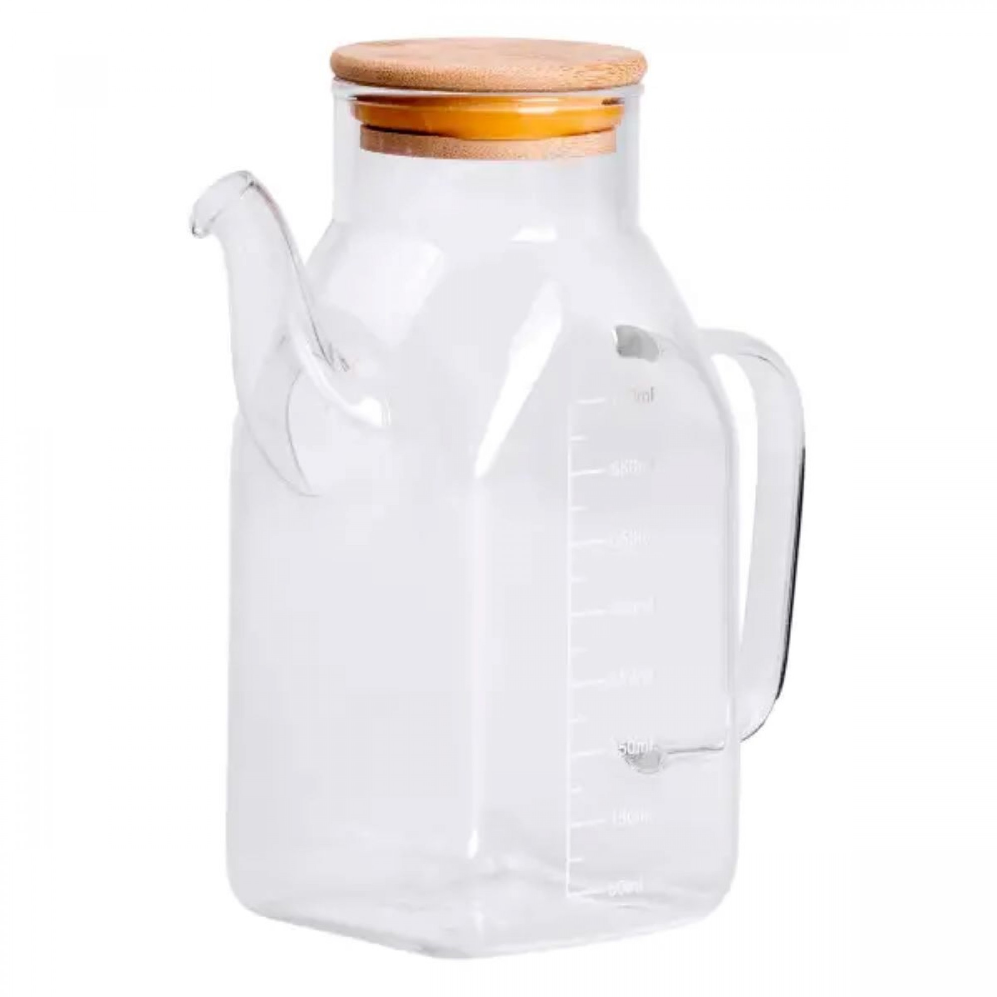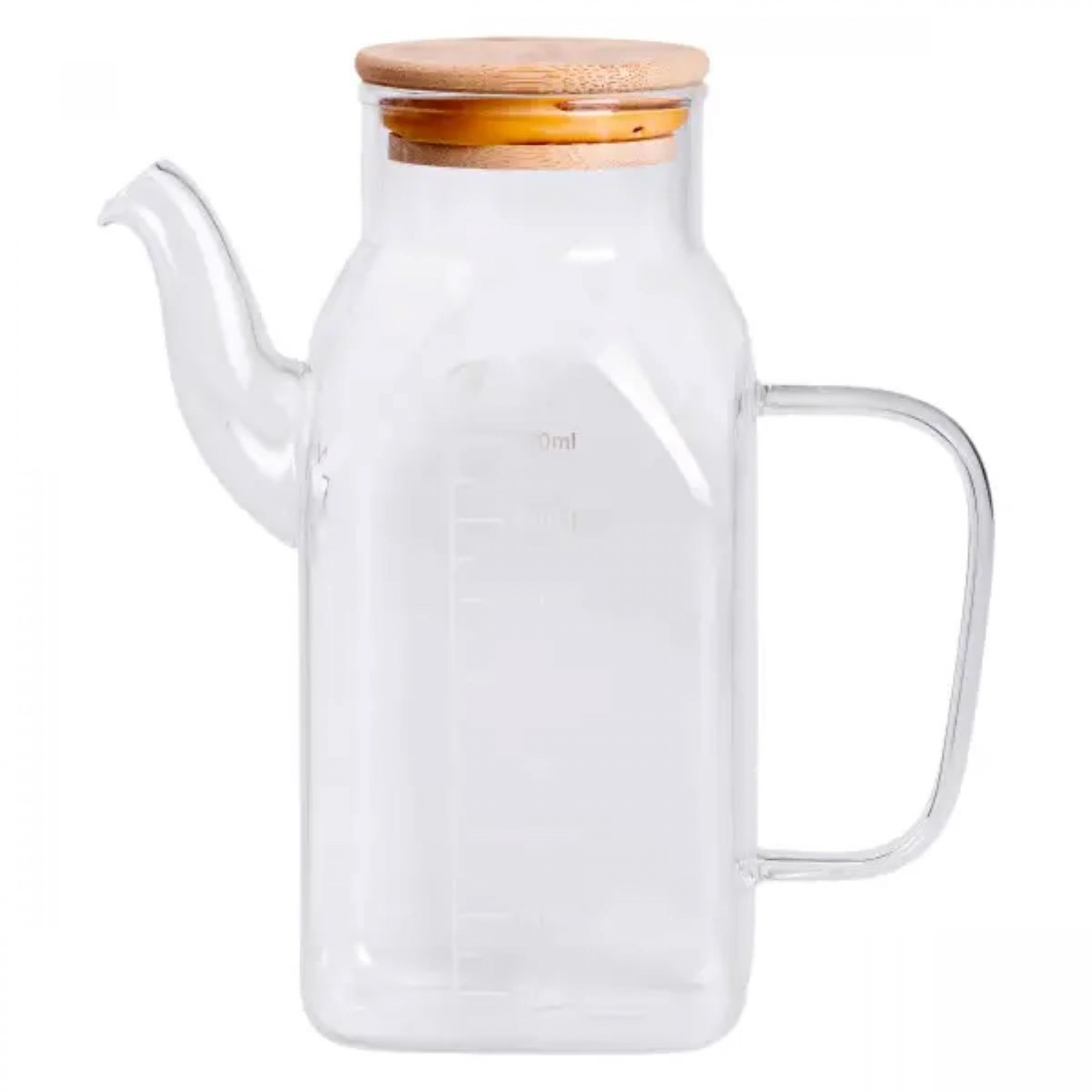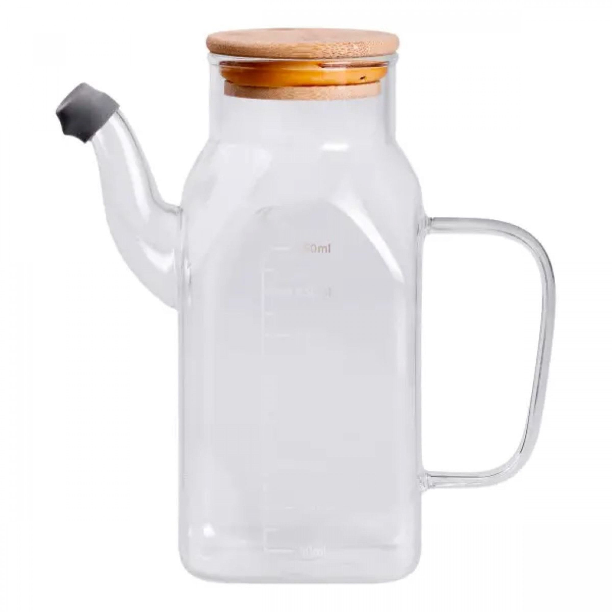 Чайник з мірною шкалою для олії та оцту виготовлено з прозорого боросилікатного скла, стійкого до перепадів температур і не вбирає запахів. Оснащений зручною ручкою і кришкою, що щільно закривається, яка захищає вміст від пилу. Основні характеристики: Об'єм: 750 мл; Розміри: 8×8×18.5 см; Верхній діаметр: 6 см; Нижній розмір: 8×8 см; Матеріал пляшки: скло; Матеріал кришки: бамбук. Особливості: Широке горлечко полегшує наповнення і миття; Наявність мірної шкали дає змогу точно дозувати обсяг; Універсальний дизайн впишеться в інтер'єр будь-якої кухні; Зручна в щоденному використанні. Завдяки стійкій основі ємність для олії стабільно стоїть на будь-якій поверхні, запобігаючи випадковому перекиданню. Ергономічна форма забезпечує комфортне наливання, а боросилікатне скло дає змогу бачити рівень і якість вмісту. Ідеально підходить для щоденного використання на кухні - як у домашніх умовах, так і в професійній сфері. Можна використовувати для подачі оливкової олії, оцту, соєвого соусу або інших рідин. Практична в догляді, легко миється вручну або в посудомийній машині.