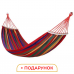 Підвісний тканинний гамак оснащений дерев'яною планкою, яка сприяє рівномірному розподілу навантаження і забезпечує зручне розташування під час відпочинку. Полотно виготовлено з міцних тканинних і нейлонових матеріалів, що забезпечує стійкість до зношування і дає змогу використовувати гамак протягом тривалого часу. Основні характеристики: Розміри лежака (ДхШ): 174х80 см; Розмір у складеному стані: 80х10х10 см; Тип: підвісний; Матеріал: бавовна, дерево; Рекомендоване навантаження: 120 кг. На кожній стороні гамака передбачена мотузка-вішалка з в'язаним морським вузлом, що підвищує його міцність і надійність при підвісному монтажі. Конструкція розрахована на рівномірний розподіл навантаження, що зменшує ризик пошкоджень і деформацій матеріалу. Використані матеріали адаптовані до умов зовнішнього середовища, що робить гамак придатним для використання як у приміщенні, так і на відкритому повітрі.