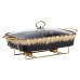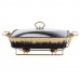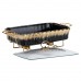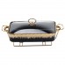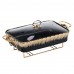 Керамічна прямокутна мармітниця об'ємом 2 л є вишуканим і функціональним доповненням до вашого кухонного арсеналу. Виготовлена з високоякісної кераміки, вона забезпечує рівномірне нагрівання та довготривале збереження тепла, що робить її ідеальною для подачі гарячих страв безпосередньо на стіл. Чорне покриття додає сучасного вигляду, а золотисте оздоблення по краях надає витонченості та розкоші, роблячи її чудовим вибором як для повсякденного використання, так і для святкових заходів. Скляна кришка дозволяє контролювати процес приготування, зберігаючи тепло та аромат страв. Характеристики: Розміри: 40*23*11 см Об'єм: 2 лМатеріал: кераміка, скло, нержавіюча сталь Переваги: Мармітниця оснащена металевою підставкою з підігрівом, яка дозволяє підтримувати оптимальну температуру страви під час подачі. Міцна металева підставка гарантує стабільність та надійність конструкції, додаючи елегантності і зручності сервіруванню. Це робить мармітницю центральним елементом будь-якого столу. Догляд: Рекомендується ручне миття з використанням м’яких миючих засобів. Уникайте різких перепадів температури, щоб зберегти довговічність покриття та матеріалів.