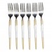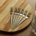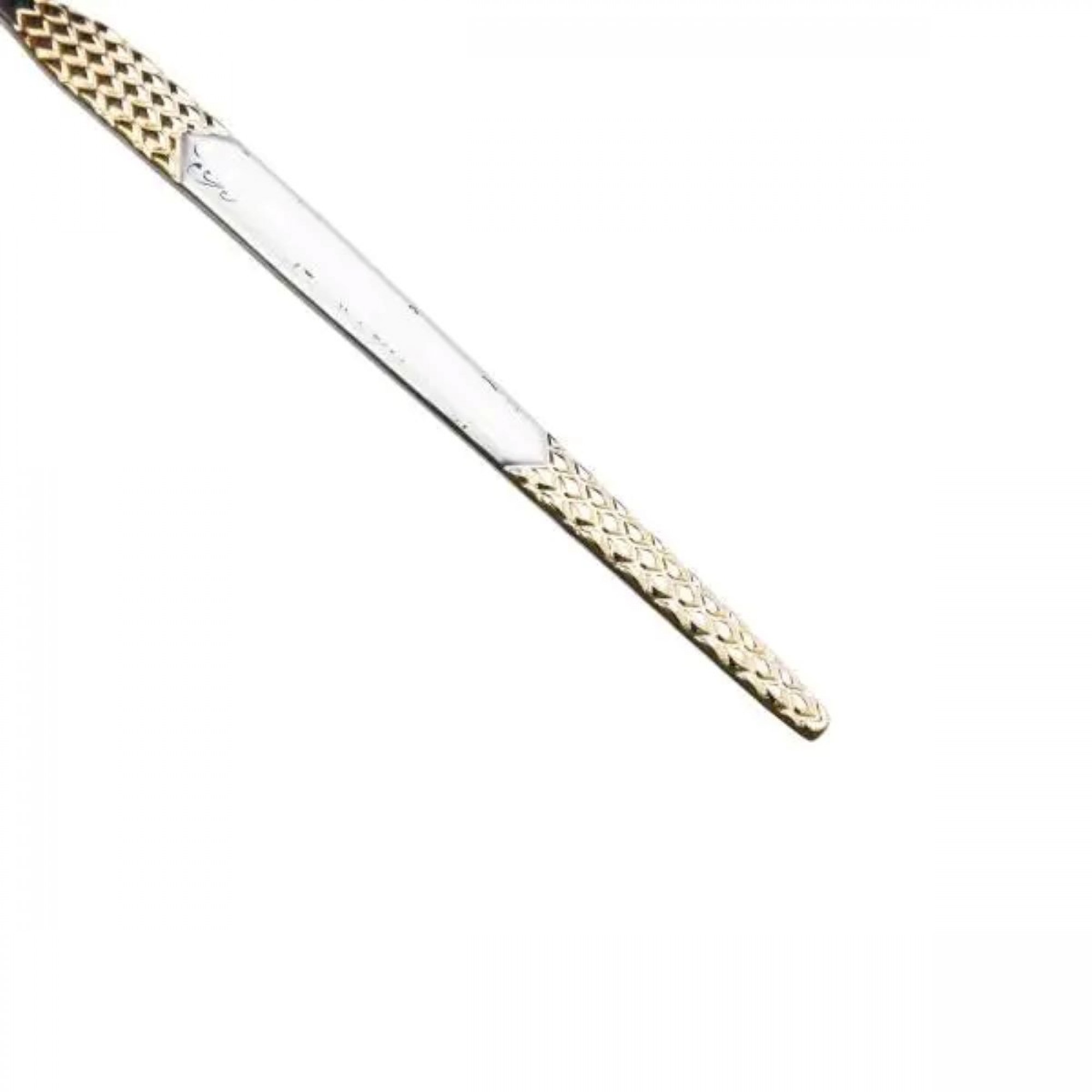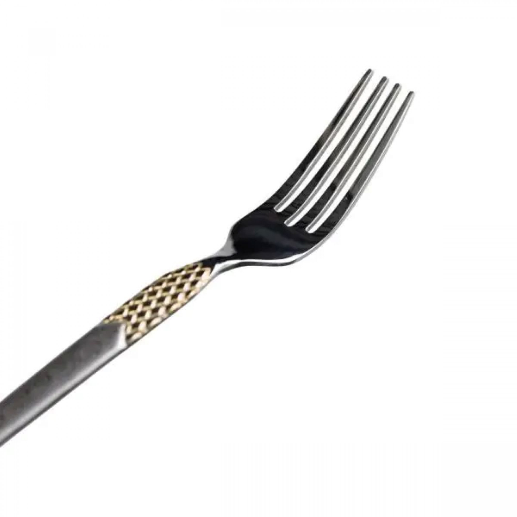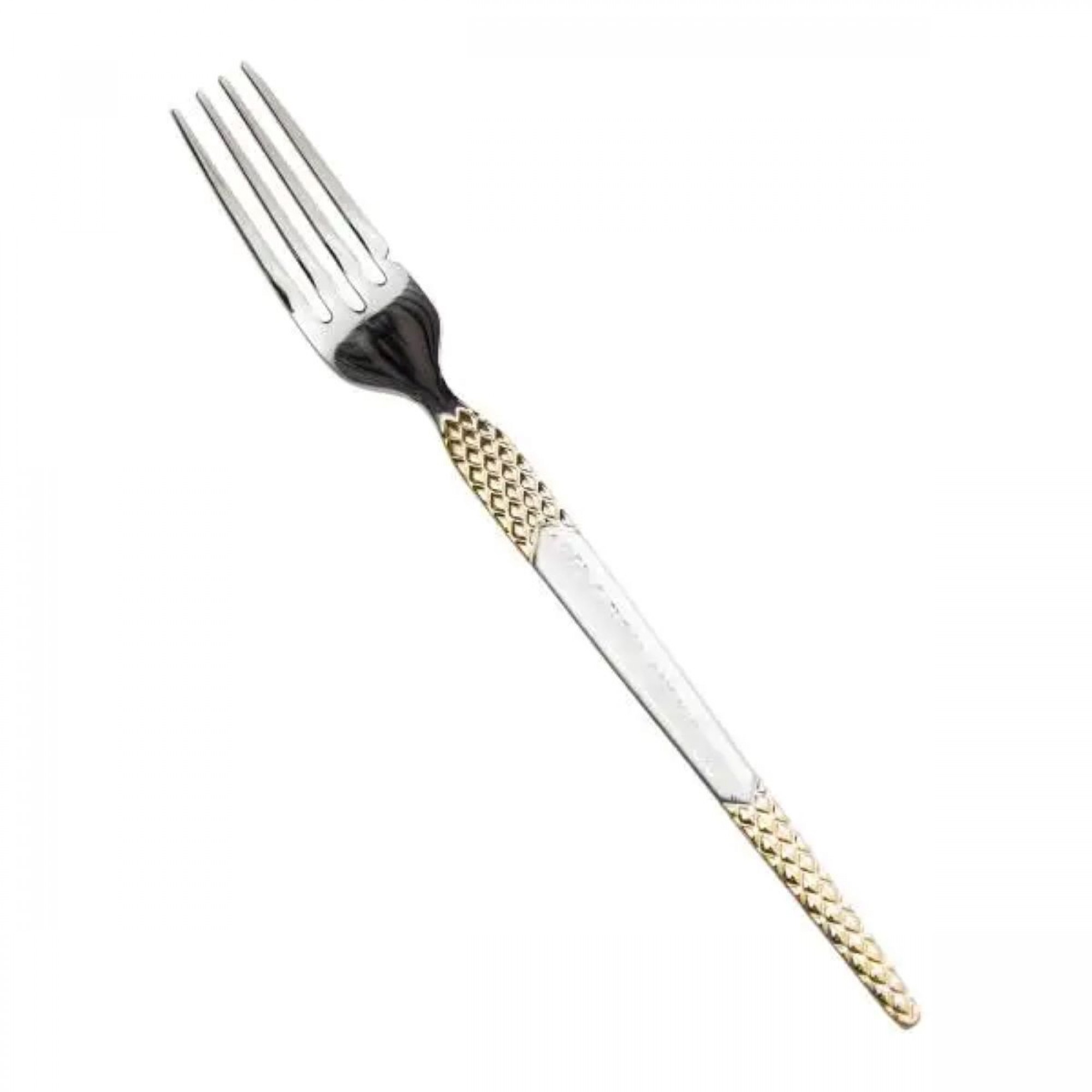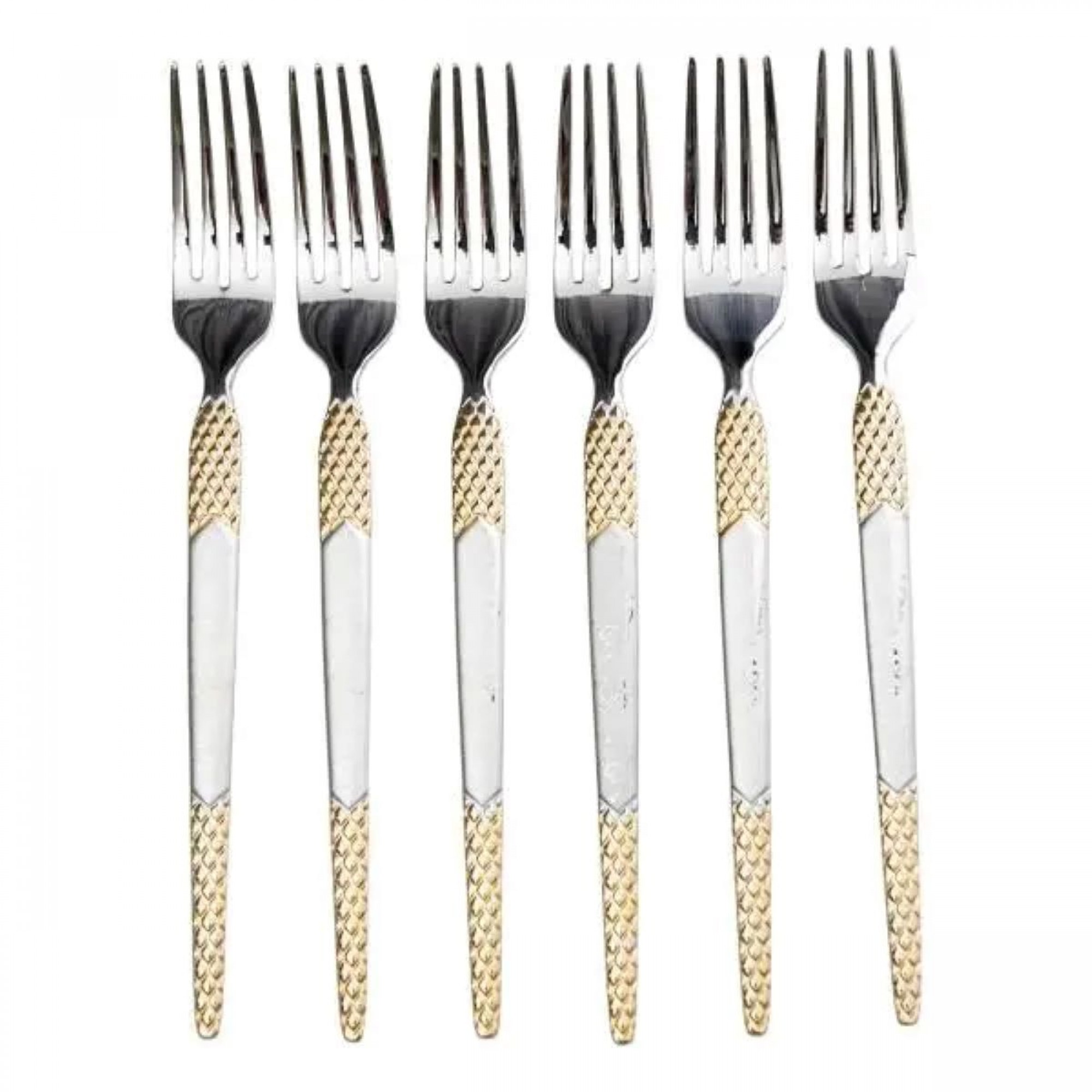 Набір десертних виделок складається з 6 штук, упакованих у зручну блістерну упаковку для захисту під час зберігання і транспортування. Вилки мають сріблясте покриття, що надає їм стильного вигляду, а золотисте оздоблення і витончене гравіювання на ручках додають елегантності та оригінальності кожному виробу. Основні характеристики: Кількість предметів у наборі: 6 шт; Кількість персон: 6; Довжина: 15.5 см; Матеріал: нержавіюча сталь; Упаковка: пакет. Ці виделки ідеально підходять для десертів або легких закусок, забезпечуючи комфорт при використанні завдяки оптимальному розміру та формі. Класичний дизайн підходить для різних стилів сервірування і додає вишуканості будь-якому столу. Для догляду за виробом рекомендується використовувати м'які мийні засоби, що не ушкоджують покриття та гравіювання. Після миття варто витирати виделки досуха, щоб зберегти їхній блиск і продовжити термін служби.