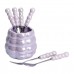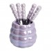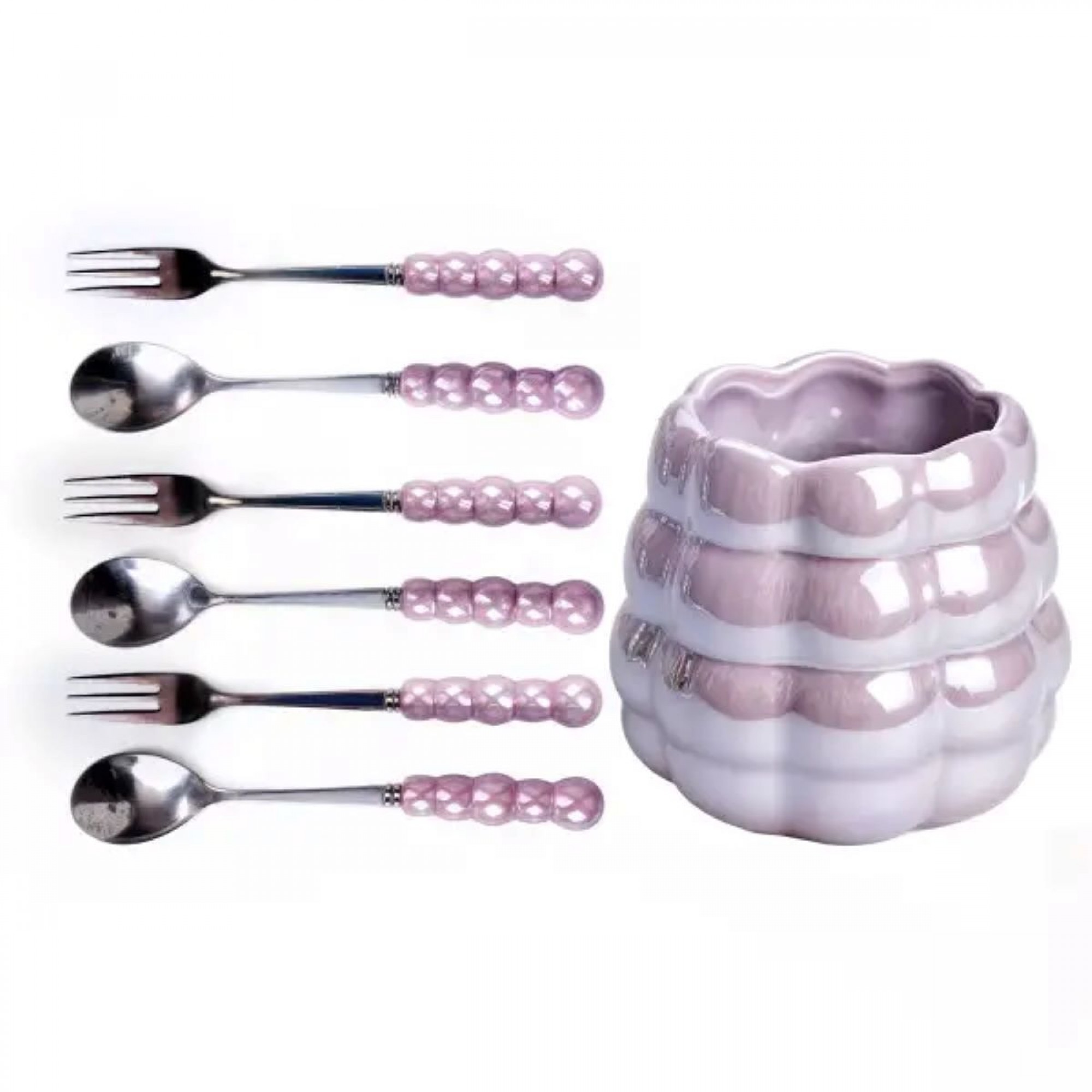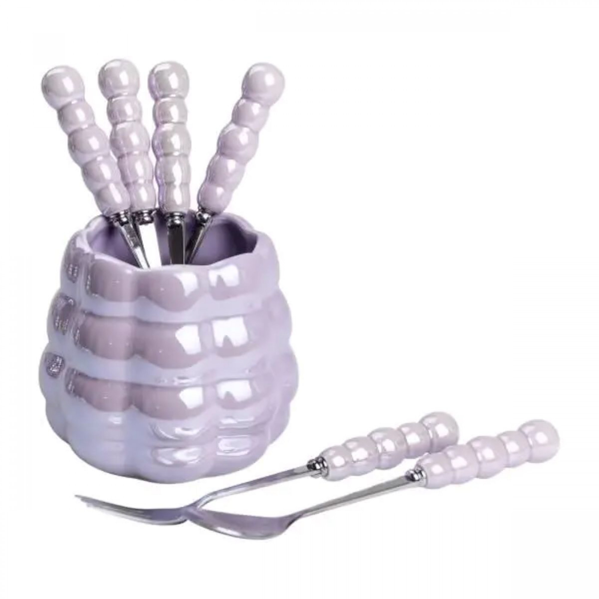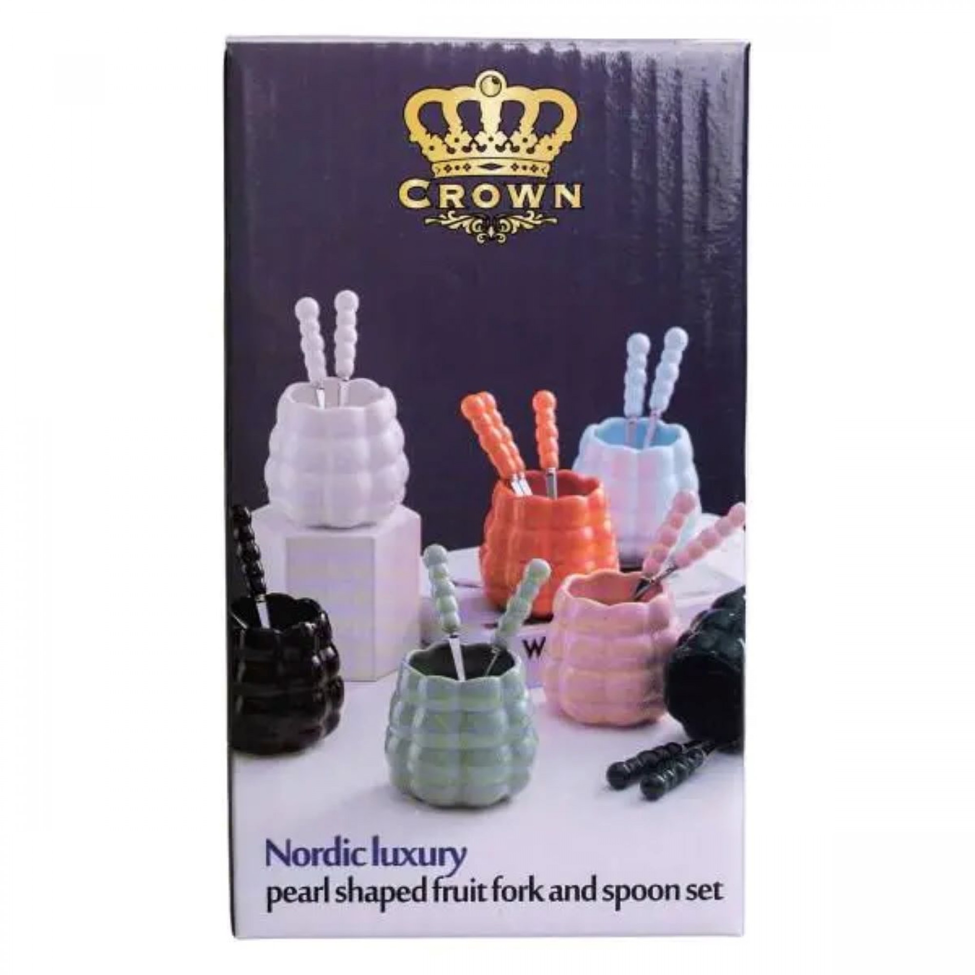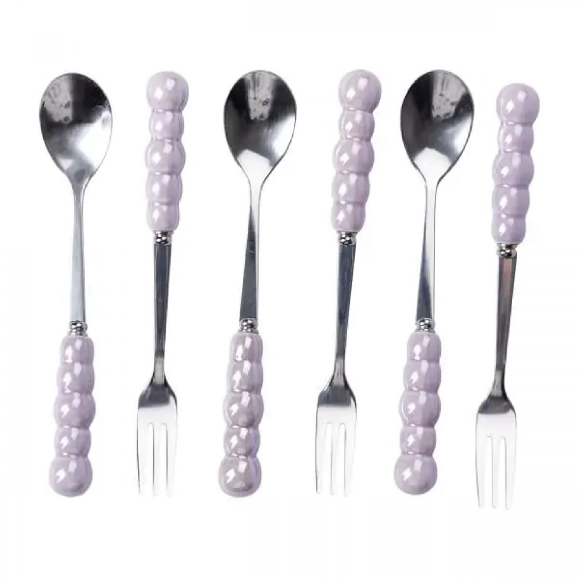 Набір десертних виделок і ложок складається з приладів, виготовлених із неіржавкої сталі, з керамічними ручками, оформленими у вигляді перлин. Поєднання матеріалів забезпечує міцність виробів і естетичний вигляд. Гладка поверхня сталі сприяє зручному використанню та легкому догляду. Основні характеристики: Кількість предметів у наборі: 7 шт; Кількість персон: 3; Матеріал приладів: нержавіюча сталь, кераміка; Матеріал підставки: кераміка; Упаковка: коробка; Розміри: висота підставки: 7 см; довжина десертної ложки: 14.5 см; довжина десертної виделки: 14.5 см. Форма ложок і виделок адаптована для вживання десертів, забезпечуючи комфорт під час трапези. Керамічні ручки мають гладку структуру, що надає приладам характерного зовнішнього вигляду. Конструкція ручок передбачає надійне зчеплення з металевою частиною, що мінімізує ризик пошкоджень під час експлуатації. Набір доповнено керамічною підставкою, яка слугує для зручного зберігання приладів. Підставка відповідає загальному дизайну комплекту і забезпечує організоване розміщення предметів на столі або в зоні сервірування.