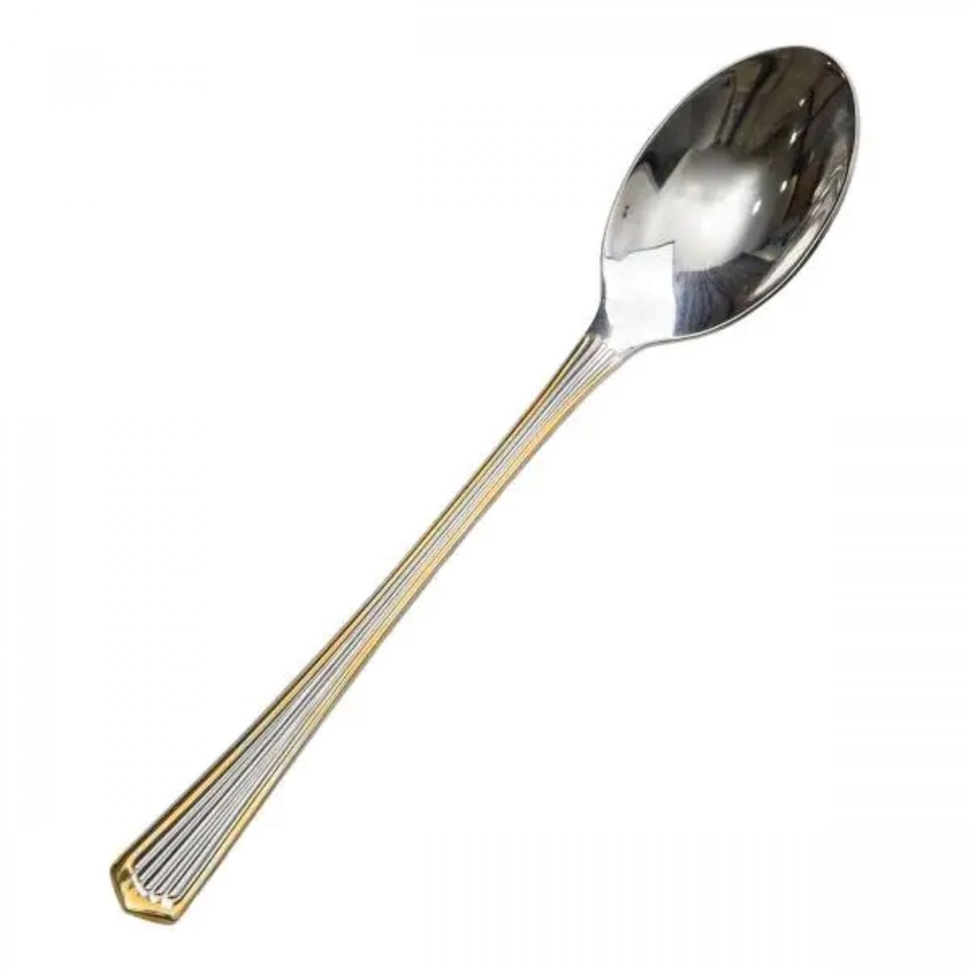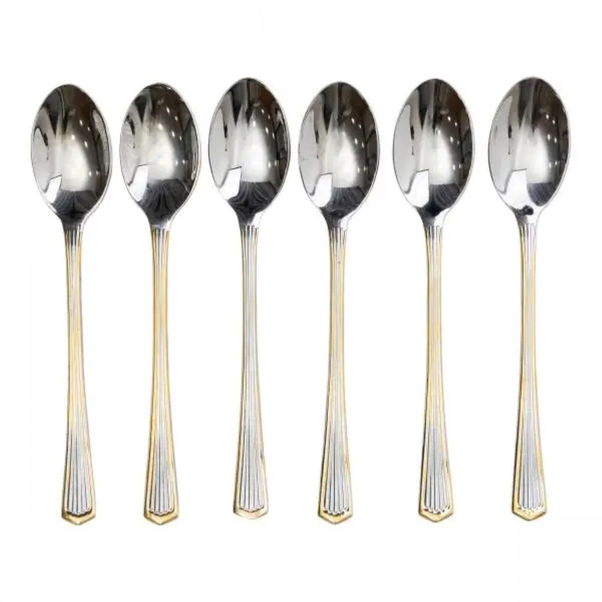 Набір кавових ложок містить 6 штук, упакованих у зручну блістерну упаковку для захисту під час зберігання і транспортування. Ложки виготовлені з високоякісного металу зі сріблястим покриттям, що надає їм стильного вигляду. Ручки прикрашені золотистими елементами, виконаними в класичному стилі, які додають елегантності та витонченості кожній ложці. Основні характеристики: Кількість предметів у наборі: 6 шт; Кількість персон: 6; Довжина: 12.3 см; Матеріал: нержавіюча сталь; Упаковка: пакет. Ці ложки ідеально підходять для кави, еспресо або інших гарячих напоїв, а також можуть використовуватися для десертів. Їхній розмір забезпечує зручність використання і додає стилю до будь-якого столу, підходячи як для повсякденних, так і для святкових подій. Для догляду за виробом рекомендується використовувати м'які мийні засоби, що не пошкоджують покриття. Після миття варто витирати ложки до сухості, щоб зберегти їхній блиск і продовжити термін служби.