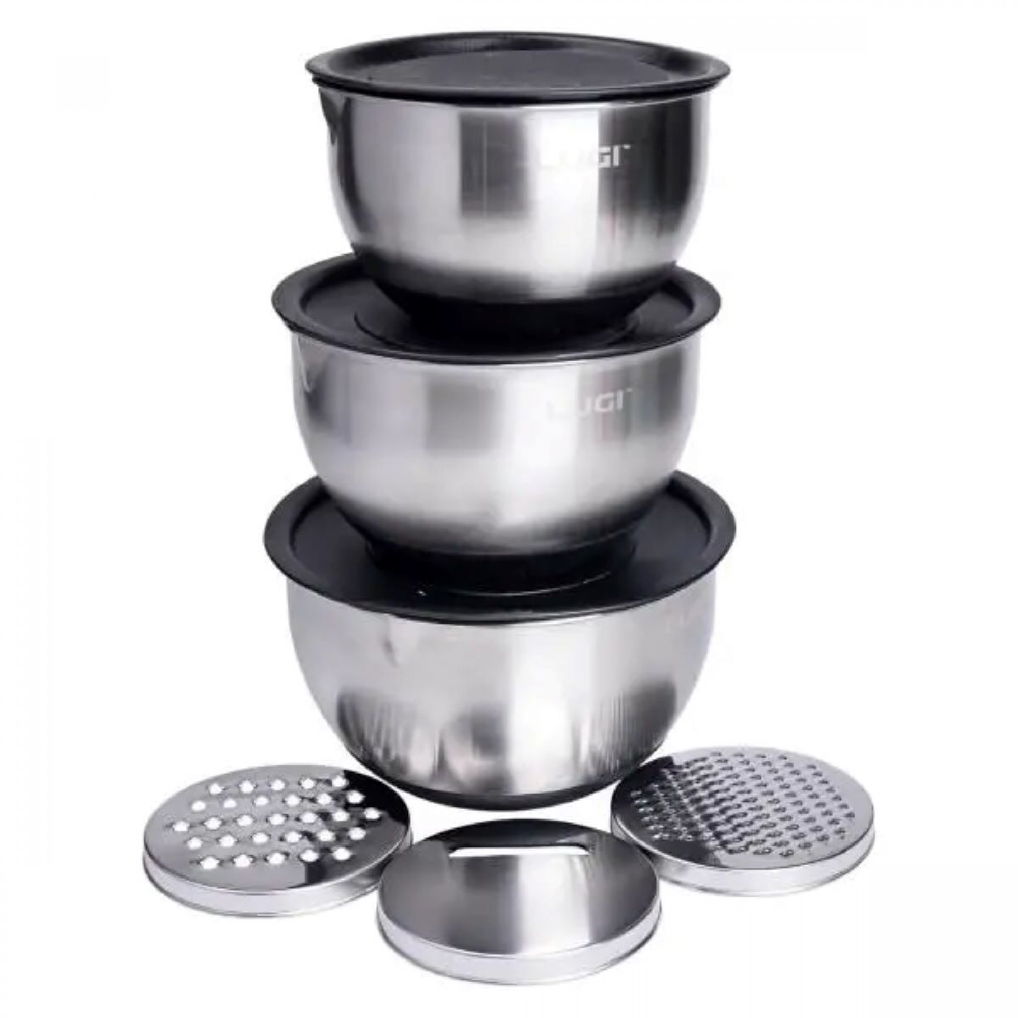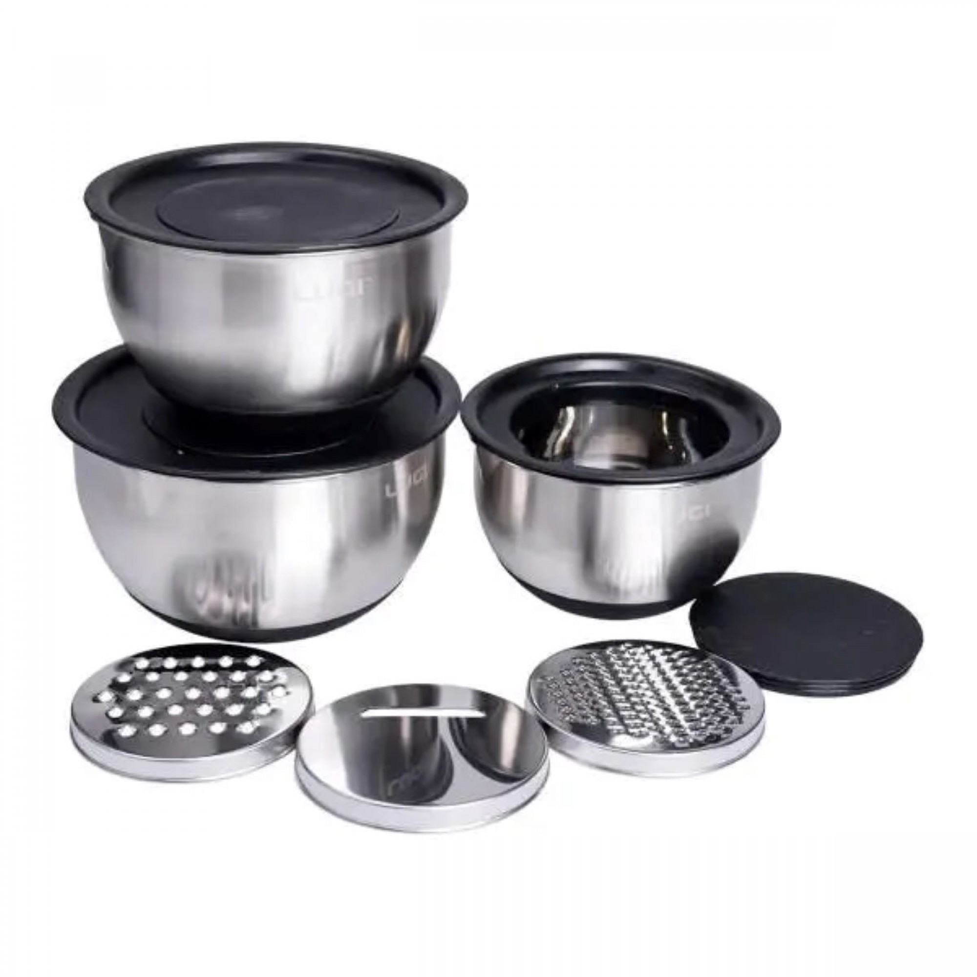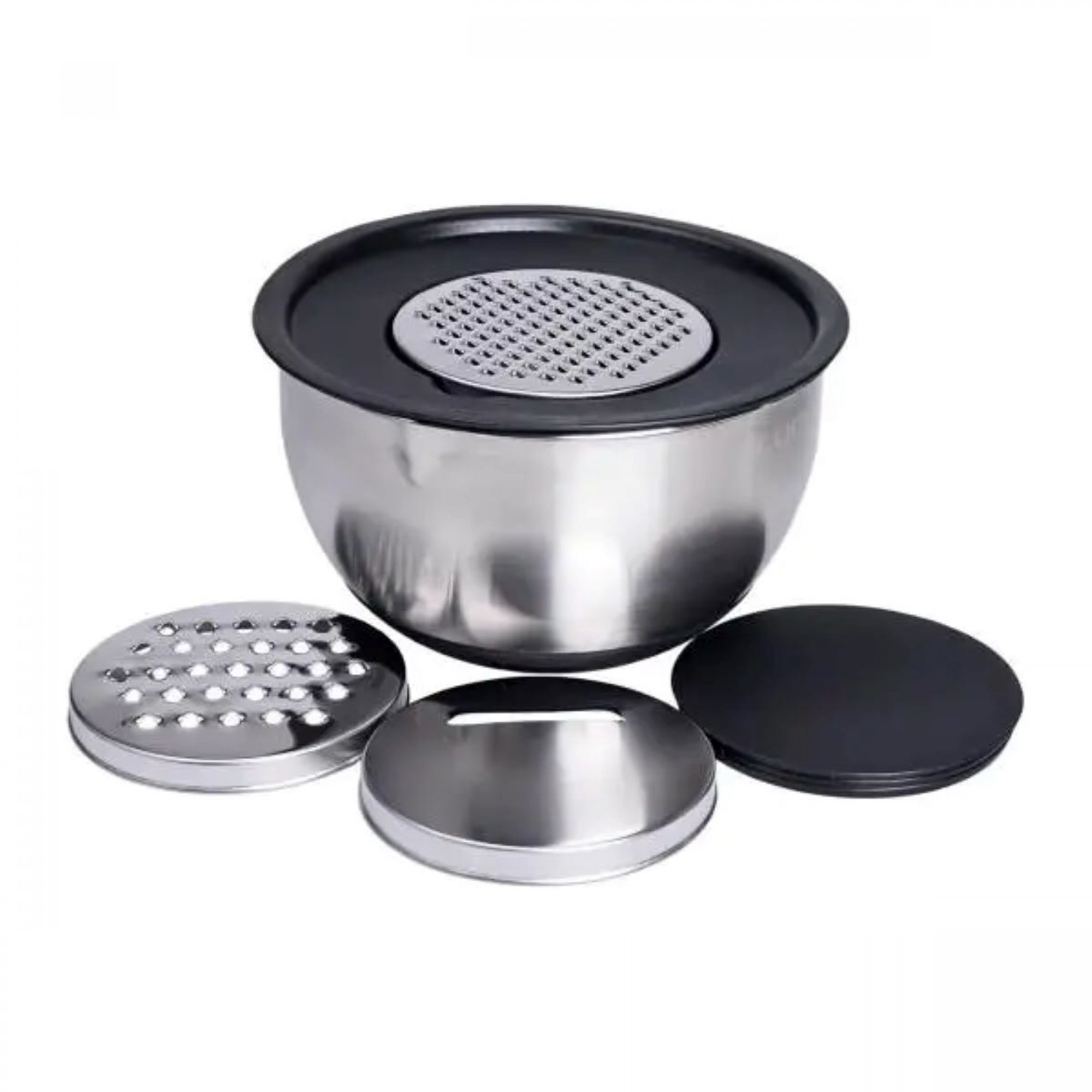 Цей багатофункціональний набір із трьох мисок із неіржавкої сталі з кришками і тертками різного об'єму (2,5 л, 2 л, 1,5 л) стане незамінним помічником на кухні. Він поєднує в собі зручність, практичність і довговічність, даючи змогу готувати, зберігати і подавати страви з максимальним комфортом. Основні характеристики: Кількість предметів: 3 миски + 3 кришки + 3 терки; Об'єм мисок: 2.5 л / 2 л / 1.5 л; Матеріал мисок: нержавіюча сталь; Матеріал терок: нержавіюча сталь; Матеріал кришок: пластик; Верхній діаметр мисок: 16 см / 18 см / 20.5 см; Нижній діаметр: 8 см / 9 см / 10 см; Висота: 10 см / 11 см / 11.5 см. Переваги набору: Висока якість матеріалів - миски виготовлені з міцної нержавіючої сталі, стійкої до корозії, запахів і плям. Герметичні кришки - запобігають потраплянню повітря і зберігають свіжість продуктів на тривалий час. Функціональні терки - в кришці найбільшої чаші передбачено знімний отвір, в який можна вставити одну з трьох змінних терок для швидкого подрібнення продуктів прямо в миску. Компактність і зручність зберігання - миски вкладаються одна в одну, займаючи мінімум місця в шафі. Універсальне застосування - підходять для замішування тіста, приготування салатів, зберігання продуктів, а також подачі страв на стіл. Простота догляду - миски можна мити в посудомийній машині, але кришки і терки рекомендується мити вручну, щоб уникнути деформації. Цей набір стане чудовим вибором як для домашнього використання, так і для професійної кухні. Він забезпечить зручність і швидкість приготування страв, даючи змогу економити час і сили.