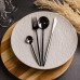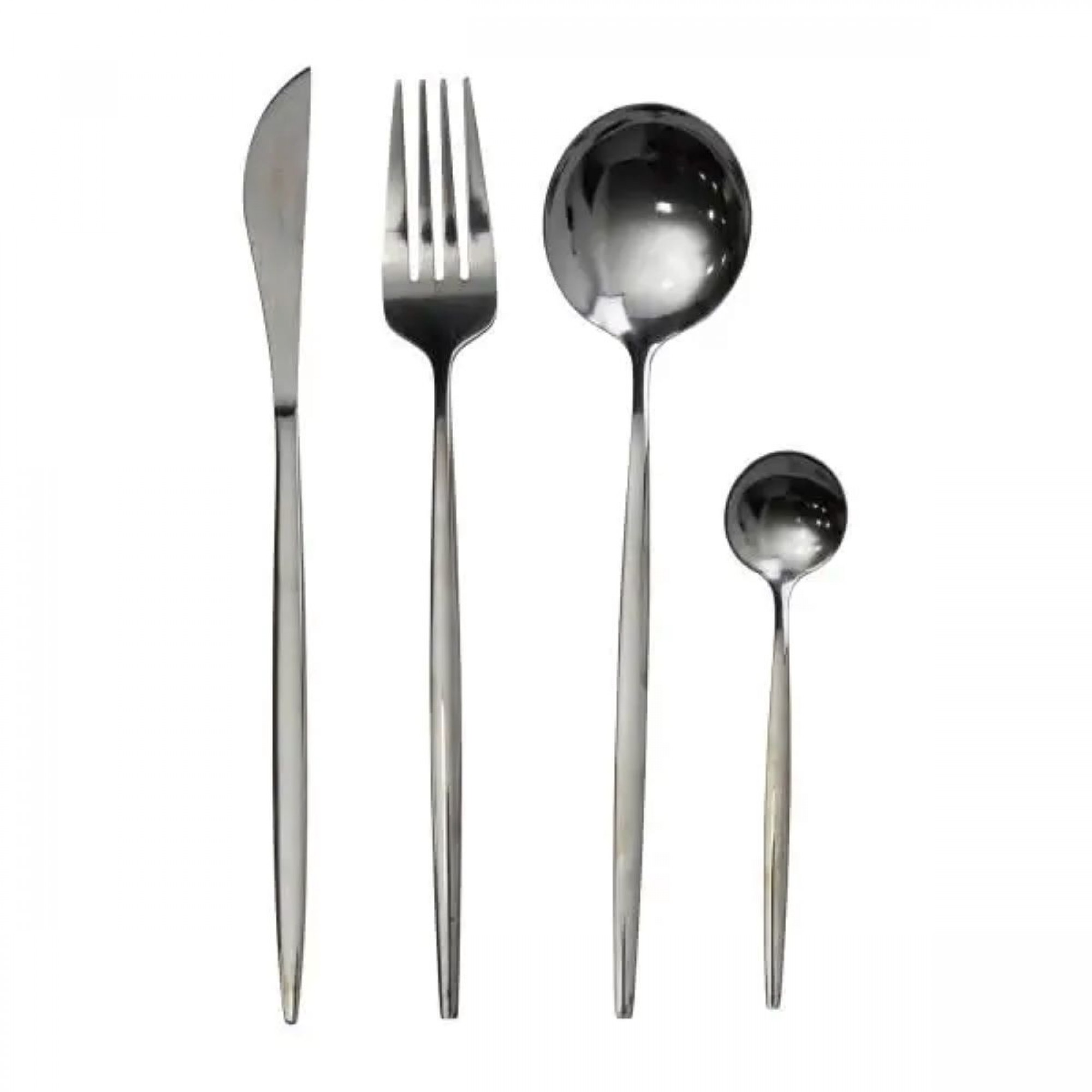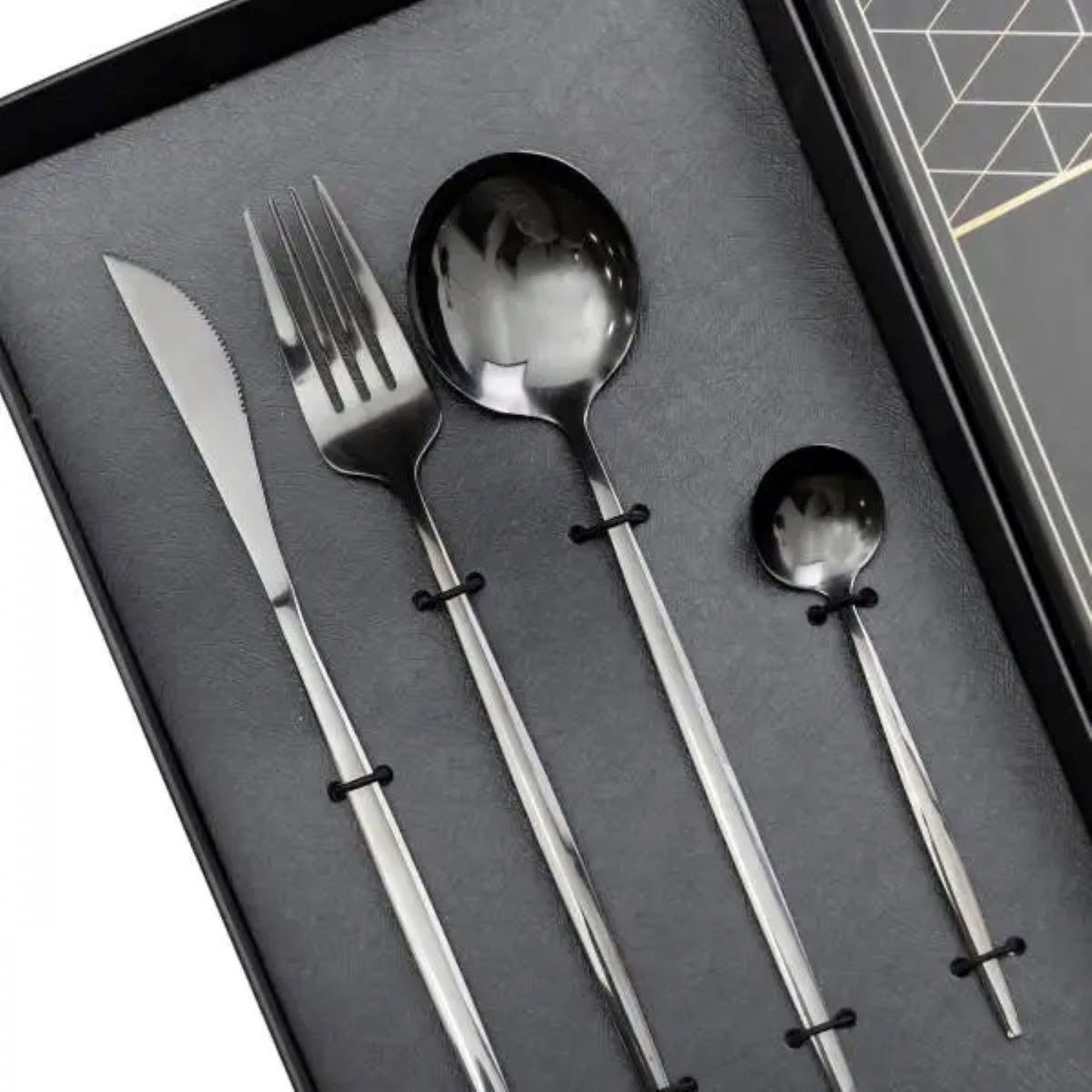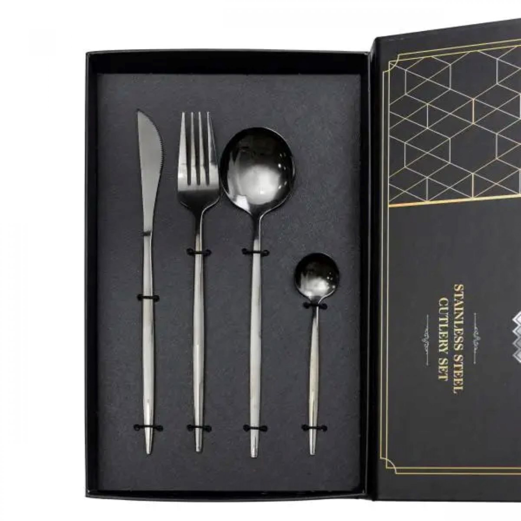 Набір столових приборів містить 24 предмети, призначені для обслуговування 6 персон. До комплекту входять 6 столових ложок, 6 чайних ложок, 6 виделок і 6 столових ножів. Основна частина приладів має золотистий відтінок, а ручки виконані в чорному кольорі, що створює контрастний і стриманий вигляд. Основні характеристики: Кількість предметів у наборі: 24 шт; Кількість персон: 6; Матеріал: нержавіюча сталь; Упаковка: коробка; Розміри приладів: довжина столового ножа: 22.5 см; довжина столової ложки: 20.8 см; довжина столової виделки: 21.5 см; довжина чайної ложки: 12.8 см. Комплектація набору: столовий ніж: 6 шт; столова ложка: 6 шт; столова виделка: 6 шт; чайна ложка: 6 шт. Матеріалом виготовлення є нержавіюча сталь, яка забезпечує стійкість до корозії та механічних пошкоджень. Поверхня гладенька, що полегшує очищення та догляд. Чорні ручки мають ергономічну форму, що сприяє зручному захопленню та комфортному використанню. Комплект підходить як для щоденного застосування, так і для сервірування святкового столу. Завдяки поєднанню золотистої сталі з чорними ручками, прилади гармонійно вписуються в сучасний інтер'єр кухні та можуть комбінуватися з різними видами посуду.