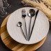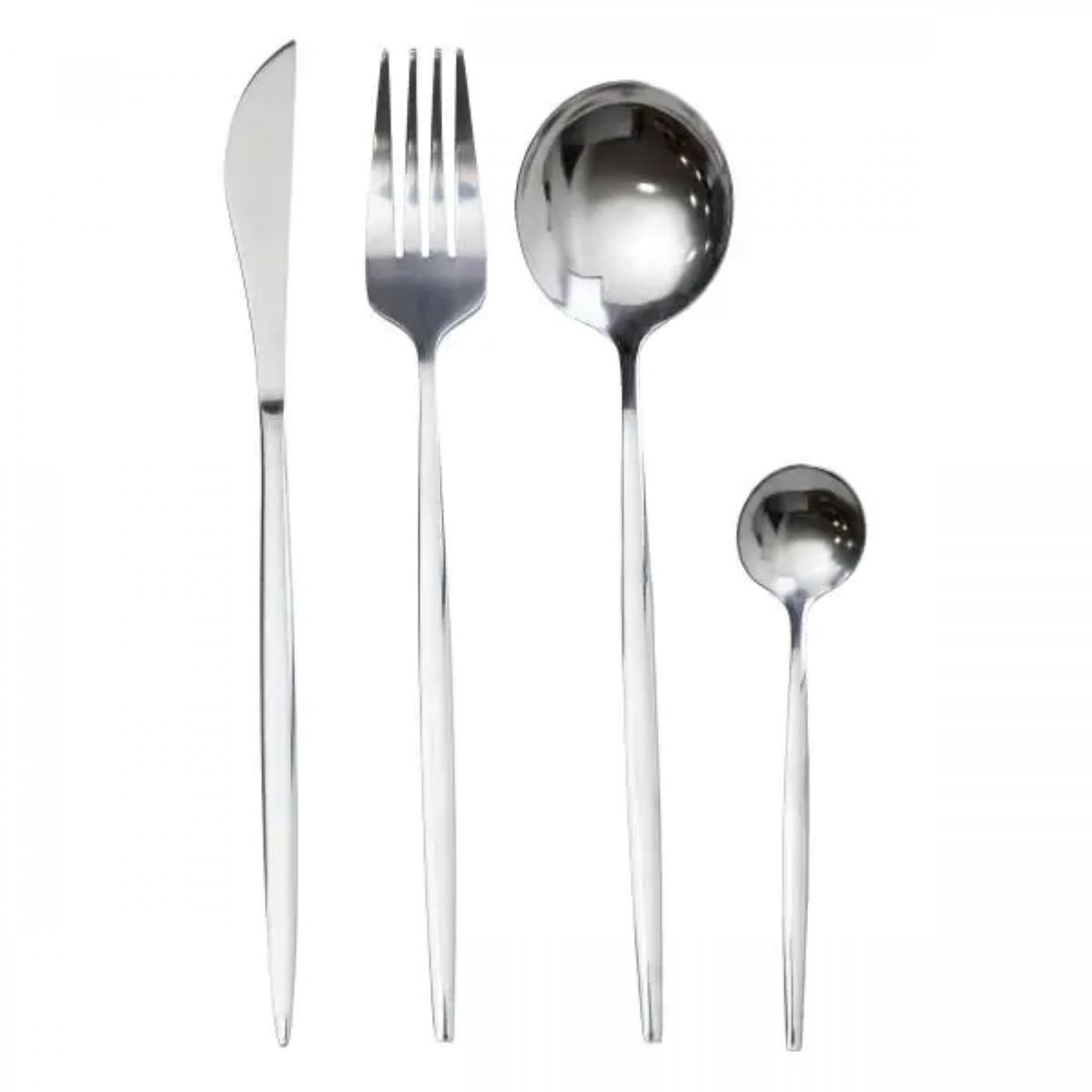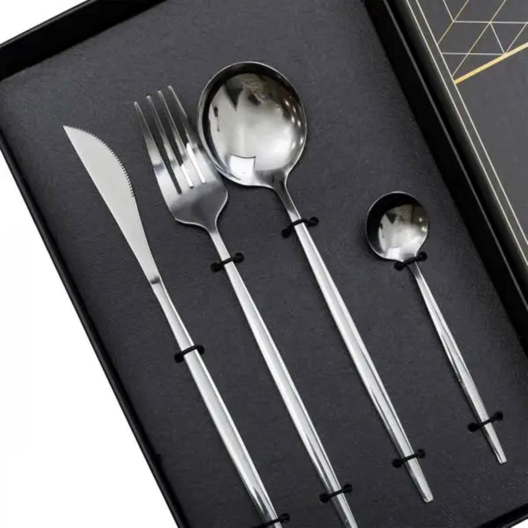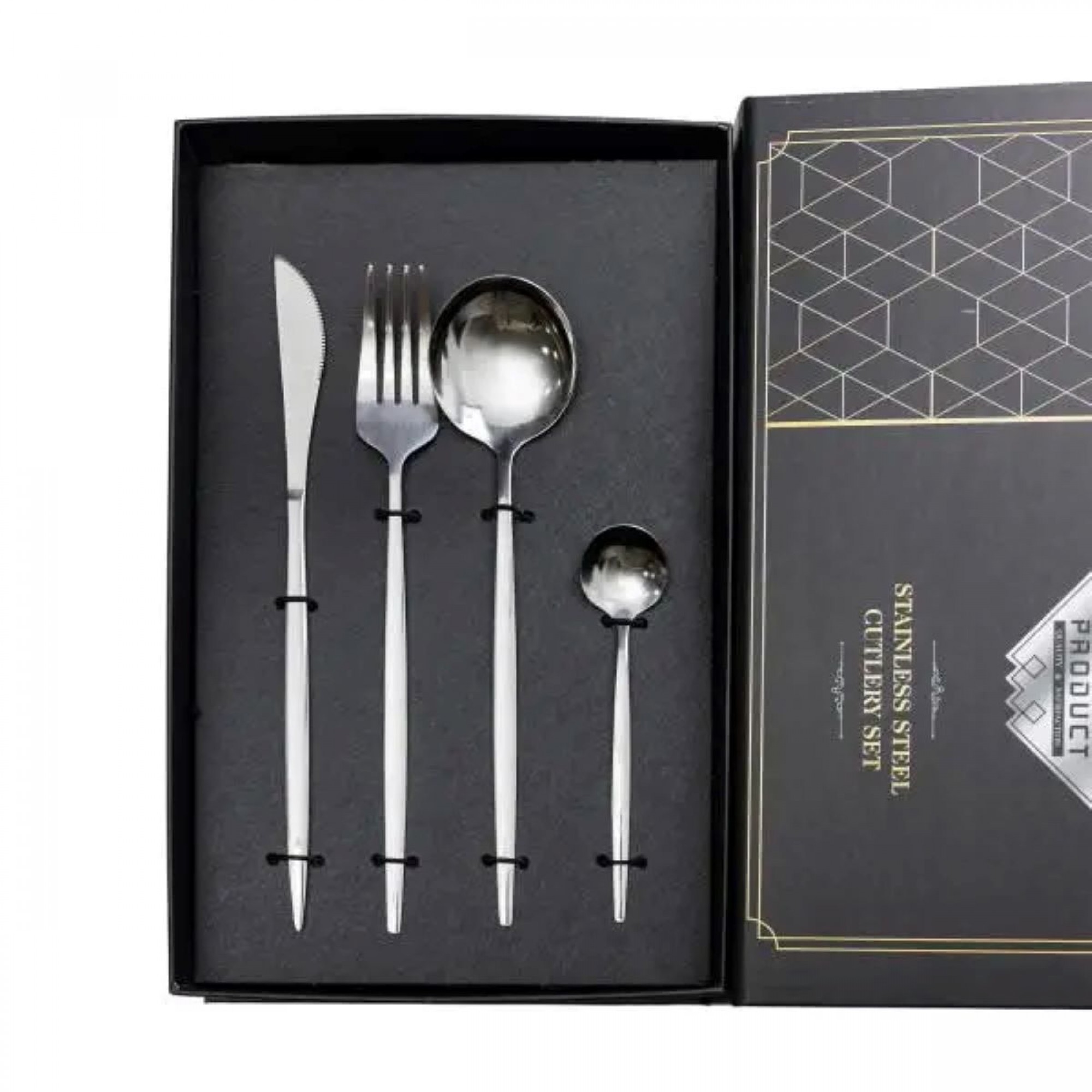 Набір столових приборів містить 24 предмети, призначені для обслуговування 6 персон. До комплекту входять 6 столових ложок, 6 чайних ложок, 6 виделок і 6 столових ножів. Основна частина приладів має золотистий відтінок, а ручки виконані в чорному кольорі, що створює контрастний і стриманий вигляд. Основні характеристики: Кількість предметів у наборі: 24 шт; Кількість персон: 6; Матеріал: нержавіюча сталь; Упаковка: коробка; Розміри приладів: довжина столового ножа: 22.5 см; довжина столової ложки: 20.8 см; довжина столової виделки: 21.5 см; довжина чайної ложки: 12.8 см. Комплектація набору: столовий ніж: 6 шт; столова ложка: 6 шт; столова виделка: 6 шт; чайна ложка: 6 шт. Матеріалом виготовлення є нержавіюча сталь, яка забезпечує стійкість до корозії та механічних пошкоджень. Поверхня гладенька, що полегшує очищення та догляд. Чорні ручки мають ергономічну форму, що сприяє зручному захопленню та комфортному використанню. Комплект підходить як для щоденного застосування, так і для сервірування святкового столу. Завдяки поєднанню золотистої сталі з чорними ручками, прилади гармонійно вписуються в сучасний інтер'єр кухні та можуть комбінуватися з різними видами посуду.