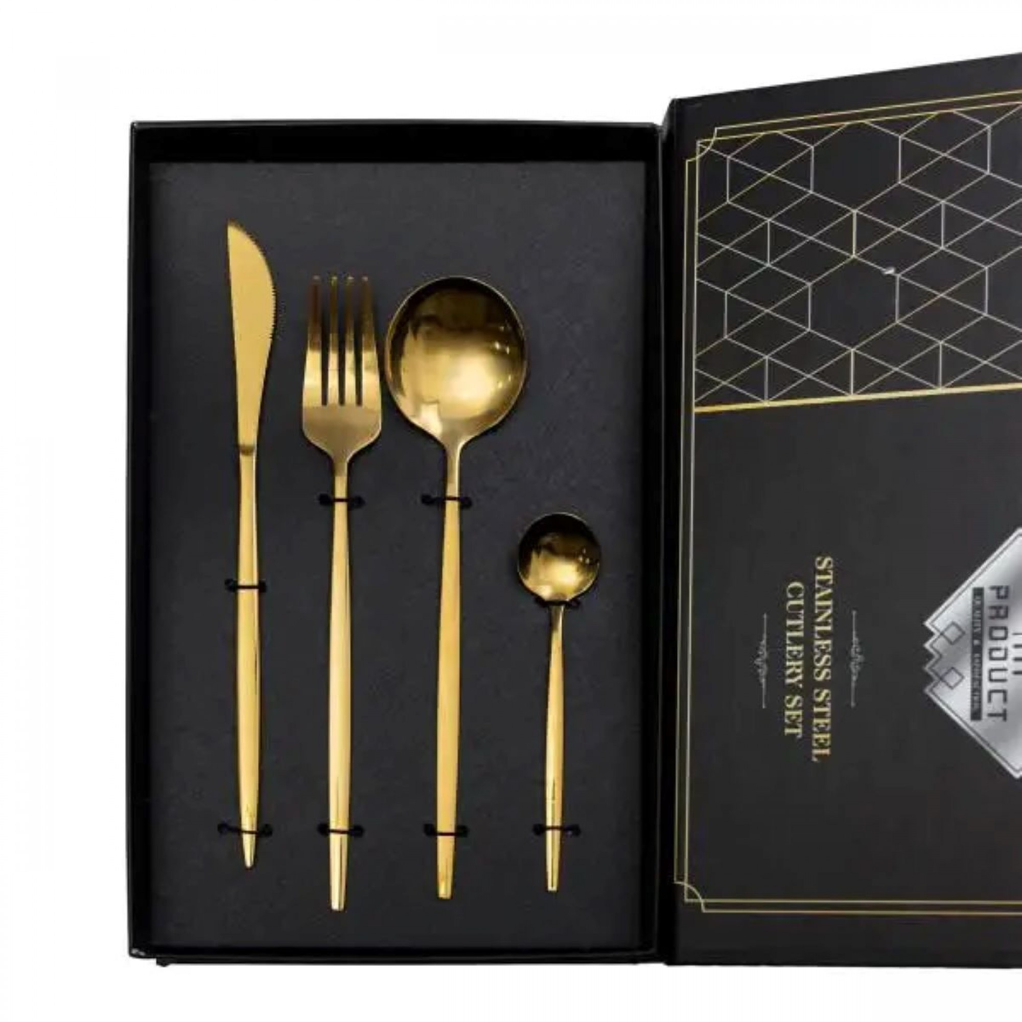 Набір столових приборів містить 24 предмети, призначені для обслуговування 6 персон. До комплекту входять 6 столових ложок, 6 чайних ложок, 6 виделок і 6 столових ножів. Основна частина приладів має золотистий відтінок, а ручки виконані в чорному кольорі, що створює контрастний і стриманий вигляд. Основні характеристики: Кількість предметів у наборі: 24 шт; Кількість персон: 6; Матеріал: нержавіюча сталь; Упаковка: коробка; Розміри приладів: довжина столового ножа: 22.5 см; довжина столової ложки: 20.8 см; довжина столової виделки: 21.5 см; довжина чайної ложки: 12.8 см. Комплектація набору: столовий ніж: 6 шт; столова ложка: 6 шт; столова виделка: 6 шт; чайна ложка: 6 шт. Матеріалом виготовлення є нержавіюча сталь, яка забезпечує стійкість до корозії та механічних пошкоджень. Поверхня гладенька, що полегшує очищення та догляд. Чорні ручки мають ергономічну форму, що сприяє зручному захопленню та комфортному використанню. Комплект підходить як для щоденного застосування, так і для сервірування святкового столу. Завдяки поєднанню золотистої сталі з чорними ручками, прилади гармонійно вписуються в сучасний інтер'єр кухні та можуть комбінуватися з різними видами посуду.