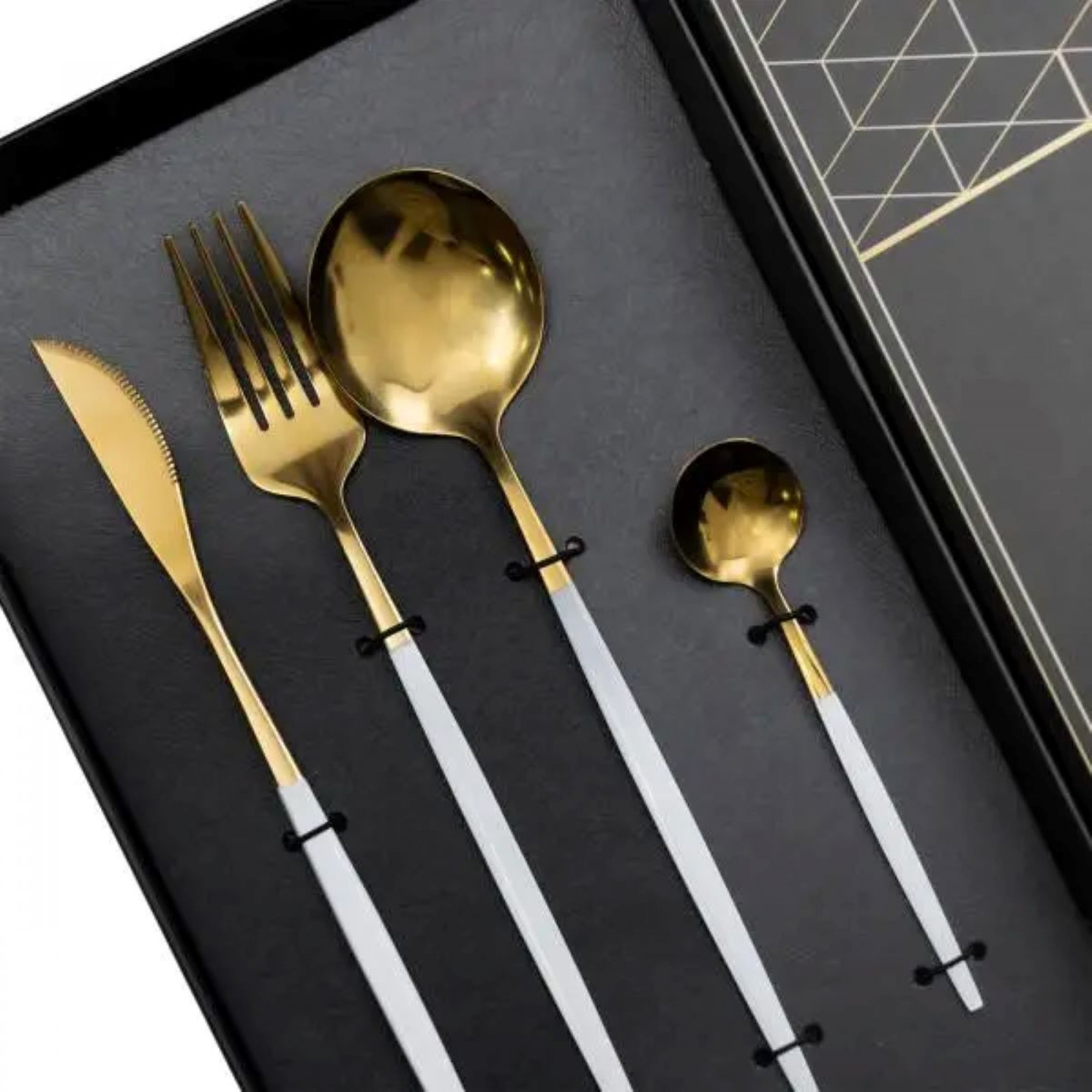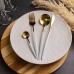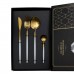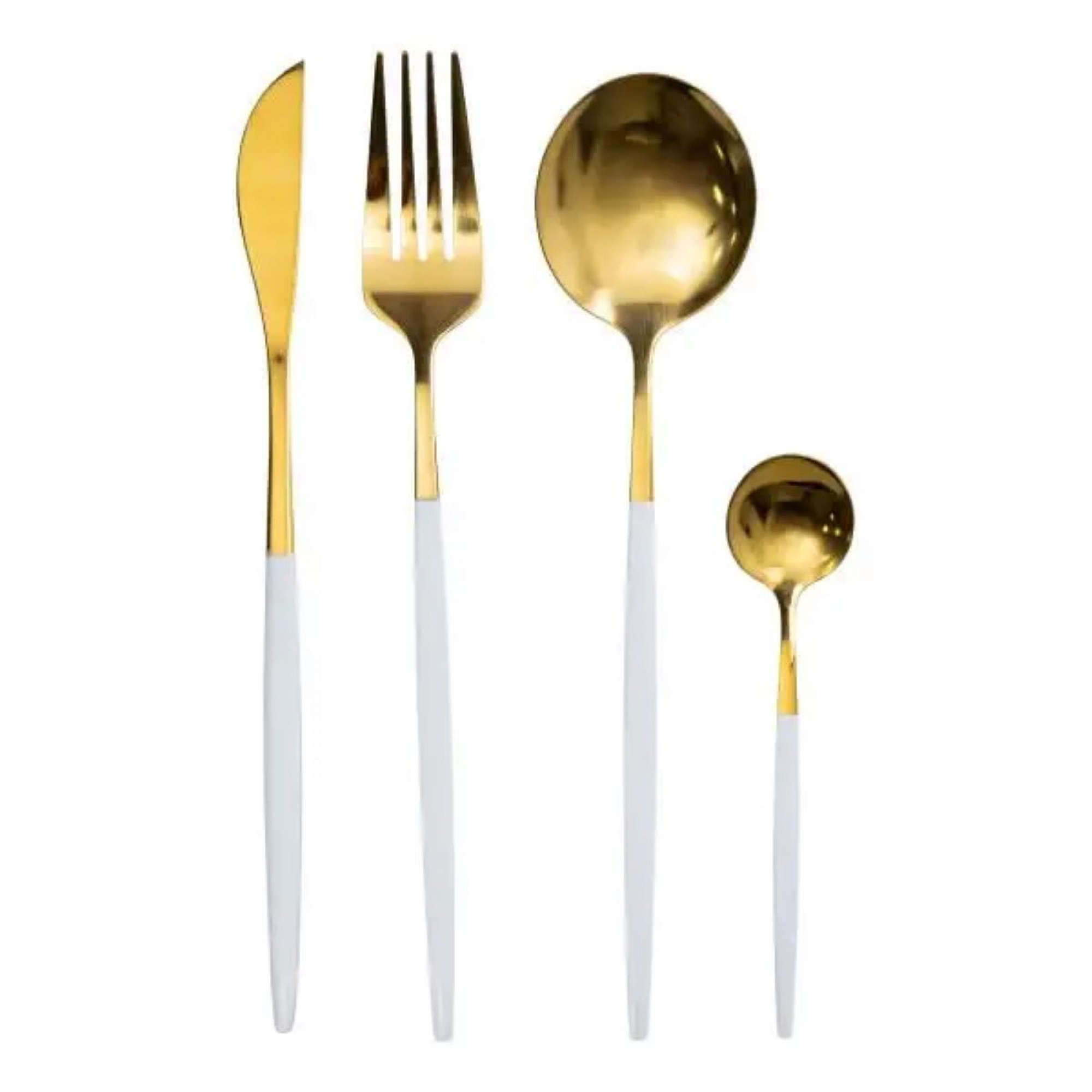 Набір столових приборів містить 24 предмети, призначені для обслуговування 6 персон. До комплекту входять 6 столових ложок, 6 чайних ложок, 6 виделок і 6 столових ножів. Основна частина приладів має золотистий відтінок, а ручки виконані в білому кольорі, що створює контрастний і стриманий вигляд. Основні характеристики: Кількість предметів у наборі: 24 шт; Кількість персон: 6; Матеріал: нержавіюча сталь; Упаковка: коробка; Розміри приладів: довжина столового ножа: 22.5 см; довжина столової ложки: 20.8 см; довжина столової виделки: 21.5 см; довжина чайної ложки: 12.8 см. Комплектація набору: столовий ніж: 6 шт; столова ложка: 6 шт; столова виделка: 6 шт; чайна ложка: 6 шт. Матеріалом виготовлення є нержавіюча сталь, яка забезпечує стійкість до корозії та механічних пошкоджень. Поверхня гладенька, що полегшує очищення та догляд. Білі ручки мають ергономічну форму, що сприяє зручному захопленню та комфортному використанню. Комплект підходить як для щоденного застосування, так і для сервірування святкового столу. Завдяки поєднанню золотистої сталі з білими ручками, прилади гармонійно вписуються в сучасний інтер'єр кухні та можуть комбінуватися з різними видами посуду.