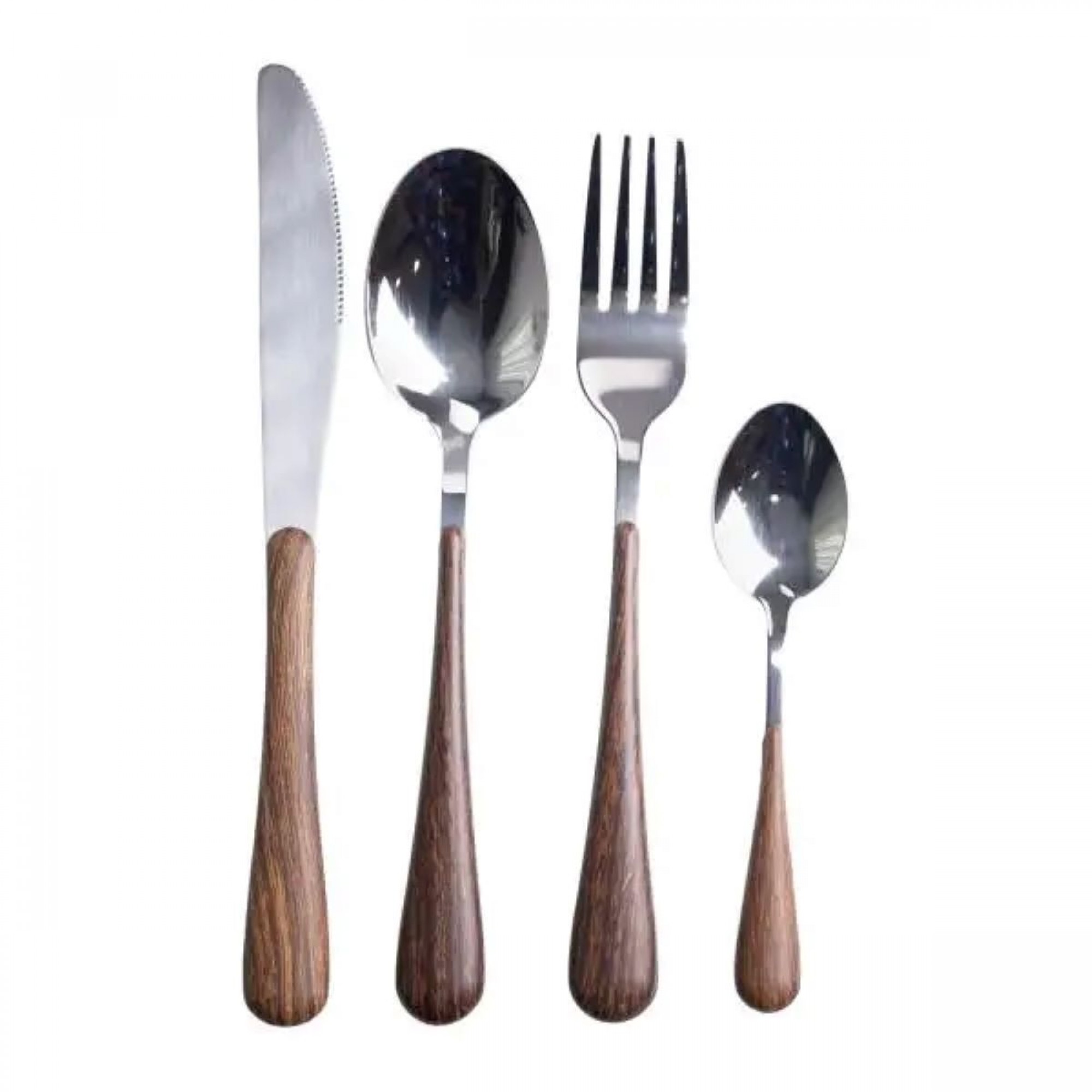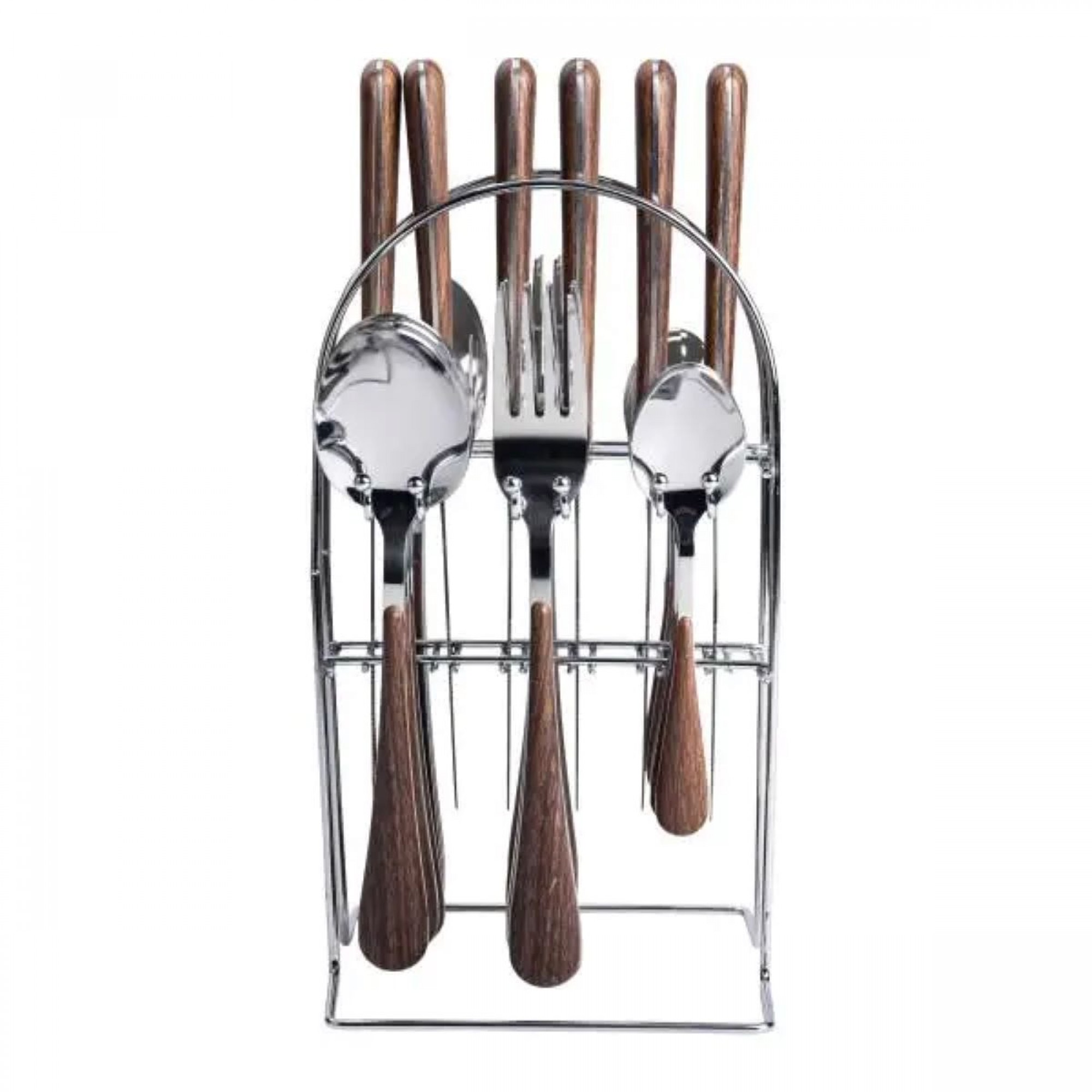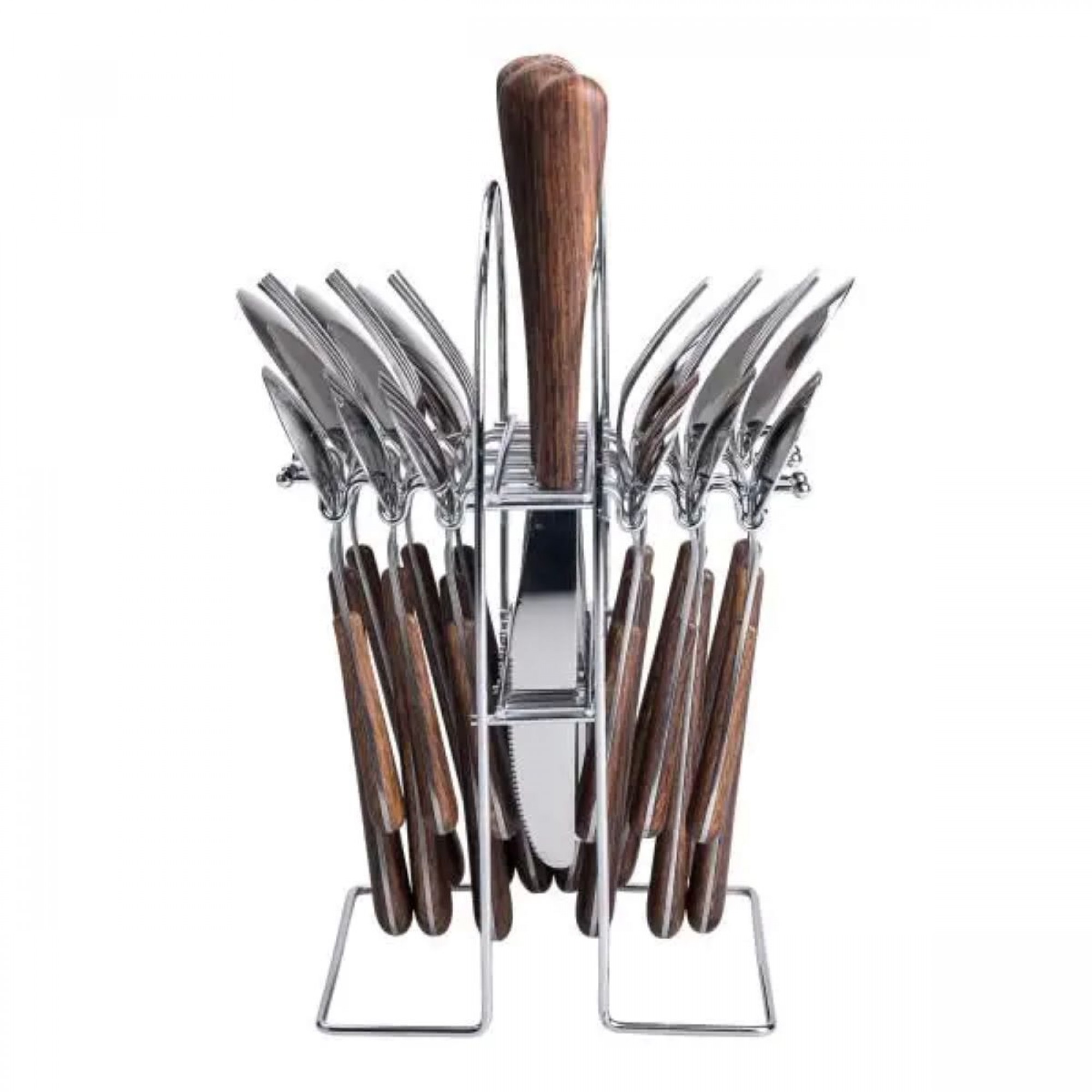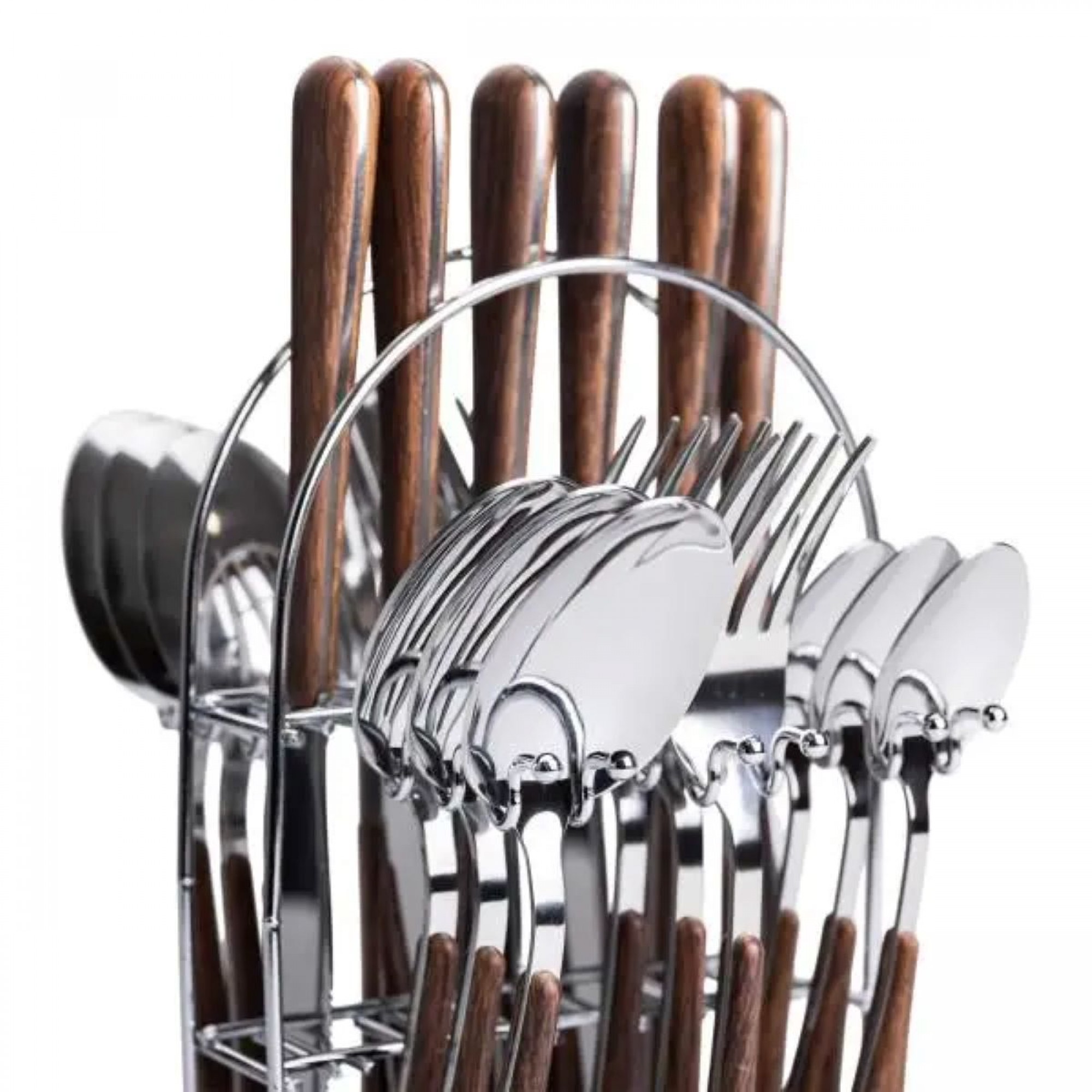 Набір столових приборів на 6 персон з дерев'яними ручками на підставці столові прибори 24 шт Срібло HP-20-1