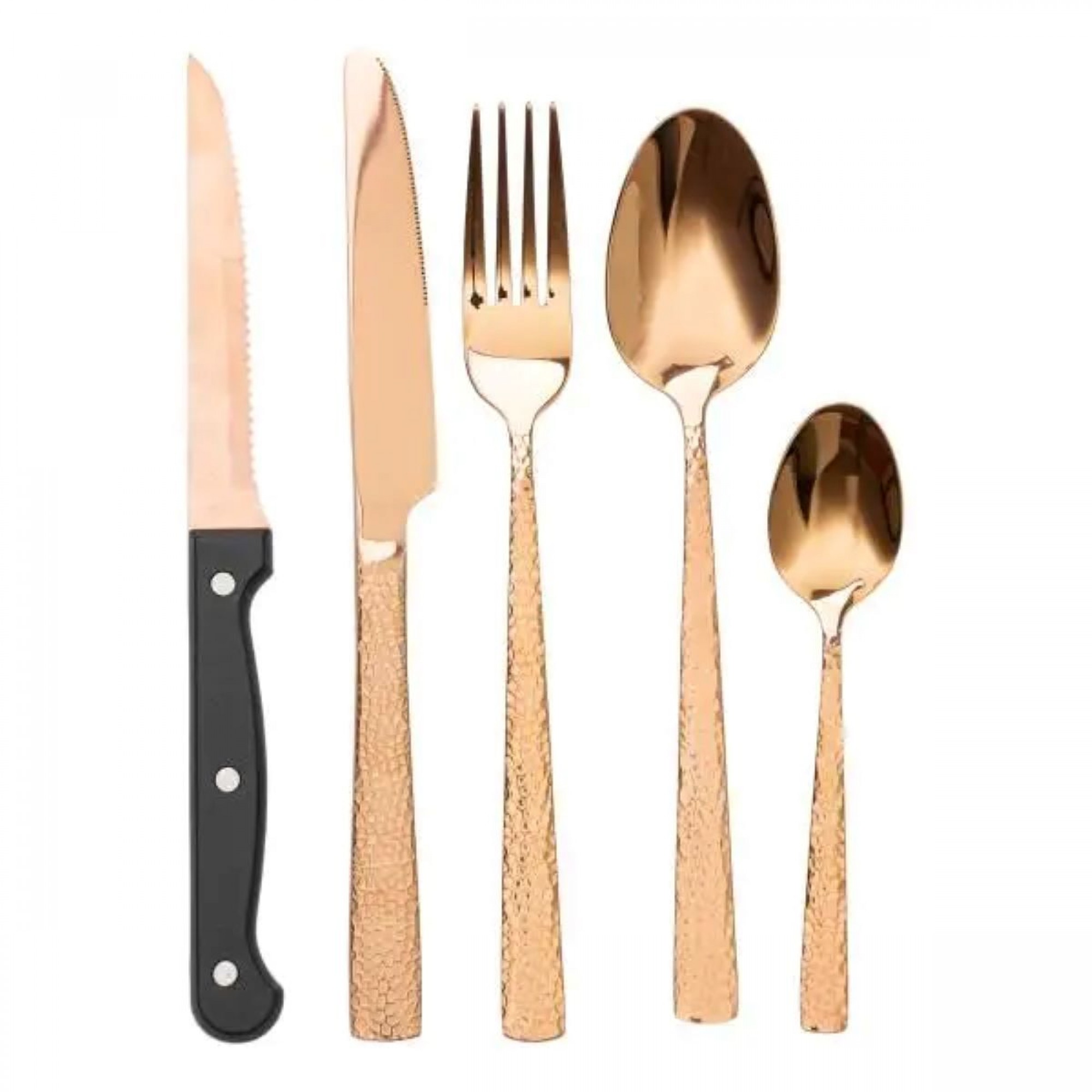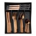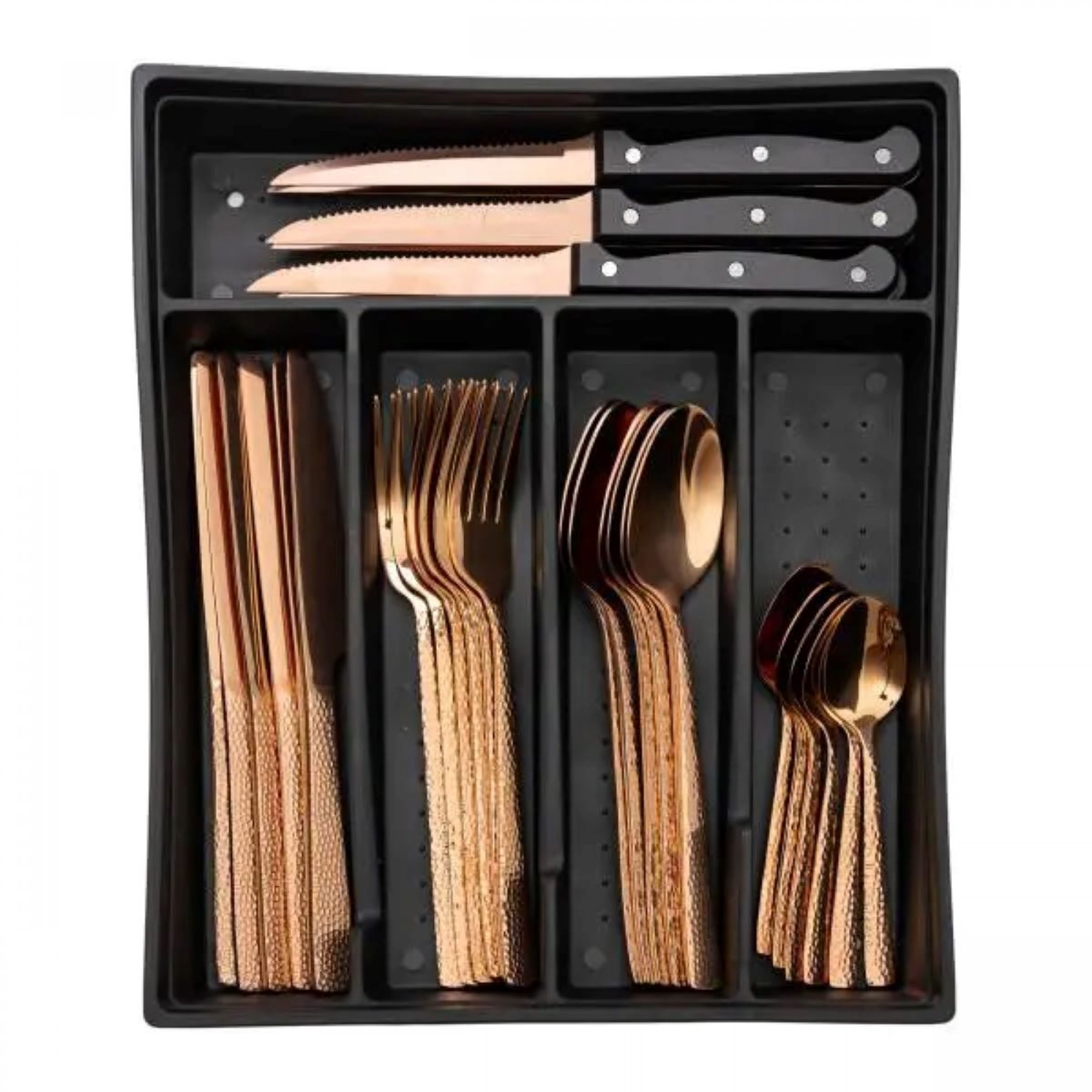 Набір столових приборів у футлярі розрахований на 6 персон і містить 30 предметів: 6 столових ложок, 6 чайних ложок, 6 виделок, 6 столових ножів і 6 ножів для стейків. Комплект забезпечує повний набір необхідних приладів для сервірування столу, включно зі спеціальними ножами для зручної нарізки м'яса. Завдяки зручному футляру всі предмети зберігаються в одному місці, що допомагає підтримувати порядок і захищає їх від пошкоджень. Основні характеристики: Кількість предметів у наборі: 30 шт; Кількість персон: 6; Матеріал: нержавіюча сталь; Упаковка: коробка; Розміри приладів: довжина столового ножа: 23 см; довжина ножа для стейків: 23 см; довжина столової ложки: 20.5 см; довжина столової виделки: 21 см; довжина чайної ложки: 14 см. Комплектація набору: столовий ніж: 6 шт; ніж для стейків: 6 шт; столова ложка: 6 шт; столова виделка: 6 шт; чайна ложка: 6 шт. Прилади виготовлені з неіржавкої сталі, що забезпечує міцність, стійкість до корозії та довговічність. Полірована поверхня надає їм привабливого вигляду і полегшує очищення. Ергономічна форма забезпечує зручний хват, а ножі для стейків мають загострені леза для легкого розрізання м'ясних страв. Комплект ідеально підходить як для щоденного використання, так і для особливих випадків. Футляр робить його зручним для зберігання і транспортування, що може бути корисним для виїздів або подарункових наборів. Усі предмети легко миються вручну або в посудомийній машині, зберігаючи свій вигляд і функціональність.