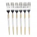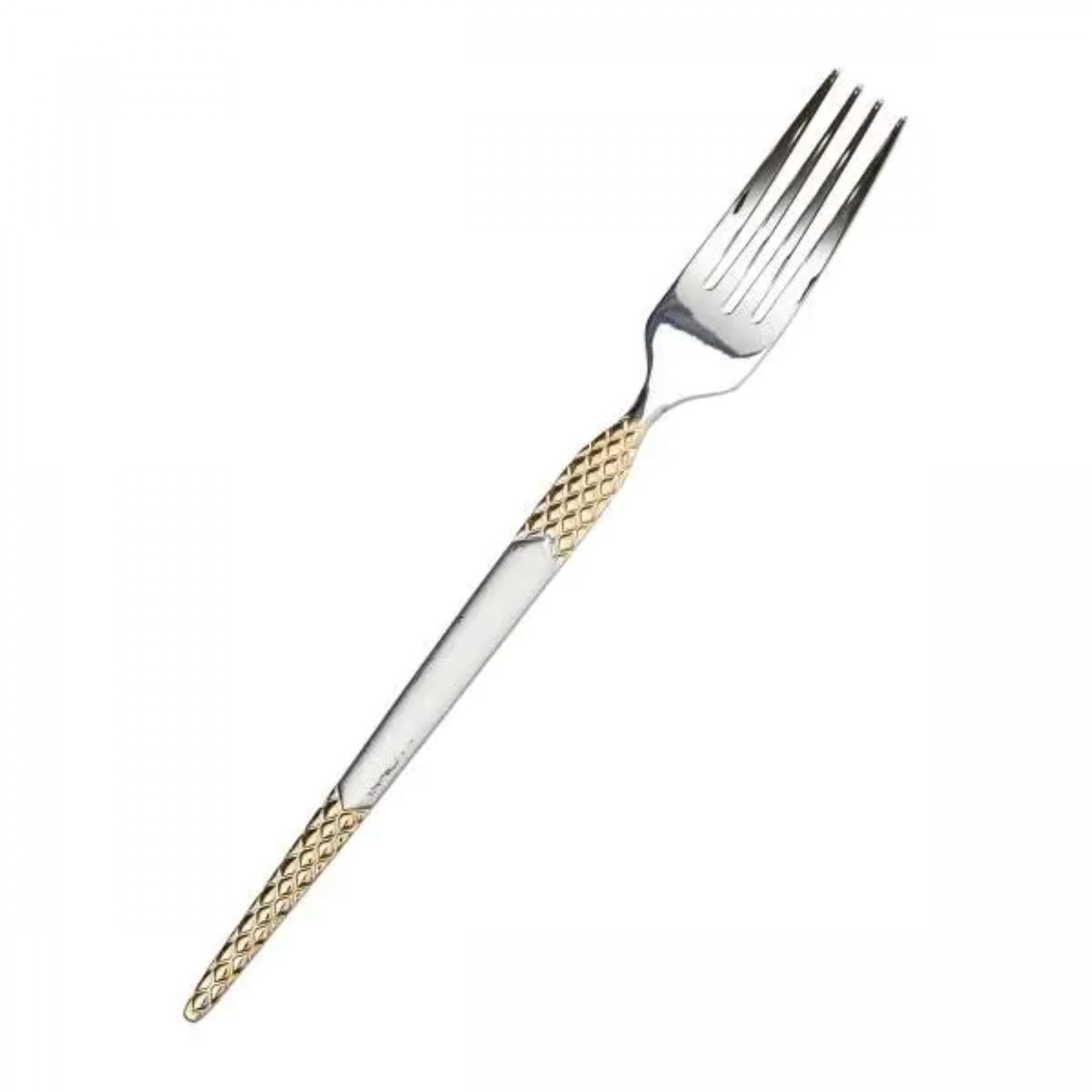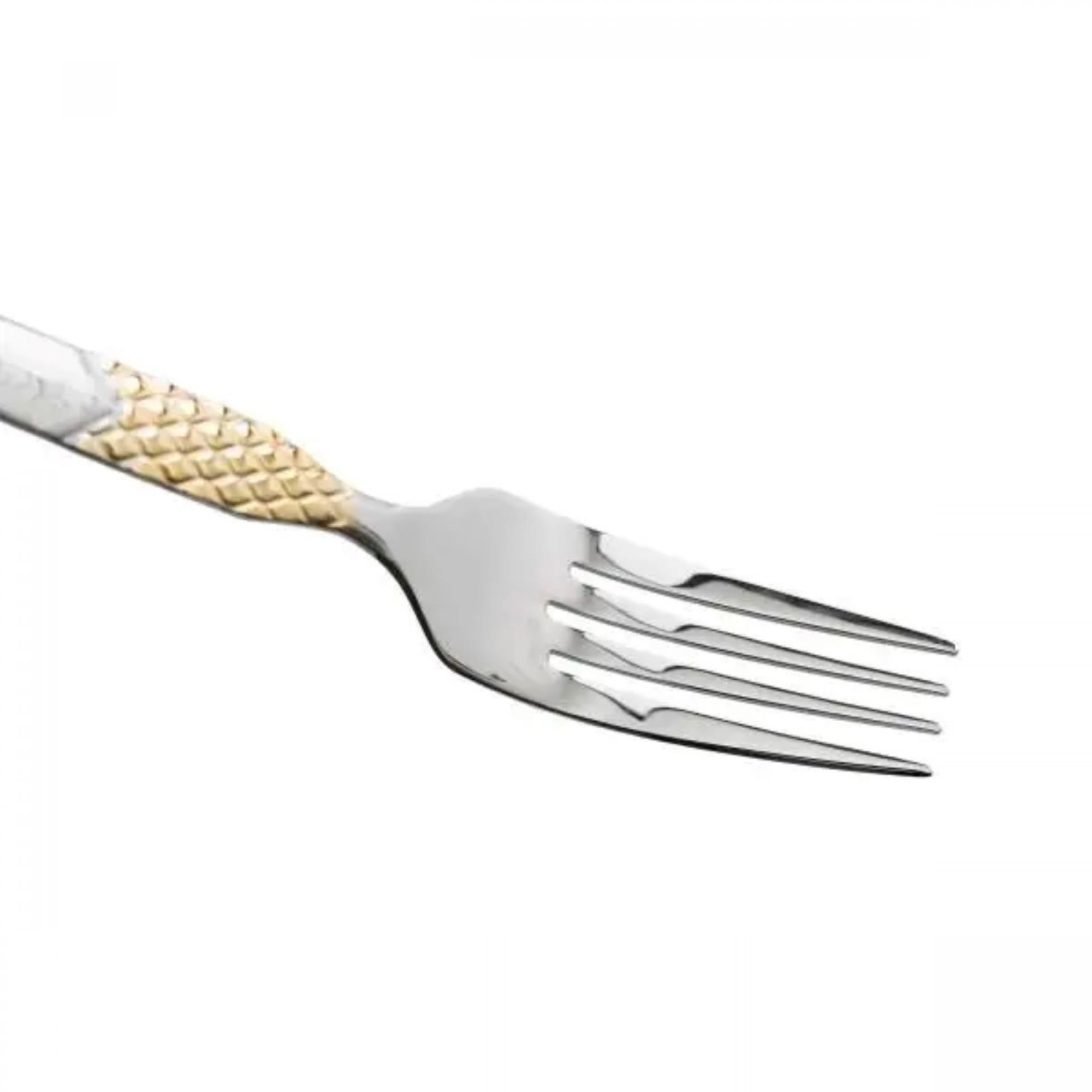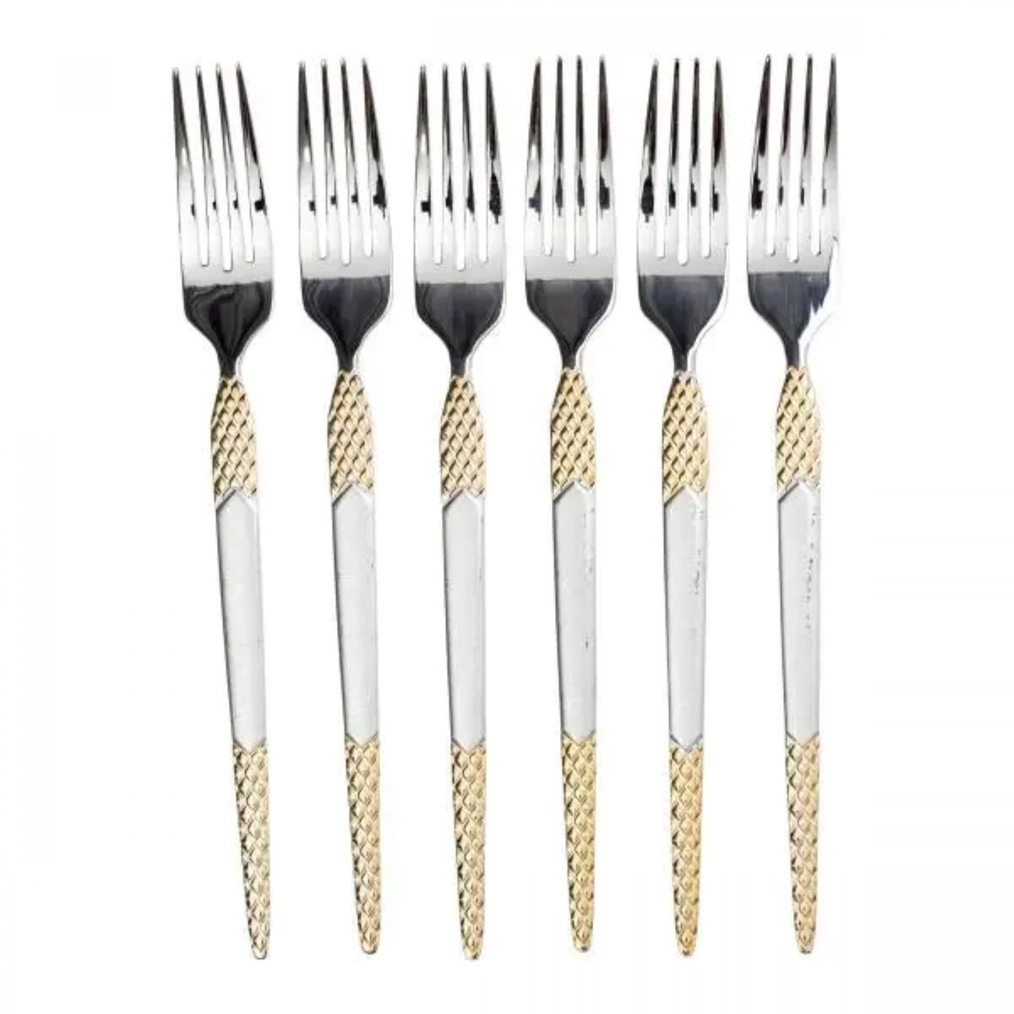 Набір столових виделок складається з 6 штук, упакованих у зручну блістерну упаковку для захисту під час зберігання і транспортування. Вилки мають сріблясте покриття, що надає їм елегантності, а золотисте оздоблення і витончене гравіювання на ручках роблять кожну вилку стильним доповненням до столових приборів. Основні характеристики: Кількість предметів у наборі: 6 шт; Кількість персон: 6; Довжина: 21 см; Матеріал: нержавіюча сталь; Упаковка: пакет. Ідеальні для використання під час повсякденних прийомів їжі або для святкових обідів, ці виделки мають зручну форму та оптимальний розмір для комфортного використання. Класичний дизайн гармонійно поєднується з різними стилями сервірування. Для догляду за виробом рекомендується використовувати м'які мийні засоби, які не ушкоджують покриття та гравіювання. Після миття варто витирати виделки насухо, щоб зберегти їхній блиск і продовжити термін служби.
