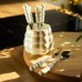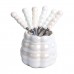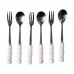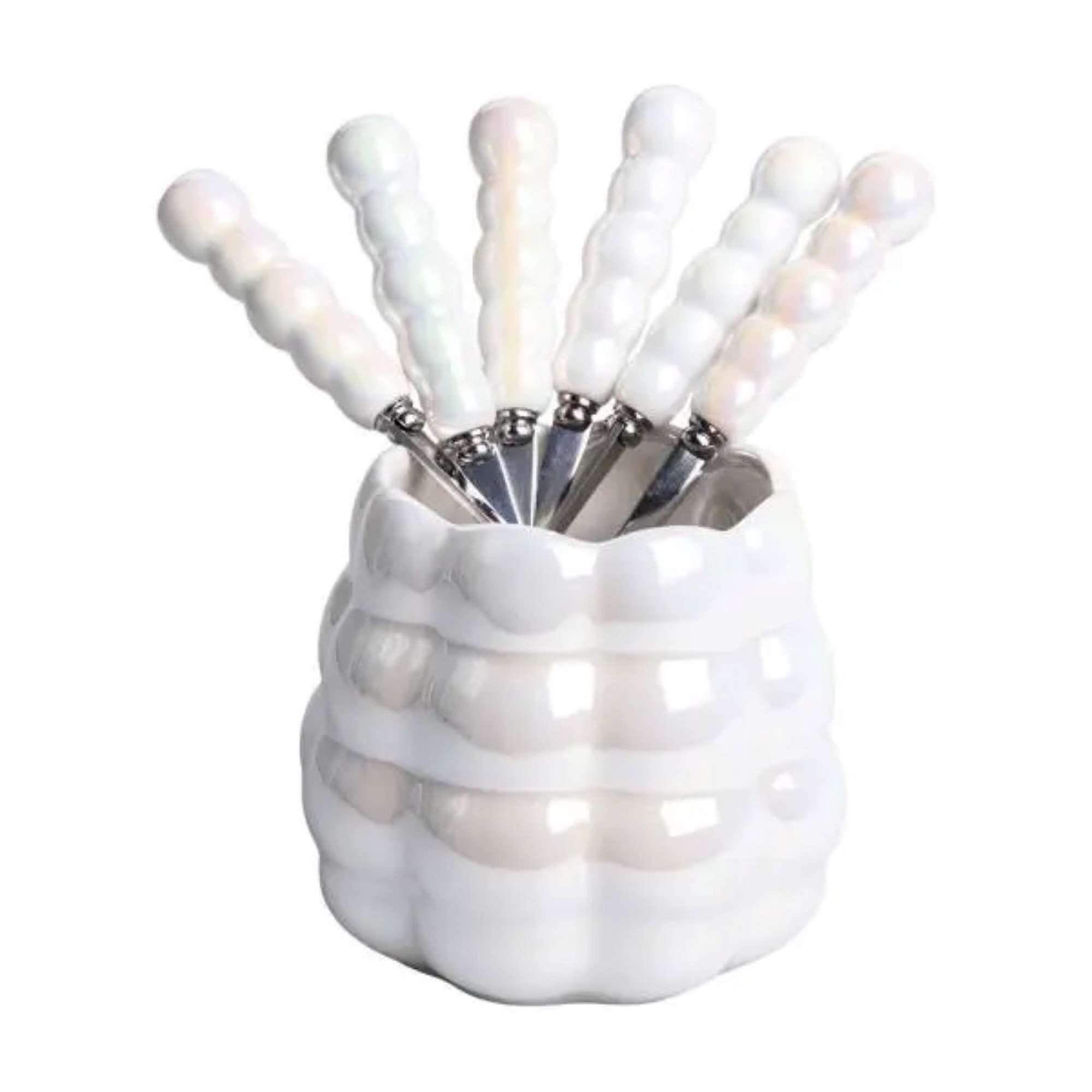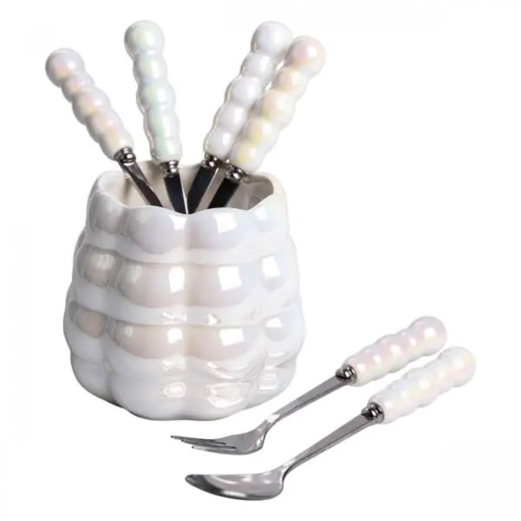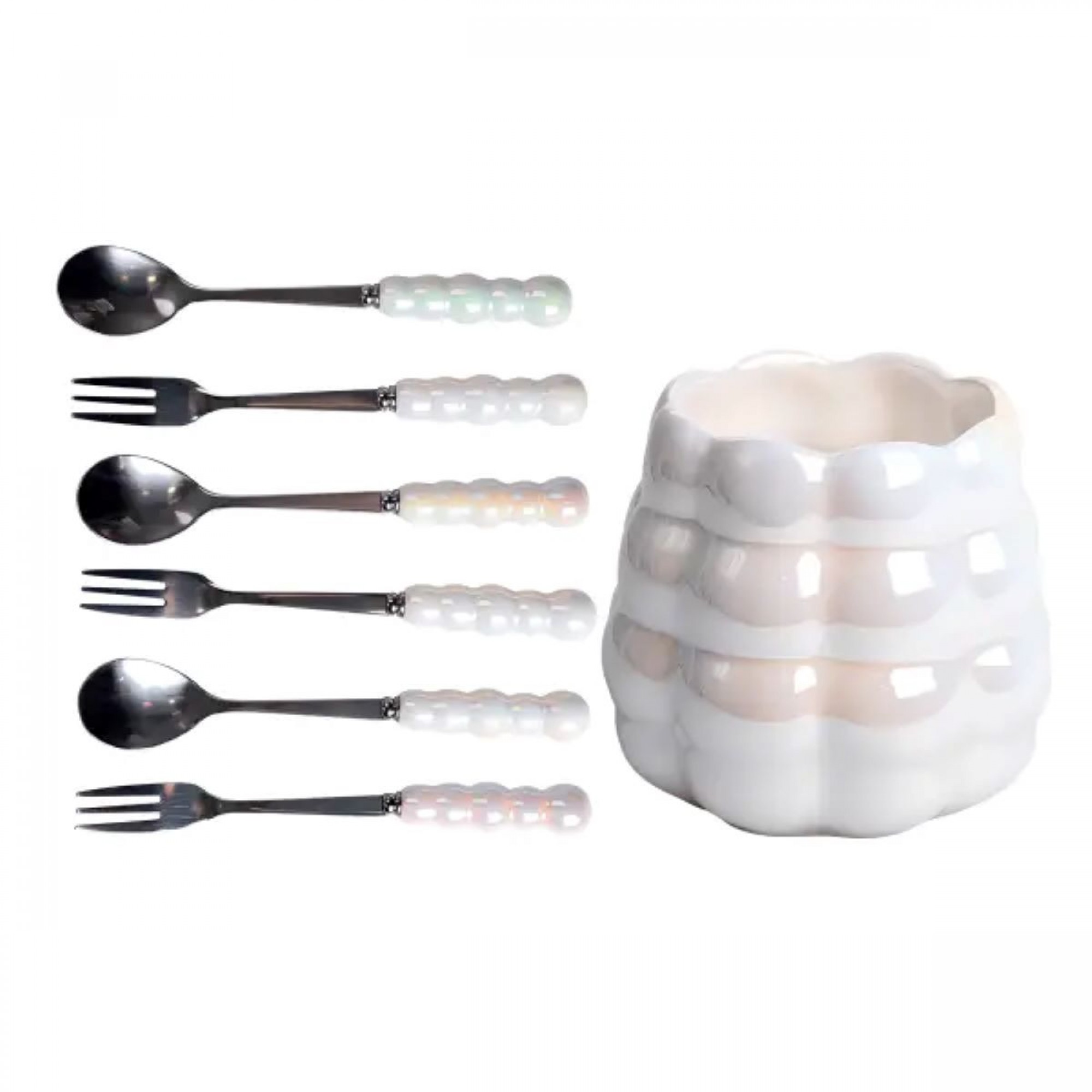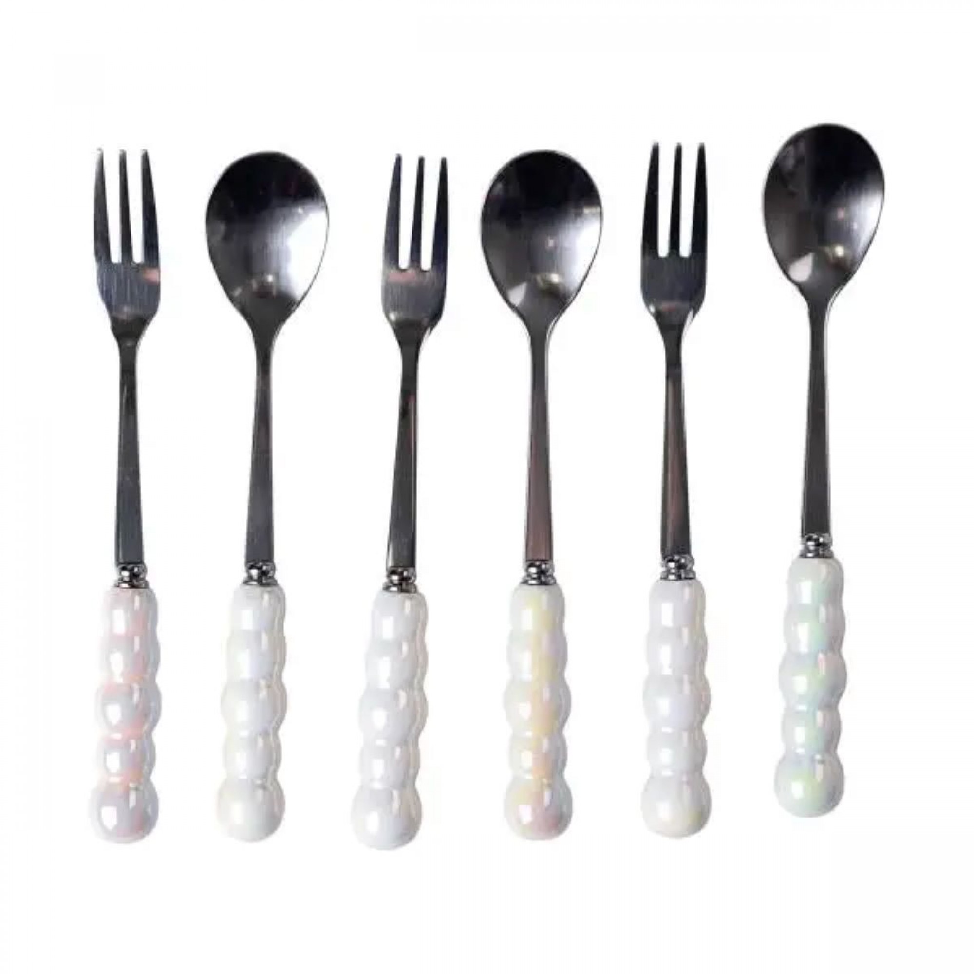 Набір десертних виделок і ложок складається з приладів, виготовлених із неіржавкої сталі, з керамічними ручками, оформленими у вигляді перлин. Поєднання матеріалів забезпечує міцність виробів і естетичний вигляд. Гладка поверхня сталі сприяє зручному використанню та легкому догляду. Основні характеристики: Кількість предметів у наборі: 7 шт; Кількість персон: 3; Матеріал приладів: нержавіюча сталь, кераміка; Матеріал підставки: кераміка; Упаковка: коробка; Розміри: висота підставки: 7 см; довжина десертної ложки: 14.5 см; довжина десертної виделки: 14.5 см. Форма ложок і виделок адаптована для вживання десертів, забезпечуючи комфорт під час трапези. Керамічні ручки мають гладку структуру, що надає приладам характерного зовнішнього вигляду. Конструкція ручок передбачає надійне зчеплення з металевою частиною, що мінімізує ризик пошкоджень під час експлуатації. Набір доповнено керамічною підставкою, яка слугує для зручного зберігання приладів. Підставка відповідає загальному дизайну комплекту і забезпечує організоване розміщення предметів на столі або в зоні сервірування.