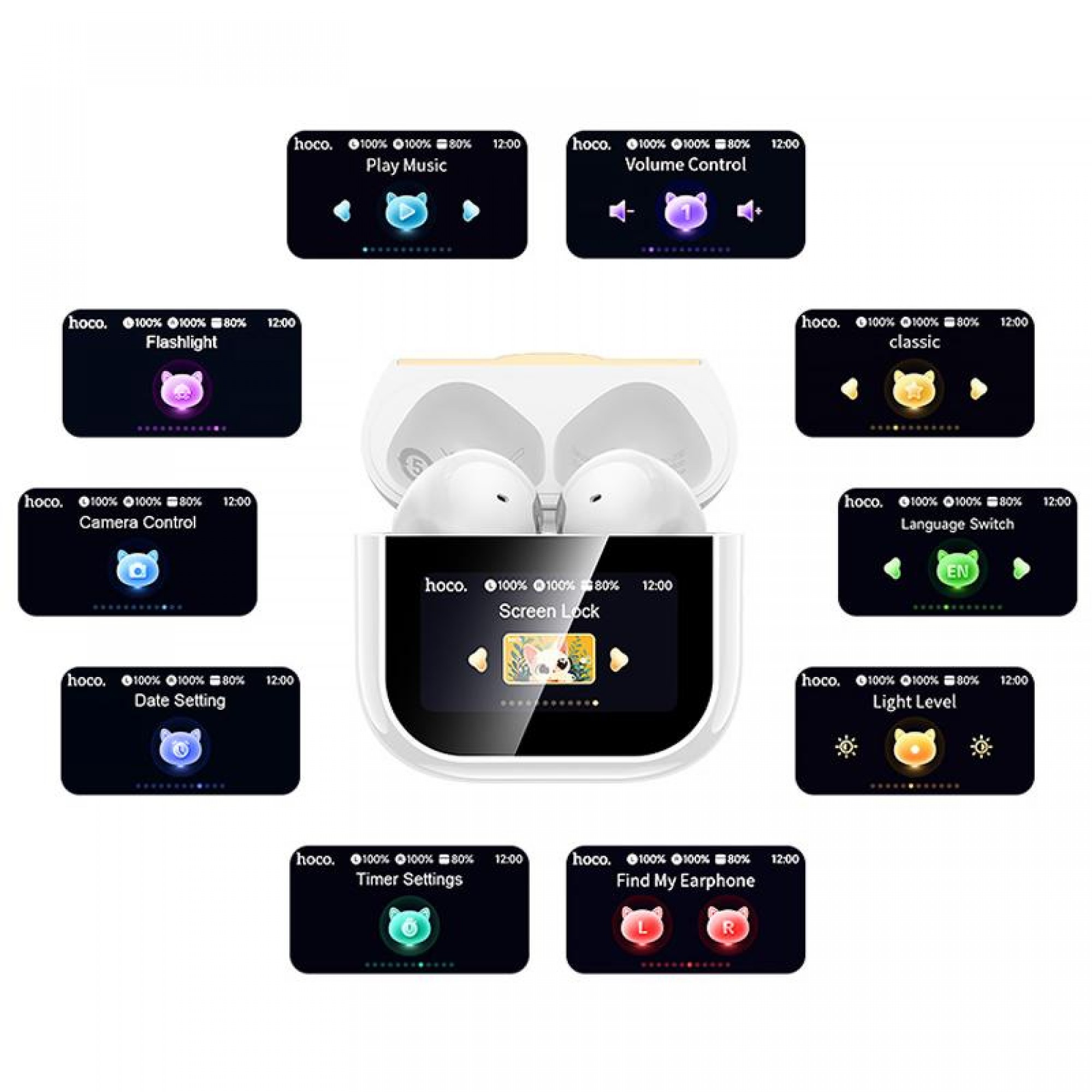 Эти наушники поддерживают функцию Hall switch и оснащены интеллектуальным сенсорным экраном, который позволяет управлять множеством функций прямо из зарядного чехла. На экране отображается текущий уровень заряда батареи и точное время работы гарнитуры и зарядного устройства.