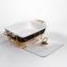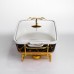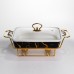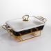 Фарфоровая мармитница предназначена для удобного подогрева и подачи блюд на стол. Она оснащена стеклянной крышкой, которая позволяет контролировать процесс приготовления без необходимости открывать мармитницу. Металлическая подставка золотистого цвета со встроенным подогревом обеспечивает равномерное сохранение тепла блюд в течение длительного времени. Поверхность мармитницы выполнена в черном цвете с золотыми прожилками, образующими мраморный рисунок. Такая текстура не только придает изделию изысканный вид, но и делает его устойчивым к появлению царапин и пятен от пищи. Стеклянная крышка плотно прилегает к фарфору, предотвращая потерю тепла и сохраняя аромат блюд. Мармитница удобна в использовании для сервировки горячих блюд во время семейных обедов или праздничных мероприятий. Металлическая подставка с подогревом легко подключается к источнику питания, обеспечивая поддержание оптимальной температуры блюд. Она устойчива на столе и не занимает много места, что делает ее практичным решением для кухни любого размера. Характеристики: Материал: фарфор Крышка: стеклянная