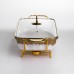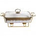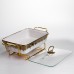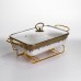 Мармитница имеет прямоугольную форму из белого фарфора. По верхнему краю расположена тонкая золотая отделка, которая подчеркивает контур и добавляет завершенности. Конструкция установлена на металлической подставке золотого цвета, что обеспечивает устойчивость и позволяет использовать свечи для подогрева. Основной материал – гладкий белый фарфор, украшенный золотым орнаментом по краю. Узор сдержанный, симметричный, без избыточного декора, что делает изделие универсальным для различных стилей сервировки. Стеклянная крышка прозрачная, с металлической ручкой золотого цвета, гармонично сочетающейся с подставкой и отделкой. Мармитница предназначена для подачи горячих блюд с поддержкой их температуры. Металлическая подставка позволяет разместить подогревательные элементы, а стеклянная крышка сохраняет тепло и аромат, при этом позволяя видеть содержимое. Фарфор устойчив к высоким температурам и легко очищается после использования, что делает изделие практичным в ежедневном применении и во время праздничных событий. Характеристики Тип: мармитница фарфоровая Материал: фарфор Подставка: металлическая, золотого цвета Крышка: стеклянная с металлической ручкой