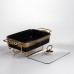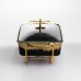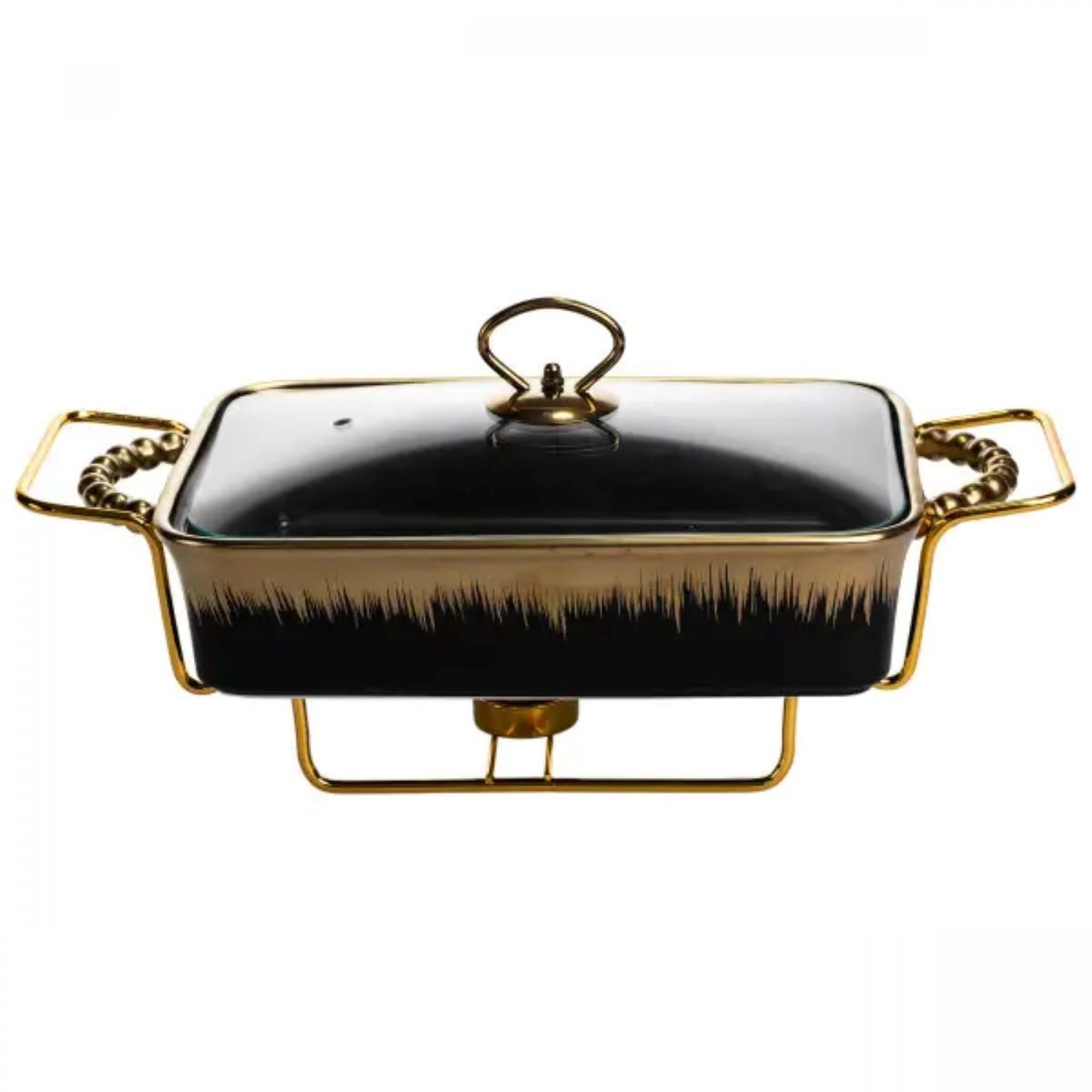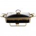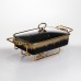 Мармитница фарфоровая прямоугольной формы предназначена для подачи и поддержания температуры готовых блюд во время сервировки. Лаконичное сочетание черного цвета с золотистой отделкой по краям делает изделие уместным как для домашнего использования, так и для банкетов, кейтеринга или ресторанного формата. Прямоугольная форма удобна для размещения на столе и рационального использования пространства. Мармитница изготовлена из фарфора, что хорошо удерживает тепло и подходит для подачи горячих блюд. Прозрачная стеклянная крышка позволяет контролировать содержимое без необходимости открывания, уменьшая потерю тепла. Крышка плотно прилегает, что помогает сохранять температуру и внешний вид блюда на протяжении всего времени подачи. Металлическая подставка оснащена местами для свечей-таблеток, которые обеспечивают равномерный подогрев без подключения к электросети. Такой формат удобен для выездных мероприятий и фуршетов. Конструкция устойчива, проста в уходе и рассчитана на многократное использование в условиях интенсивной эксплуатации. Характеристики: Тип изделия: мармитница Форма: прямоугольная Материал чаши: фарфор Цвет чаши: черный Отделка: золотистая по краям Крышка: стеклянная, прозрачная Подставка: металлическая Тип подогрева: от свечей-таблеток