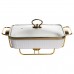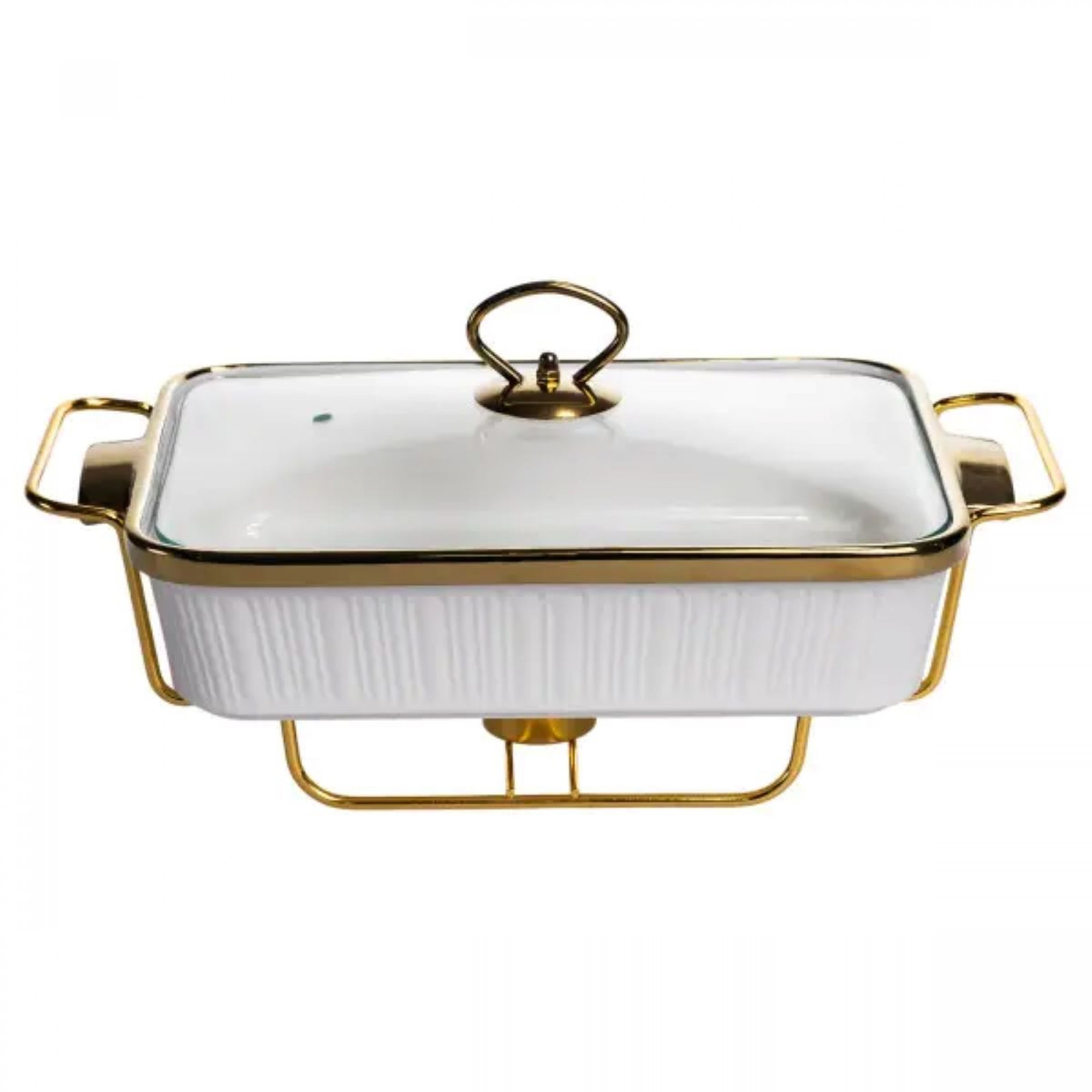 Мармитница фарфоровая прямоугольной формы выполнена в нейтральном белом цвете, который легко сочетается с разными стилями сервировки. Изделие предназначено для подачи и поддержания температуры горячих блюд во время семейных обедов, праздничных событий или профессионального использования. Прямоугольная форма позволяет удобно размещать мармитницу на столе и эффективно использовать пространство. Мармитница хорошо сохраняет тепло и подходит для различных видов горячих блюд. Прозрачная стеклянная крышка позволяет видеть содержимое без открывания, что помогает уменьшить потерю температуры и сохранить внешний вид блюда. Крышка легко снимается и удобна в уходе. Мармитница установлена на металлической подставке с золотистым покрытием, которая оснащена подогревом от свечей-таблеток. Такой способ нагрева не требует электричества и подходит для выездных мероприятий, фуршетов и банкетов. Конструкция обеспечивает стабильность и рассчитана на регулярное использование. Характеристики: Тип изделия: мармитница Форма: прямоугольная Материал чаши: фарфор Цвет чаши: белый Крышка: стеклянная, прозрачная Материал подставки: металл Цвет подставки: золотистый Тип подогрева: от свечей-таблеток