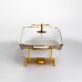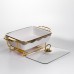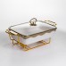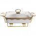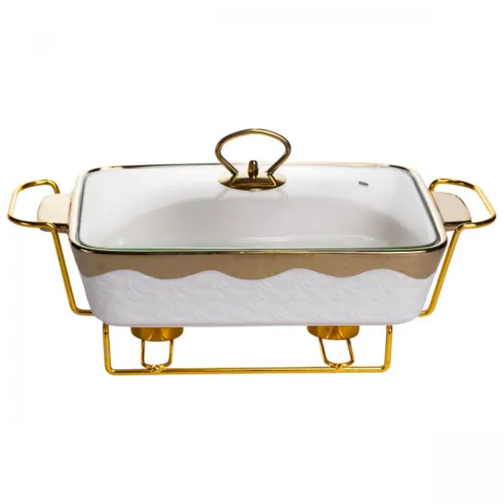 Мармит фарфоровый на металлической подставке с подогревом – практичное решение для подачи горячих блюд дома или во время мероприятий. Благодаря конструкции с подставкой и местом для свечей-таблеток блюдо дольше остается теплым без подключения к электричеству. Стеклянная крышка позволяет контролировать содержимое без необходимости открывать емкость. Фарфоровая чаша объемом 1,5 л подходит для супов, гарниров, соусов или вторых блюд. Металлическая подставка золотистого цвета обеспечивает стойкость и выдерживает вес изделия вместе с содержимым. Компактные размеры позволяют удобно разместить мармит на столе, не занимая лишнего пространства. Модель рассчитана на использование с двумя свечами-таблетками, что обеспечивает равномерную поддержку температуры. Конструкция легко разбирается для мытья и хранения. Подходит для ежедневного использования или сервировки во время праздников. Характеристики: Материал чаши: фарфор Материал крышки: стекло Материал подставки: металл Цвет подставки: золотистый Объем: 1,5 л Высота: 15,5 см Ширина: 19 см Длина: 35,5 см Вес: 2,16 кг Источник подогрева: 2 свечи-таблетки