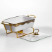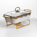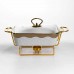 Мармит фарфоровый на металлической подставке с подогревом – практичное решение для подачи горячих блюд дома или во время мероприятий. Благодаря конструкции с подставкой и местом для свечей-таблеток блюдо дольше остается теплым без подключения к электричеству. Стеклянная крышка позволяет контролировать содержимое без необходимости открывать емкость. Фарфоровая чаша объемом 1 л подходит для супов, гарниров, соусов или вторых блюд. Металлическая подставка золотистого цвета обеспечивает стойкость и выдерживает вес изделия вместе с содержимым. Компактные размеры позволяют удобно разместить мармит на столе, не занимая лишнего пространства. Модель рассчитана на использование с двумя свечами-таблетками, что обеспечивает равномерную поддержку температуры. Конструкция легко разбирается для мытья и хранения. Подходит для ежедневного использования или сервировки во время праздников. Характеристики: Материал чаши: фарфор Материал крышки: стекло Материал подставки: металл Цвет подставки: золотистый Объем: 1 л Высота: 11 см Ширина: 16 см Длина: 31 см Вес: 1.7 кг Источник подогрева: 2 свечи-таблетки