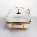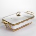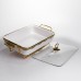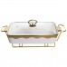 Мармит фарфоровый на металлической подставке с подогревом – практичное решение для подачи горячих блюд дома или во время мероприятий. Благодаря конструкции с подставкой и местом для свечей-таблеток блюдо дольше остается теплым без подключения к электричеству. Стеклянная крышка позволяет контролировать содержимое без необходимости открывать емкость. Фарфоровая чаша объемом 2 л подходит для супов, гарниров, соусов или вторых блюд. Металлическая подставка золотистого цвета обеспечивает стойкость и выдерживает вес изделия вместе с содержимым. Компактные размеры позволяют удобно разместить мармит на столе, не занимая лишнего пространства. Модель рассчитана на использование с двумя свечами-таблетками, что обеспечивает равномерную поддержку температуры. Конструкция легко разбирается для мытья и хранения. Подходит для ежедневного использования или сервировки во время праздников. Характеристики: Материал чаши: фарфор Материал крышки: стекло Материал подставки: металл Цвет подставки: золотистый Объем: 2 л Высота: 15,5 см Ширина: 22,5 см Длина: 40 см Вес: 3.1 кг Источник подогрева: 2 свечи-таблетки