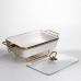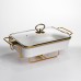 Мармитница фарфоровая прямоугольной формы выполнена в нейтральном белом цвете, который легко сочетается с разными стилями сервировки. Изделие предназначено для подачи и поддержания температуры горячих блюд во время семейных обедов, праздничных событий или профессионального использования. Прямоугольная форма позволяет удобно размещать мармитницу на столе и эффективно использовать пространство. Мармитница хорошо сохраняет тепло и подходит для различных видов горячих блюд. Прозрачная стеклянная крышка позволяет видеть содержимое без открывания, что помогает уменьшить потерю температуры и сохранить внешний вид блюда. Крышка легко снимается и удобна в уходе. Мармитница установлена на металлической подставке с золотистым покрытием, которая оснащена подогревом от свечей-таблеток. Такой способ нагрева не требует электричества и подходит для выездных мероприятий, фуршетов и банкетов. Конструкция обеспечивает стабильность и рассчитана на регулярное использование. Характеристики: Тип изделия: мармитница Форма: прямоугольная Материал чаши: фарфор Цвет чаши: белый Крышка: стеклянная, прозрачная Материал подставки: металл Цвет подставки: золотистый Тип подогрева: от свечей-таблеток