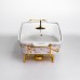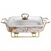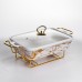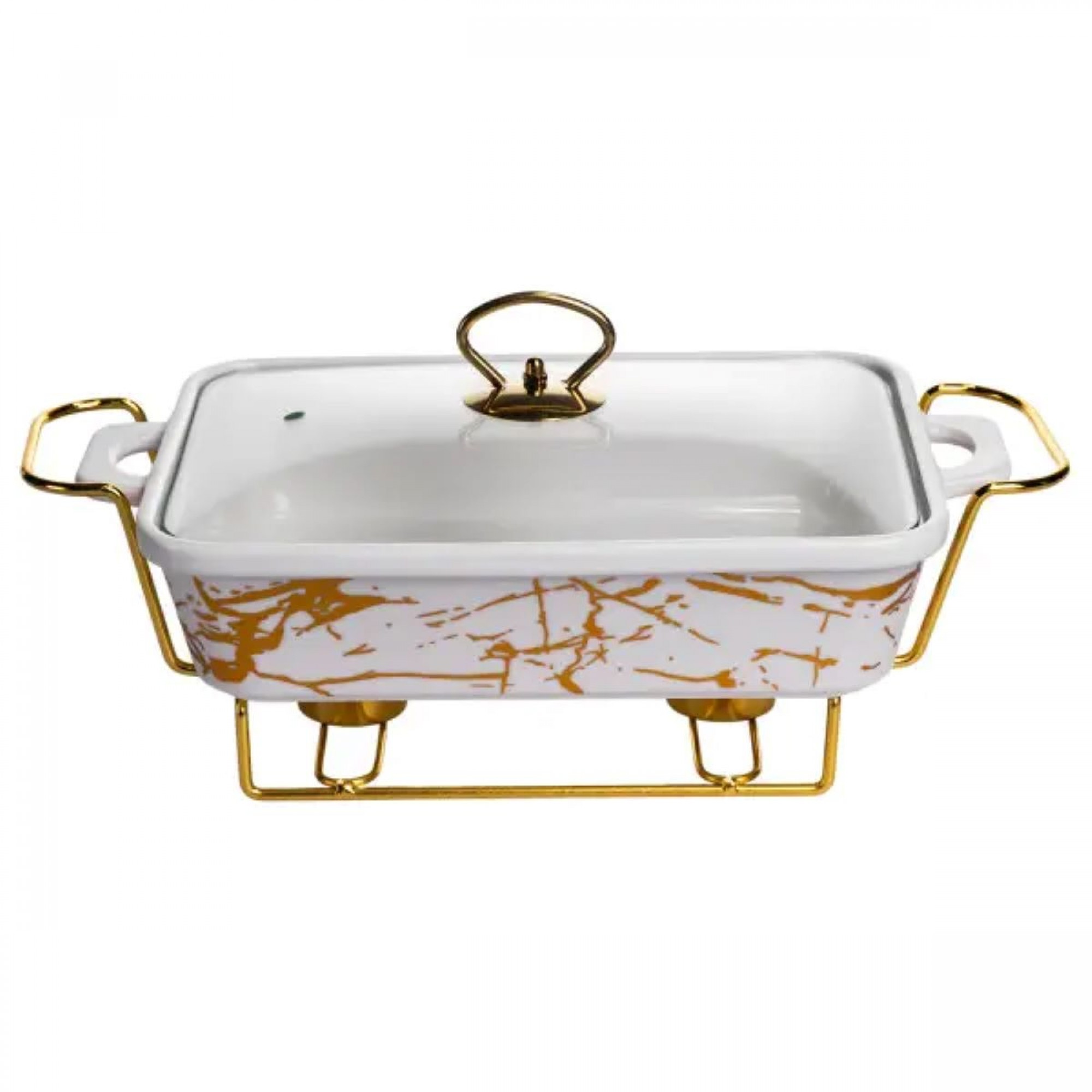 Фарфоровая мармитница со стеклянной крышкой выполнена с декоративным покрытием «золотой мрамор», что придает сервировке опрятный и стильный вид. Изделие предназначено для подачи горячих блюд и поддержания их температуры во время обедов, праздничных событий или банкетов. Такой дизайн легко сочетается с классической и современной посудой. Мармитница изготовлена из высококачественного фарфора, который обеспечивает равномерный нагрев и стабильное сохранение тепла. Двойные стенки усиливают теплоизоляционные свойства, что позволяет дольше поддерживать оптимальную температуру блюда. Гладкая поверхность фарфора удобна в уходе и не впитывает запахи. Прозрачная стеклянная крышка плотно прилегает к корпусу, уменьшая потери тепла и позволяя контролировать содержимое без открывания. Такая конструкция делает мармитницу практичной для регулярного использования как в домашних условиях, так и в профессиональной сервировке.