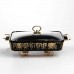 Мармитница фарфоровая черного цвета объемом 2 л обеспечивает удобную подачу горячих блюд и соусов на стол. Прямоугольная форма сочетается со стеклянной крышкой, что позволяет контролировать состояние блюда во время подачи. Золотистая металлическая подставка добавляет стабильности и оснащена подогревом от одной свечи-таблетки, что помогает поддерживать оптимальную температуру блюда. Высота мармитницы составляет 15.5 см, ширина – 22,5 см, а длина – 40 см, что делает ее компактной и удобной для сервировки даже на небольшом столе. Вес изделия 3.1 кг обеспечивает надежное удержание без риска переворачивания. Черный цвет фарфора придает изделию сдержанный и современный вид, который легко вписывается в любой интерьер. Простой механизм подогрева от свечи-таблетки позволяет быстро подготовить мармитницу к работе и поддерживать температуру блюда без использования электричества. Это изделие удобно для будничного использования и подходит для подачи различных горячих блюд, закусок и соусов, делая сервировку более организованной и аккуратной. Характеристики: Объем: 2 л Материал: фарфор, металлическая подставка Подогрев: от 1 свечи-таблетки Высота: 15.5 см Ширина: 22,5 см Длина: 40 см Вес: 3.1 кг