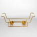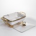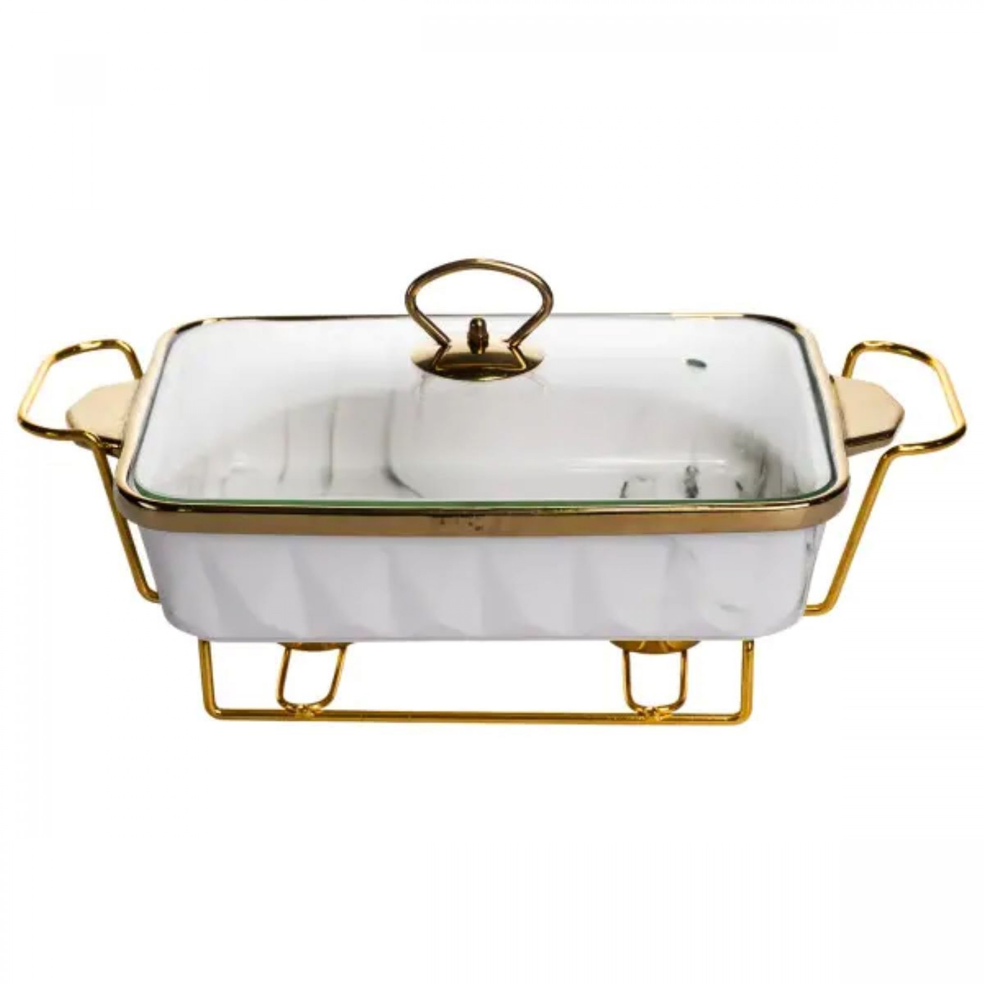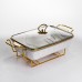 Мармитница имеет прямоугольную форму из белого фарфора. По верхнему краю расположена золотая отделка, которая подчеркивает контур и добавляет завершенности. Конструкция установлена на металлической подставке золотого цвета, что обеспечивает устойчивость и позволяет использовать свечи или горелки для подогрева. Основной материал – гладкий белый фарфор с мраморным узором, дополнен золотым ободком по краю. Дизайн сдержанный и симметричный, без избыточного декора, что делает изделие универсальным для различных стилей сервировки. Стеклянная крышка прозрачная, с металлической ручкой золотого цвета, которая гармонично сочетается с подставкой и отделкой. Мармитница предназначена для подачи горячих блюд с поддержкой их температуры. Металлическая подставка позволяет разместить подогревательные элементы, а стеклянная крышка сохраняет тепло и аромат, при этом позволяя видеть содержимое. Фарфор устойчив к высоким температурам и легко очищается после использования, что делает изделие практичным в ежедневном применении и во время праздничных событий.