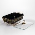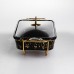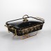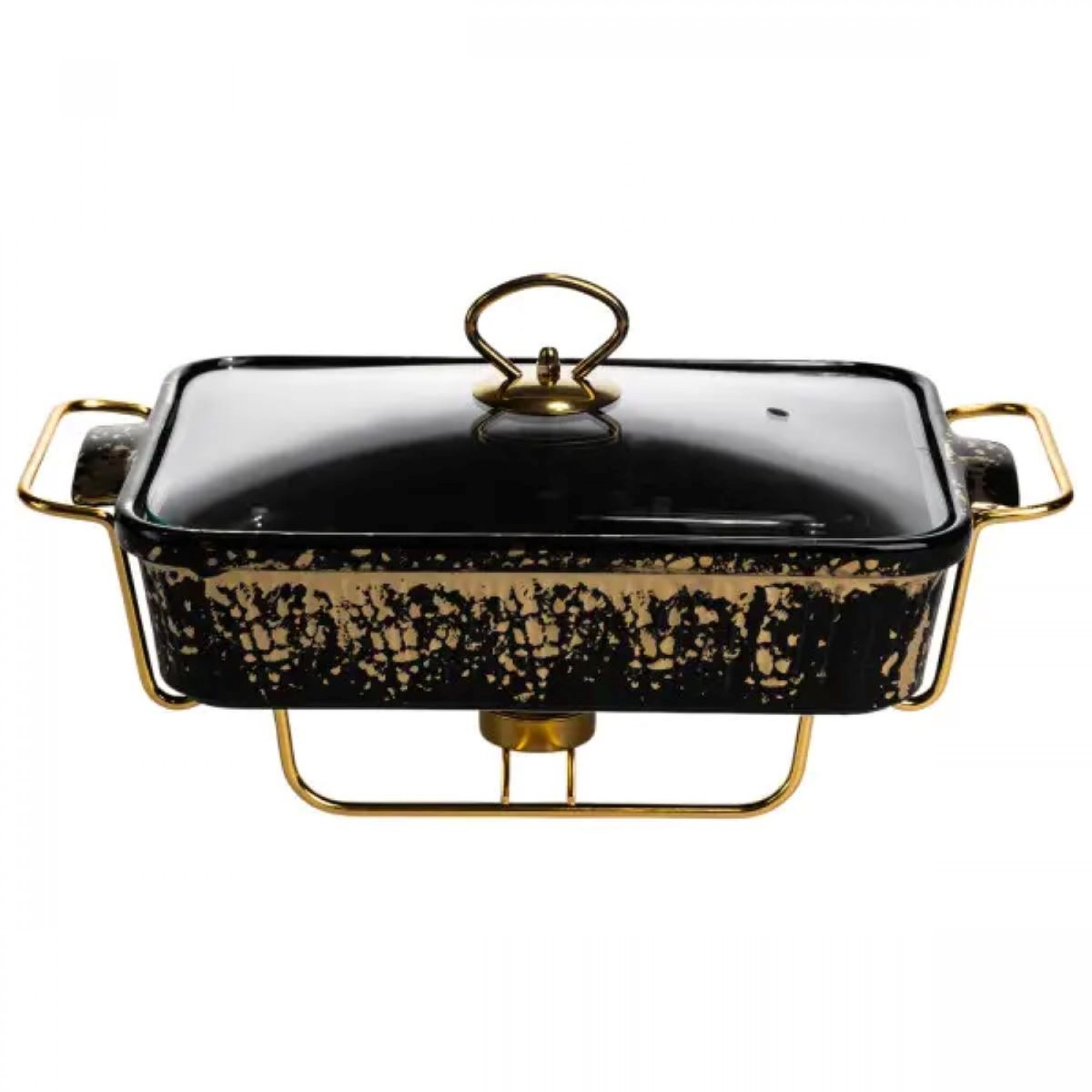 Мармитница имеет прямоугольную форму и изготовлена из фарфора черного цвета с декоративным золотистым вкраплением по поверхности. Такой дизайн подходит для сервировки горячих блюд во время банкетов, фуршетов или семейных событий. Фарфор обеспечивает сохранение температуры и подходит для подачи различных видов блюд. Изделие укомплектовано прозрачной стеклянной крышкой с металлической ручкой, позволяющей контролировать содержимое без открывания. Крышка плотно прилегает, помогая минимизировать потери тепла и поддерживать опрятный вид подачи в течение всего времени использования. Мармитница установлена на металлической подставке золотистого цвета с подогревом от свечей-таблеток. Такой тип нагрева не требует электропитания и обеспечивает равномерное поддержание температуры. Конструкция подставки устойчива и рассчитана на многократное использование.