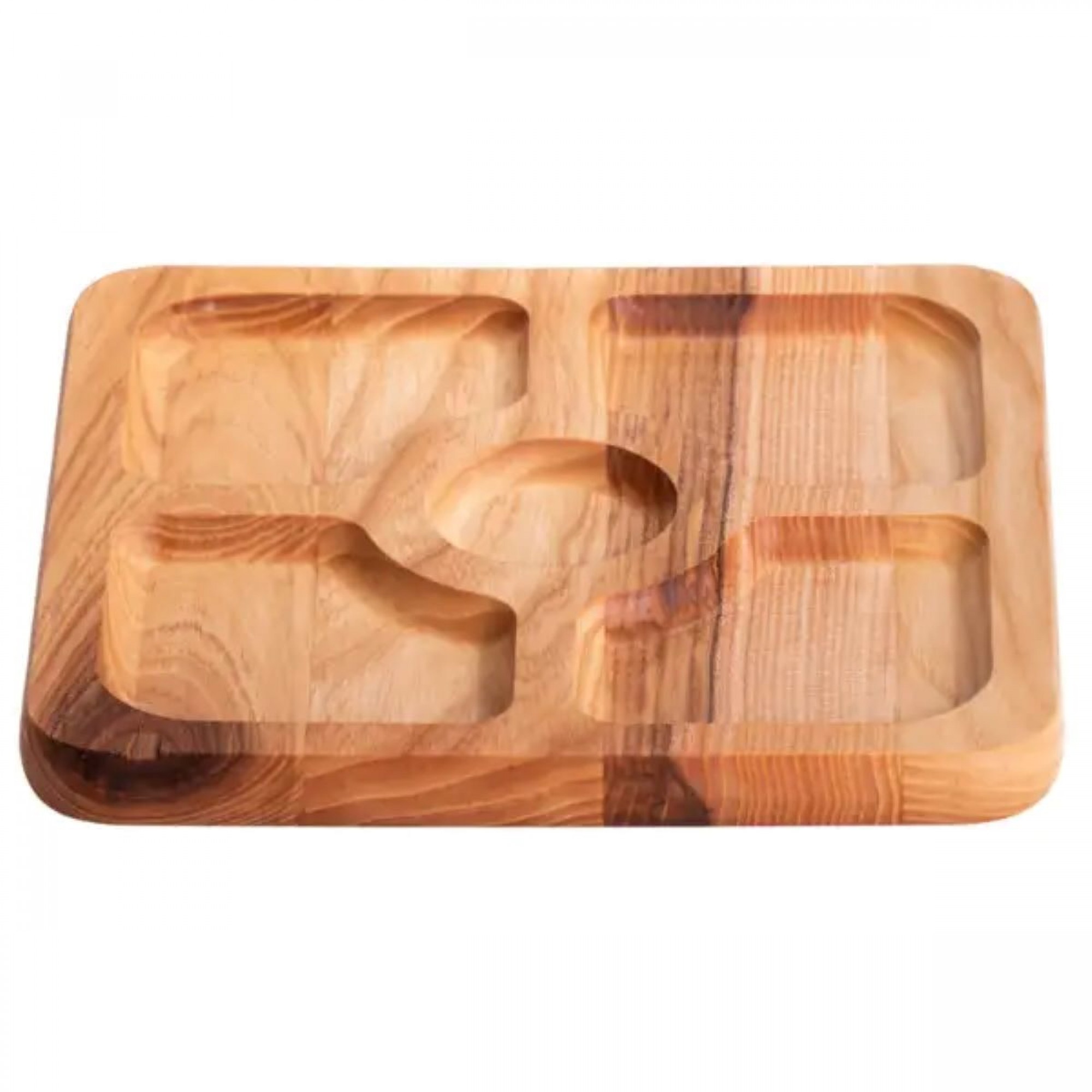 Деревянная менажница — это функциональный и эстетичный аксессуар для сервировки стола, который сочетает в себе практичность, экологичность и изысканный дизайн. Деревянная менажница размером 25×25 см с пятью секциями, выполненная из натурального ясеня, станет не только универсальным решением для подачи блюд, но и украшением вашего интерьера. Основные характеристики менажницы на пять секций Материал - ясень (натуральное дерево высокой плотности); Длина 25 см; Ширина 25 см; 5 секций; Форма - квадратная; Покрытие: масло для защиты древесины и сохранения её текстуры; Назначение: подача закусок, мясных блюд, сыров, суши и роллов, соусов, фруктов, орехов и др. Особенности и преимущества тарелки менажницы с секциями Менажницы из дерева производятся из натурального сырья — древесины ясеня, известной своей прочностью, устойчивостью к механическим повреждениям и красивой текстурой. Натуральное покрытие на основе масла не только подчеркивает природную текстуру, но и защищает поверхность от влаги, продлевая срок службы изделия. Такая деревянная менажница абсолютно безопасна для здоровья и подходит для ежедневного использования. Квадратная деревянная менажница оснащена пятью удобными секциями, которые позволяют разделять разные виды закусок. Это делает её идеальной для подачи сыров, мясных деликатесов, суши и роллов, орехов, фруктов или соусов. Компактный размер 25×25 см позволяет использовать её на любом столе, а функциональность и дизайн обеспечивают универсальность применения. Менажница с разделителями идеально подходит для самых разнообразных блюд: Менажница деревянная для сыра - разделите сорта сыра, добавив к ним фрукты, орехи или мёд. Менажница для мяса - используйте для сервировки мясных деликатесов или запечённых продуктов. Деревянная менажница для суши и роллов - отличный выбор для любителей японской кухни. Разместите суши, васаби и соевый соус в отдельных секциях. Деревянная тарелка для закусок - для орехов, крекеров, овощей или снеков. Менажница из дерева имеет натуральный оттенок и элегантный внешний вид, что делает её не только посудой, но и элементом декора. Она подчеркнёт ваш вкус и добавит изысканности любому событию. Менажница из дерева — это универсальный и практичный подарок для друзей, коллег или родственников. Её оригинальный дизайн и универсальность делают её подходящим вариантом на такие случаи, как новоселье, свадьба, день рождения, новый год или другие торжества. Преимущества использования Доска-менажница для подачи легко моется вручную с использованием мягких моющих средств. Рекомендуется избегать длительного контакта с водой и агрессивных чистящих составов, чтобы сохранить текстуру дерева и защитное покрытие. После, изделие нужно тщательно вытирать и сушить в вертикальном положении. Менажница на пять секций, изготовленная из ясеня, выдерживает интенсивное использование и надолго сохраняют свою эстетичность. Благодаря прочному материалу и защитному покрытию, изделие устойчиво к появлению трещин, деформации и повреждений. Деревянная менажница для подачи позволяет создать стильную сервировку с минимальными усилиями. Она становится центральным элементом стола, подчёркивая натуральную красоту подаваемых блюд. Менажницы из дерева — это идеальное решение для сервировки блюд на небольших столах или