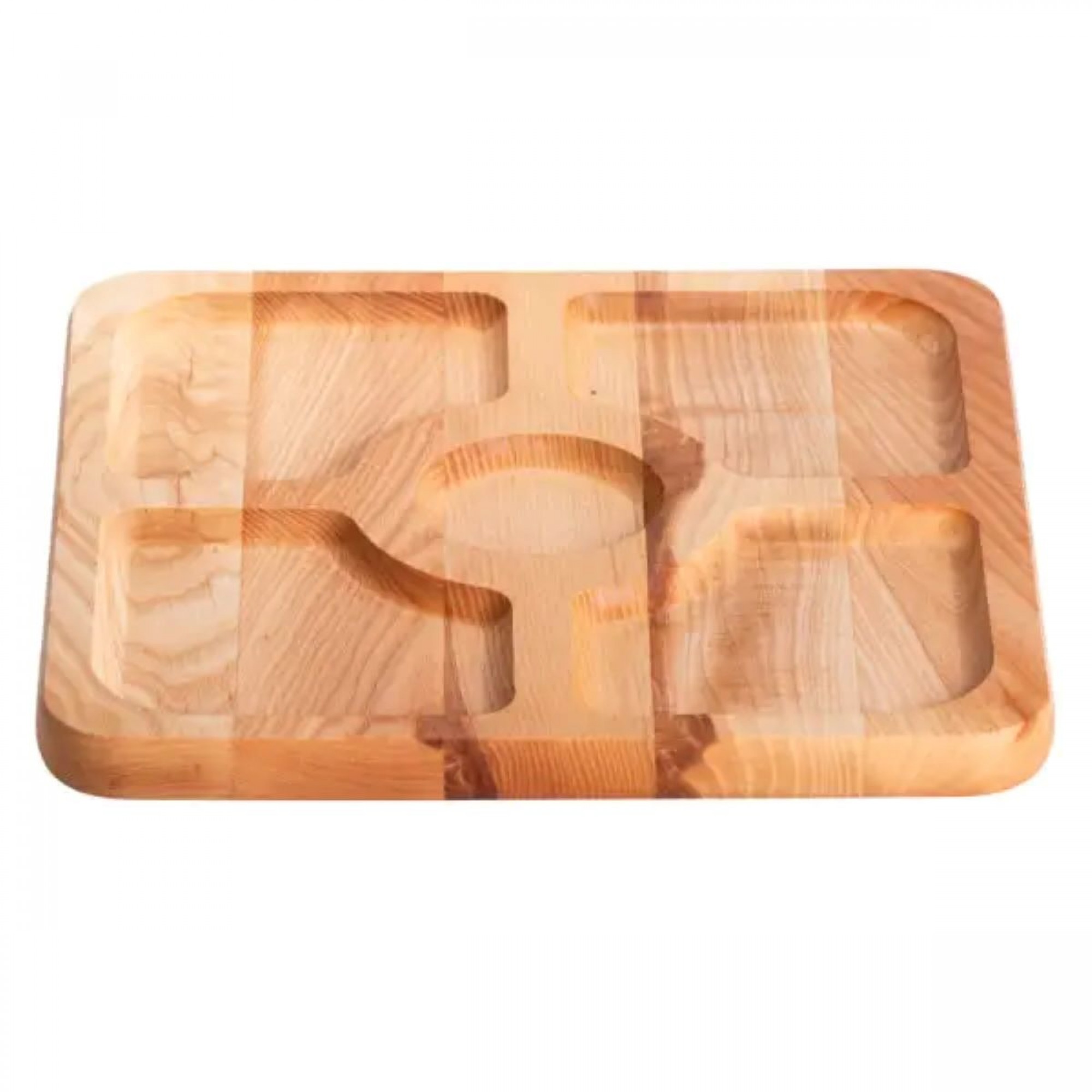 Деревянная менажница — это функциональный и эстетичный аксессуар для сервировки стола, который сочетает в себе практичность, экологичность и изысканный дизайн. Деревянная менажница размером 30×20 см с пятью секциями, выполненная из натурального ясеня, станет не только универсальным решением для подачи блюд, но и украшением вашего интерьера. Основные характеристики менажницы на пять секций Материал - ясень (натуральное дерево высокой плотности); Длина 30 см; Ширина 20 см; 5 секций; Покрытие: масло для защиты древесины и сохранения её текстуры; Назначение: подача закусок, мясных блюд, сыров, суши и роллов, соусов, фруктов, орехов и др. Особенности и преимущества тарелки менажницы с секциями Менажницы из дерева производятся из натурального сырья — древесины ясеня, известной своей прочностью, устойчивостью к механическим повреждениям и красивой текстурой. Натуральное покрытие на основе масла не только подчеркивает природную текстуру, но и защищает поверхность от влаги, продлевая срок службы изделия. Такая деревянная менажница абсолютно безопасна для здоровья и подходит для ежедневного использования. Деревянная менажница оснащена пятью удобными секциями, которые позволяют разделять разные виды закусок. Это делает её идеальной для подачи сыров, мясных деликатесов, суши и роллов, орехов, фруктов или соусов. Компактный размер 30×20 см позволяет использовать её на любом столе, а функциональность и дизайн обеспечивают универсальность применения. Менажница с разделителями идеально подходит для самых разнообразных блюд: Менажница деревянная для сыра - разделите сорта сыра, добавив к ним фрукты, орехи или мёд. Менажница для мяса - используйте для сервировки мясных деликатесов или запечённых продуктов. Деревянная менажница для суши и роллов - отличный выбор для любителей японской кухни. Разместите суши, васаби и соевый соус в отдельных секциях. Деревянная тарелка для закусок - для орехов, крекеров, овощей или снеков. Менажница из дерева имеет натуральный оттенок и элегантный внешний вид, что делает её не только посудой, но и элементом декора. Она подчеркнёт ваш вкус и добавит изысканности любому событию. Менажница из дерева — это универсальный и практичный подарок для друзей, коллег или родственников. Её оригинальный дизайн и универсальность делают её подходящим вариантом на такие случаи, как новоселье, свадьба, день рождения, новый год или другие торжества. Преимущества использования Доска-менажница для подачи легко моется вручную с использованием мягких моющих средств. Рекомендуется избегать длительного контакта с водой и агрессивных чистящих составов, чтобы сохранить текстуру дерева и защитное покрытие. После, изделие нужно тщательно вытирать и сушить в вертикальном положении. Менажница на пять секций, изготовленная из ясеня, выдерживает интенсивное использование и надолго сохраняют свою эстетичность. Благодаря прочному материалу и защитному покрытию, изделие устойчиво к появлению трещин, деформации и повреждений. Деревянная менажница для подачи позволяет создать стильную сервировку с минимальными усилиями. Она становится центральным элементом стола, подчёркивая натуральную красоту подаваемых блюд. Менажницы из дерева — это идеальное решение для сервировки блюд на небольших столах или пикниках. Три секции позволяю