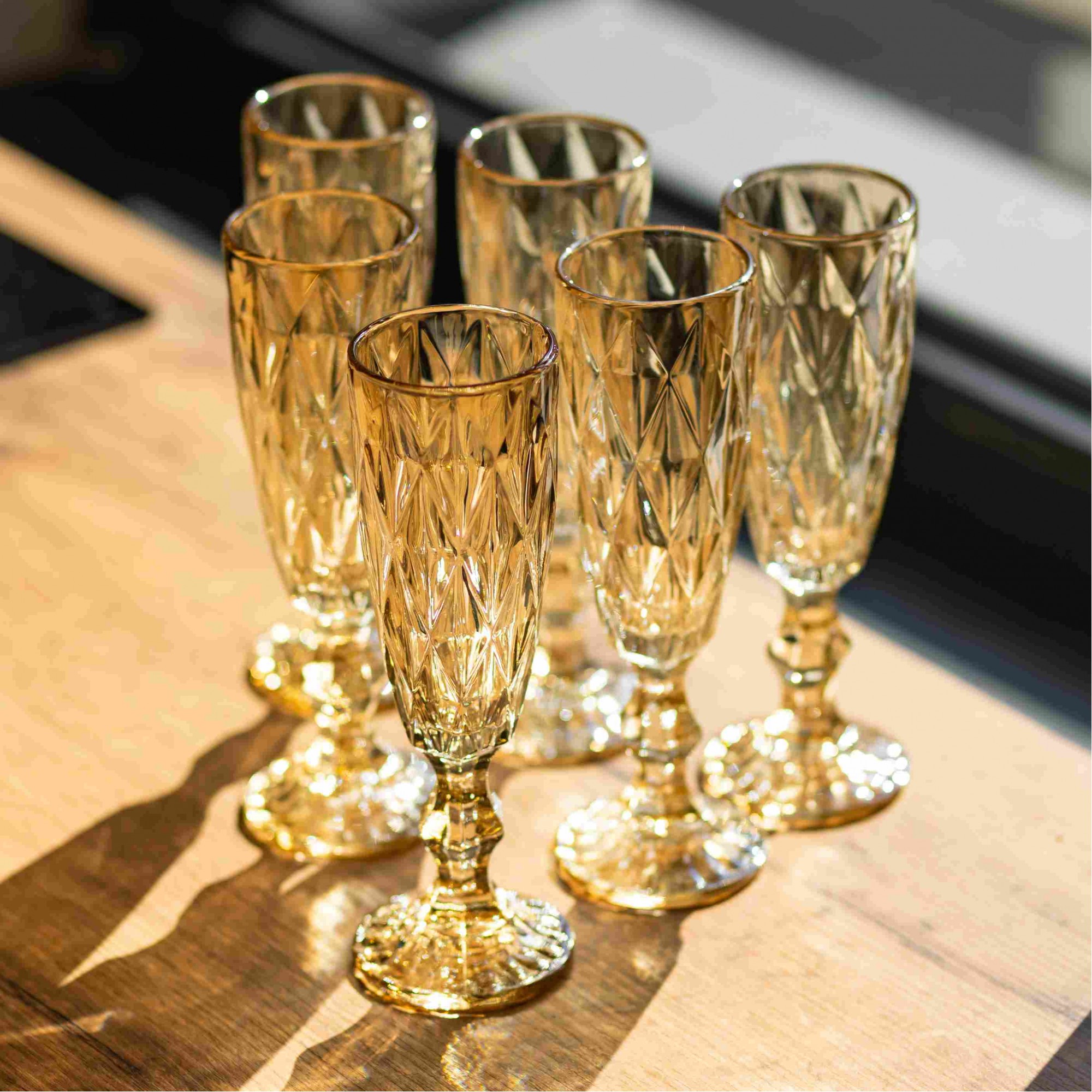 Элегантный комплект бокалов из тонированного стекла в теплом янтарном оттенке. Высокая чаша типа «флюте» и классическая алмазная огранка создают роскошную игру света, делая их идеальным выбором для праздничной сервировки. Особенности: Янтарный оттенок: Теплый золотисто-медовый цвет стекла придает сервировке уют и создает ощущение праздника, особенно при естественном освещении. Алмазная грань: Рельефный геометрический узор не только эстетичен, но и практичен - бокал надежно лежит в руке и не выскальзывает. Изящная форма: Высокая стройная чаша на тонкой фигурной ножке идеально подходит для подачи шампанского, игристых вин и легких коктейлей. Характеристики Материал: стекло Объем: 180 мл Высота: 19,3 см Вес: 2 кг
