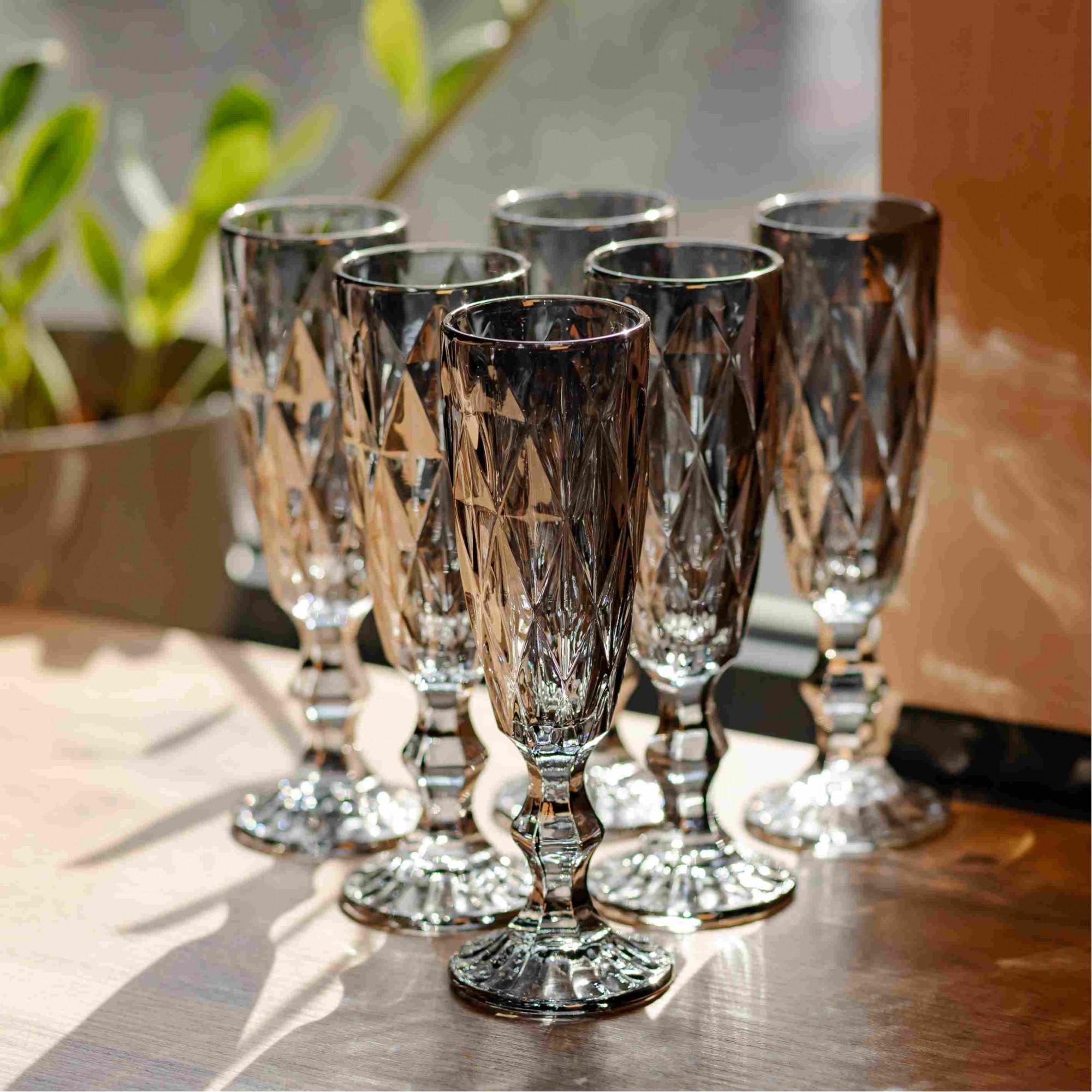 Элегантный комплект бокалов из тонированного стекла в глубоком графитовом оттенке. Высокая чаша типа «флюте» и изысканная огранка делают этот набор идеальным выбором для торжественных случаев и стильных фотосессий. Особенности Алмазная грань: Поверхность декорирована объемным геометрическим узором, который не только красиво преломляет свет, но и позволяет надежно держать бокал в руке. Цвет: Благородный дымчатый оттенок придает стеклу особый статус и современный вид. Изящный силуэт: Тонкая фигурная ножка со устойчивой основой придает бокалу легкость и визуальную хрупкость при высокой прочности материала. Характеристики Материал: стекло Объем: 180 мл Высота: 19,3 см Вес: 2 кг