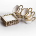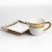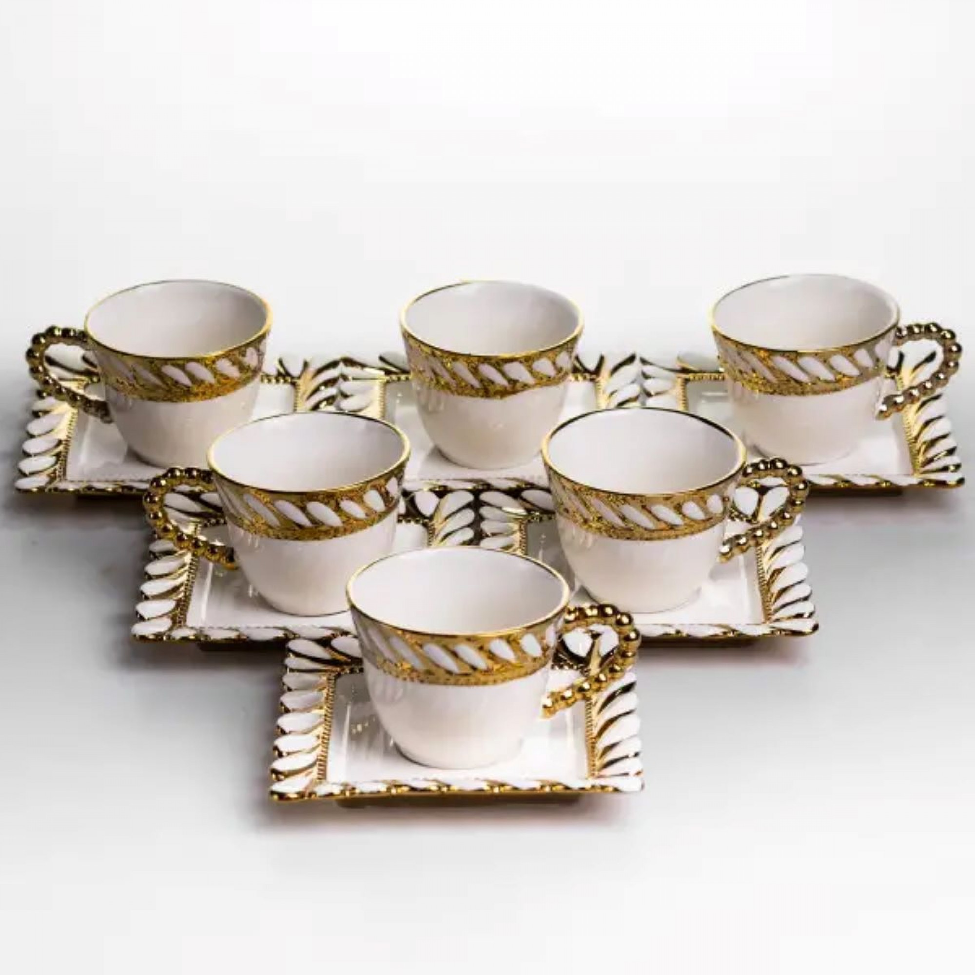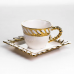 Набор чашек с блюдцами Tiffany на 6 персон подходит для подачи горячих напитков в ежедневном использовании или во время приема гостей. Объем каждой чашки 250 мл обеспечивает удобную порцию для чая или кофе, а квадратные блюдца размером 15×15 см добавляют практичности в сервировке. Чашки имеют диаметр 9 см и высоту 7,5 см, что делает их удобными для держания и использования. Комплект включает 6 чашек и 6 блюдец, что позволяет сразу сервировать стол для небольшой компании. Общий вес набора 2.8 кг обеспечивает устойчивость и ощущение полноценного фарфорового изделия. Край чашек и блюдец оформлен рельефным узором в виде переплетенного каната по периметру. Декор дополнен тонкой золотой окантовкой, которая подчеркивает форму каждого элемента. Сочетание квадратных блюдец с округлыми чашками создает выразительный, но сбалансированный вид в сервировке. Характеристики: Материал: фарфор Количество предметов: 12 (6 чашек + 6 блюдец) Объем чашки: 250 мл Диаметр чашки: 9 см Высота чашки: 7,5 см Размер блюдца: 15 × 15 см Форма блюдца: квадратная Вес набора: 2,8 кг