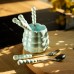 Набор десертных вилок и ложек состоит из приборов, изготовленных из нержавеющей стали, с керамическими ручками, оформленными в виде жемчужин. Сочетание материалов обеспечивает прочность изделий и эстетичный вид. Гладкая поверхность стали способствует удобному использованию и легкому уходу. Основные характеристики: Количество предметов в наборе: 7 шт.; Количество персон: 3; Материал приборов: нержавеющая сталь, керамика; Материал подставки: керамика; Упаковка: коробка; Размеры: высота подставки: 7 см; длина десертной ложки: 14.5 см; длина десертной вилки: 14.5 см. Форма ложек и вилок адаптирована для употребления десертов, обеспечивая комфорт во время трапезы. Керамические ручки имеют гладкую структуру, что придает приборам характерный внешний вид. Конструкция ручек предусматривает надежное сцепление с металлической частью, что минимизирует риск повреждений во время эксплуатации. Набор дополнен керамической подставкой, которая служит для удобного хранения приборов. Подставка соответствует общему дизайну комплекта и обеспечивает организованное размещение предметов на столе или в зоне сервировки.