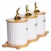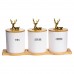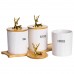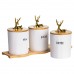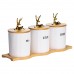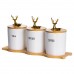 Набор из трёх фарфоровых банок на бамбуковой подставке станет стильным и практичным решением для хранения чая, кофе и сахара. Каждая ёмкость имеет чёткую надпись, что делает использование набора максимально удобным. Бамбуковые крышки плотно закрывают банки, надёжно защищая продукты от влаги и посторонних запахов. Элегантные фигурки золотых оленей на крышках добавляют декоративности и создают атмосферу уюта. Основные характеристики емкостей для хранения сахара, чая и кофе: Материал: фарфор, бамбук; Размер: 33×11.5×12 см; Диаметр баночек: 9 см; Высота баночек: 10 см; Объем баночек: 400 мл. Такой набор станет не только функциональным элементом кухни, но и стильным акцентом в интерьере. Он идеально подойдёт в подарок ценителям уюта и порядка, добавив в повседневный быт нотку элегантности.