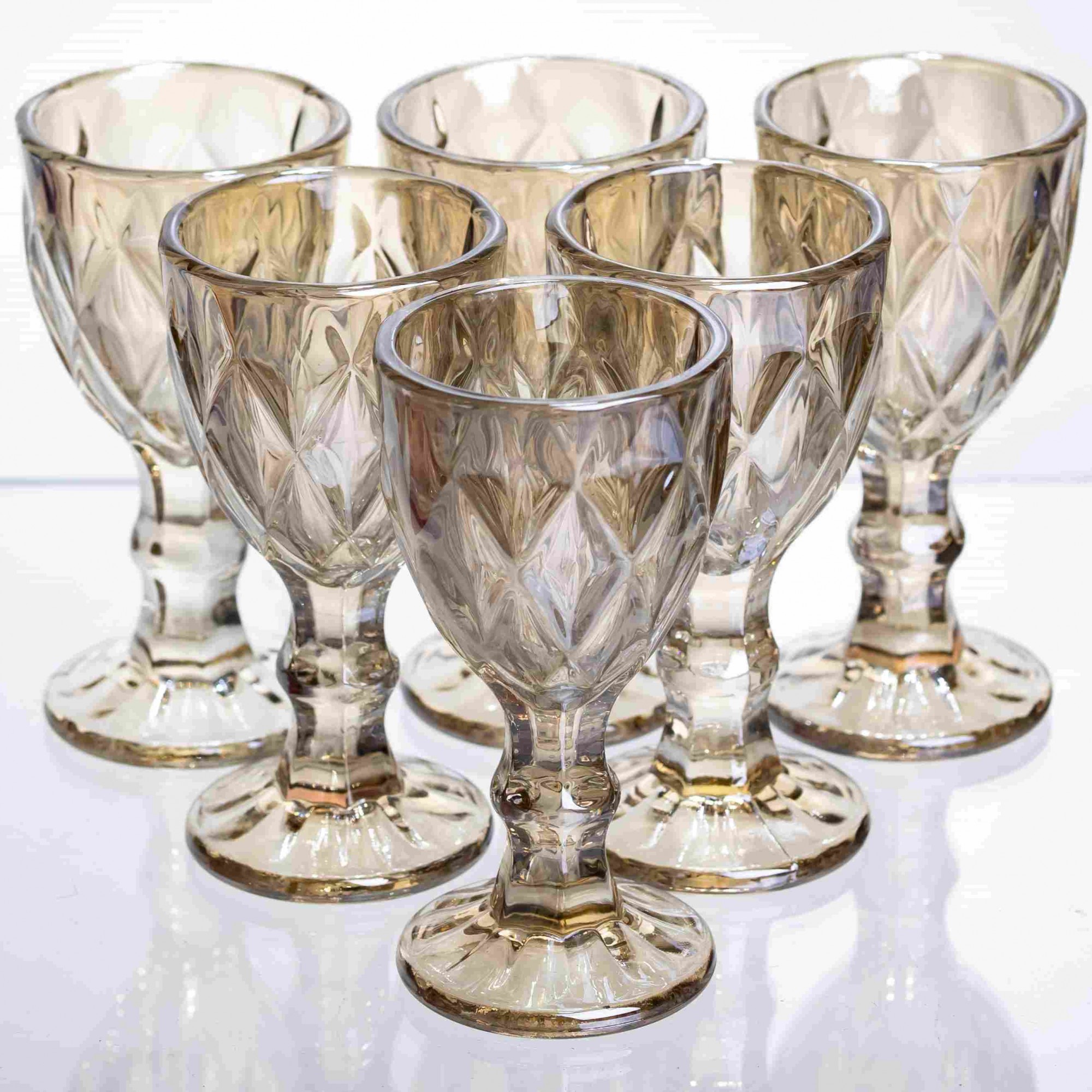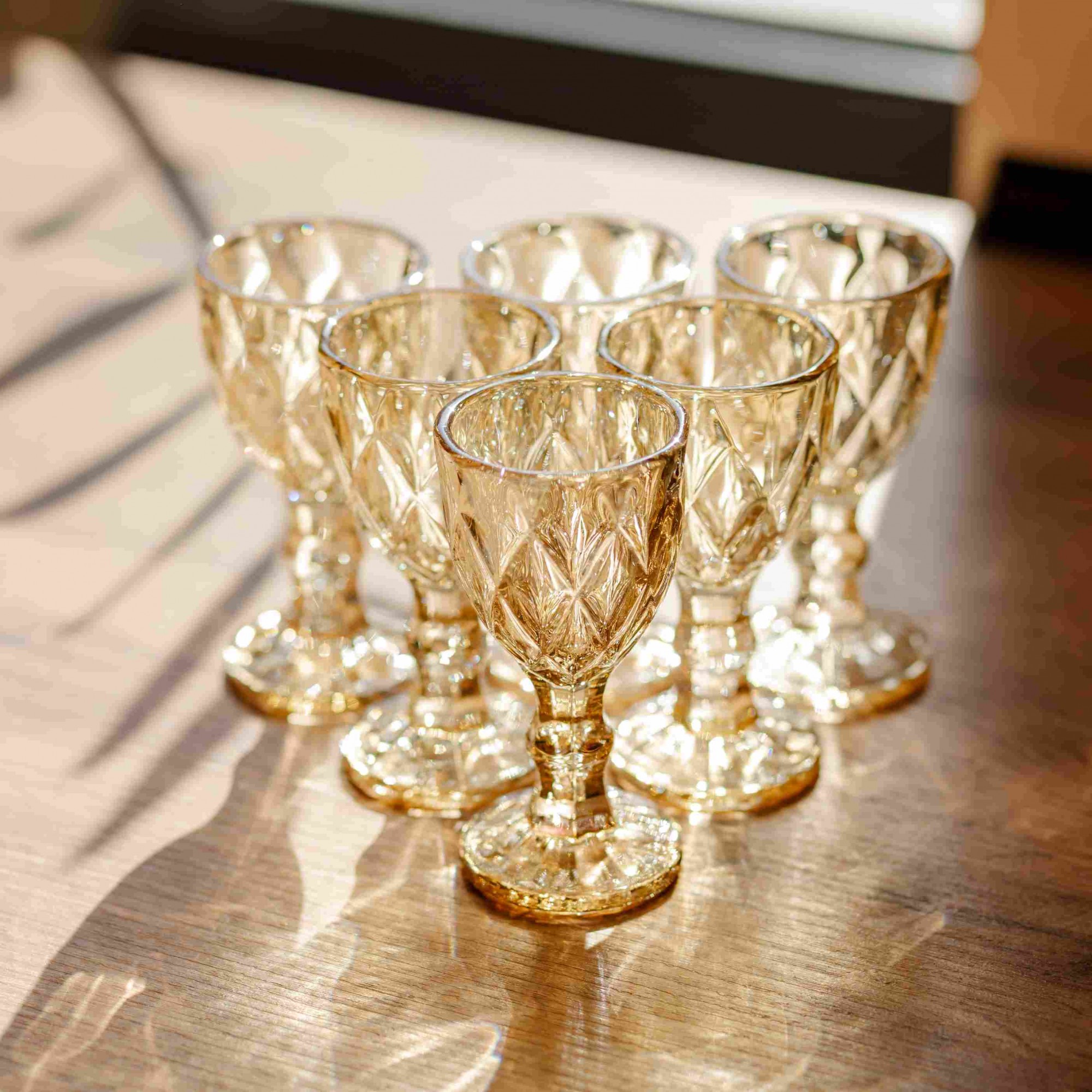 Комплект изящных рюмок из тонированного стекла в теплом медово-золотистом оттенке. Компактные и выразительные они станут гармоничным завершением сервировки стола в едином стиле. Особенности: Теплый блеск: янтарный оттенок стекла создает уютную атмосферу и красиво играет на свету, особенно в лучах солнца. Декоративная фактура: Фирменная алмазная грань делает рюмки не только красивыми, но и удобными в использовании – они уверенно лежат в руке. Изящный силуэт: тонкая фигурная ножка и устойчивая основа придают этим небольшим рюмкам завершенный классический вид. Характеристики: Материал: стекло Объем: 50 мл Высота: 10 см Диаметр: 4,5 см Вес: 800 г