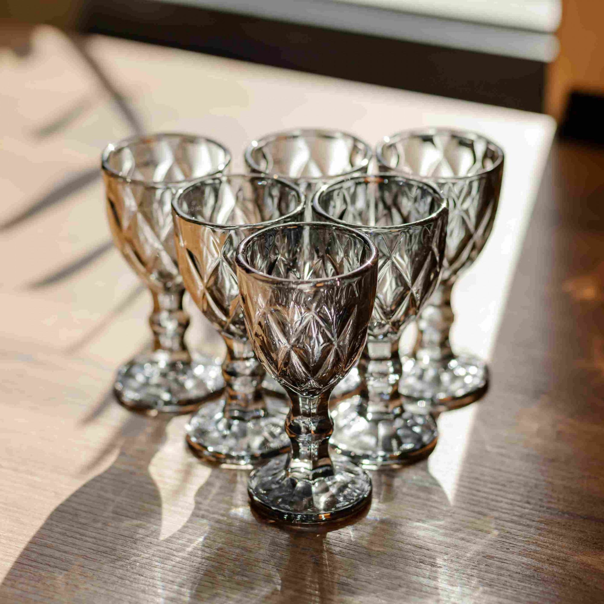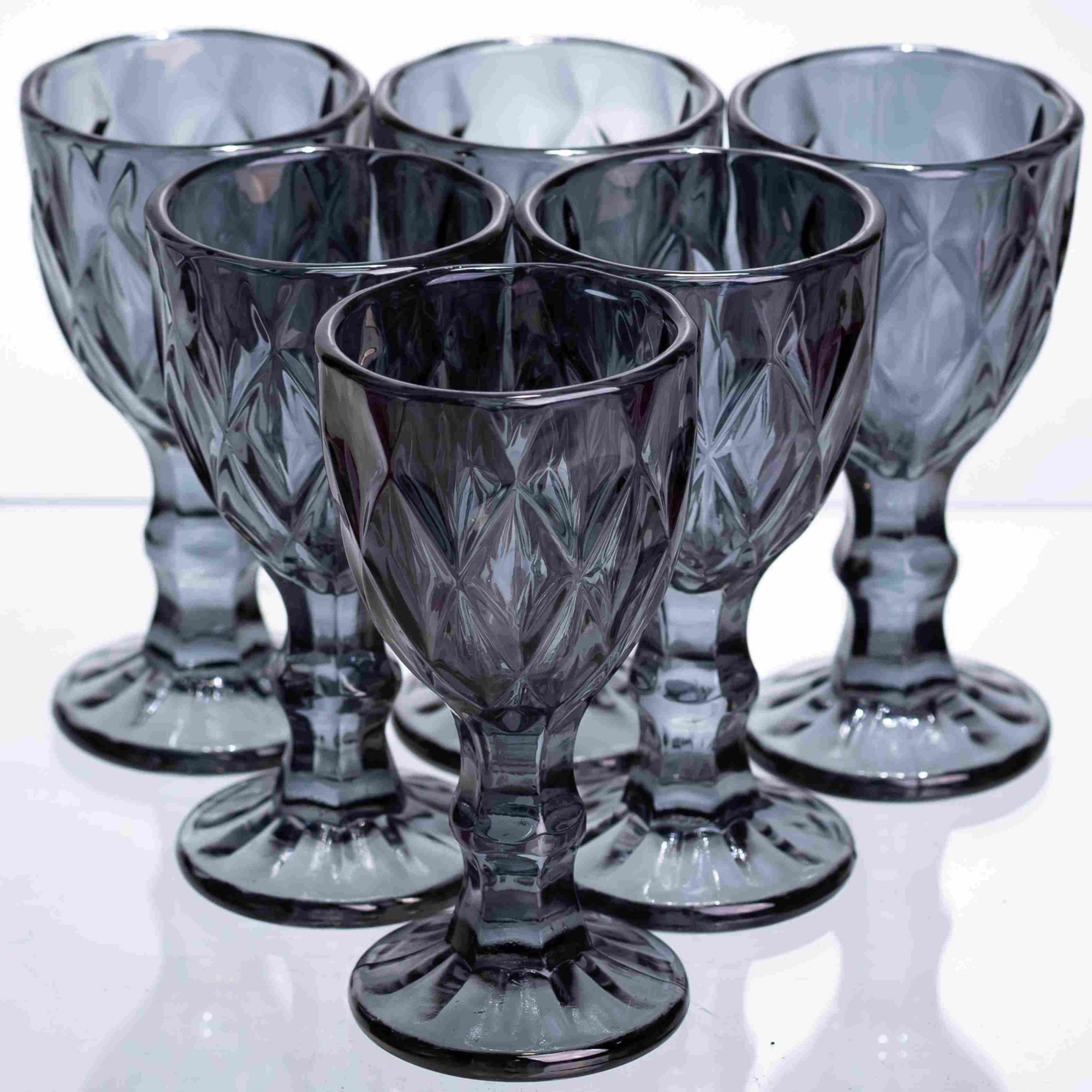 Комплект изысканных рюмок из тонированного стекла глубокого графитового оттенка. Благодаря своей компактной форме и выразительному рельефному узору, они станут стильным дополнением к сервировке стола. Особенности: Фактурный дизайн: Поверхность чаши украшена объемной алмазной огранкой, которая красиво преломляет свет и делает рюмки более устойчивыми при захвате рукой. Благородный цвет: Темный графитовый оттенок стекла придает посуде современный и статусный вид. Устойчивость: Каждая рюмка установлена на фигурной ножке с основанием, что гарантирует стабильность. Характеристики: Материал: стекло Объем: 50 мл Высота: 10 см Диаметр: 4,5 см Вес: 800 г