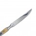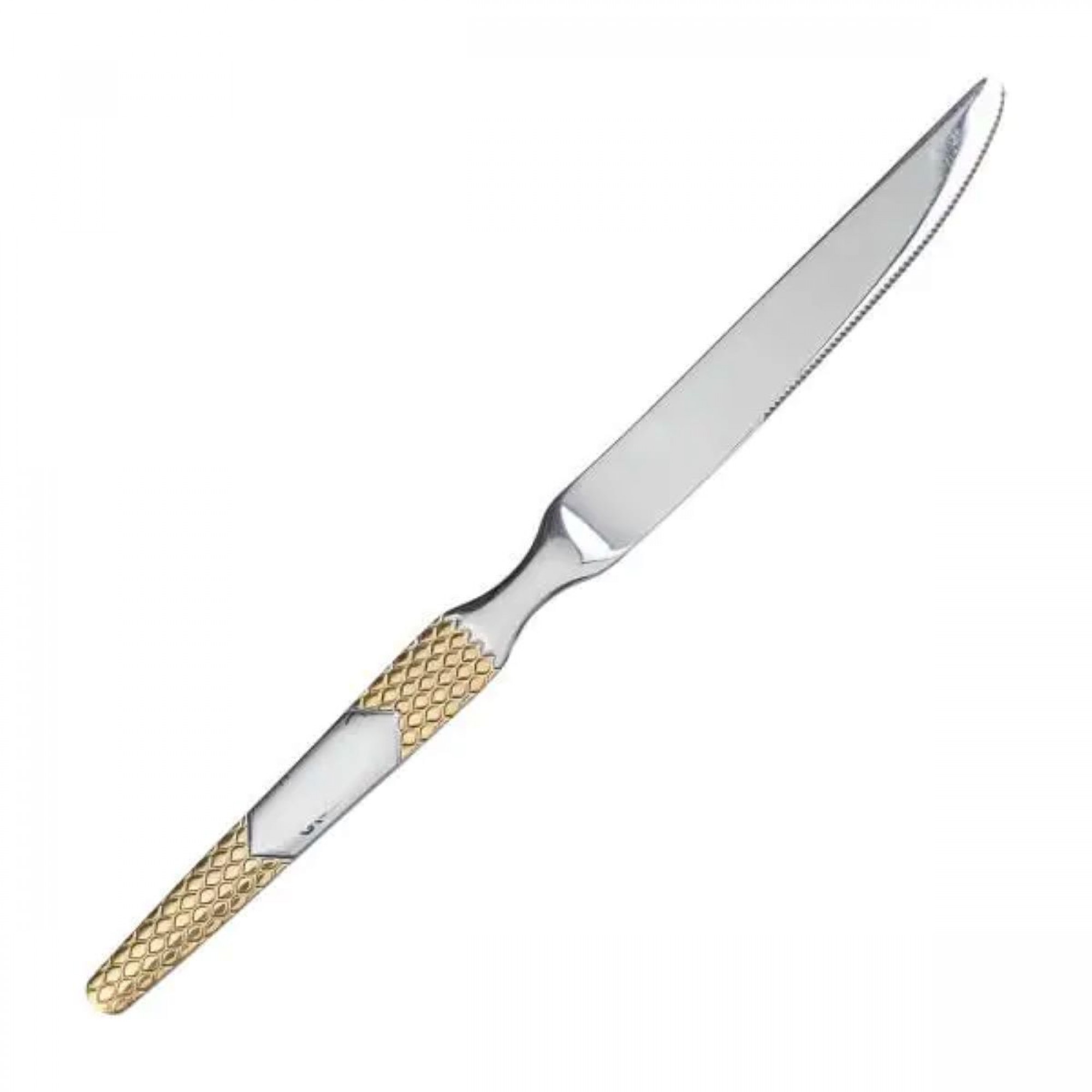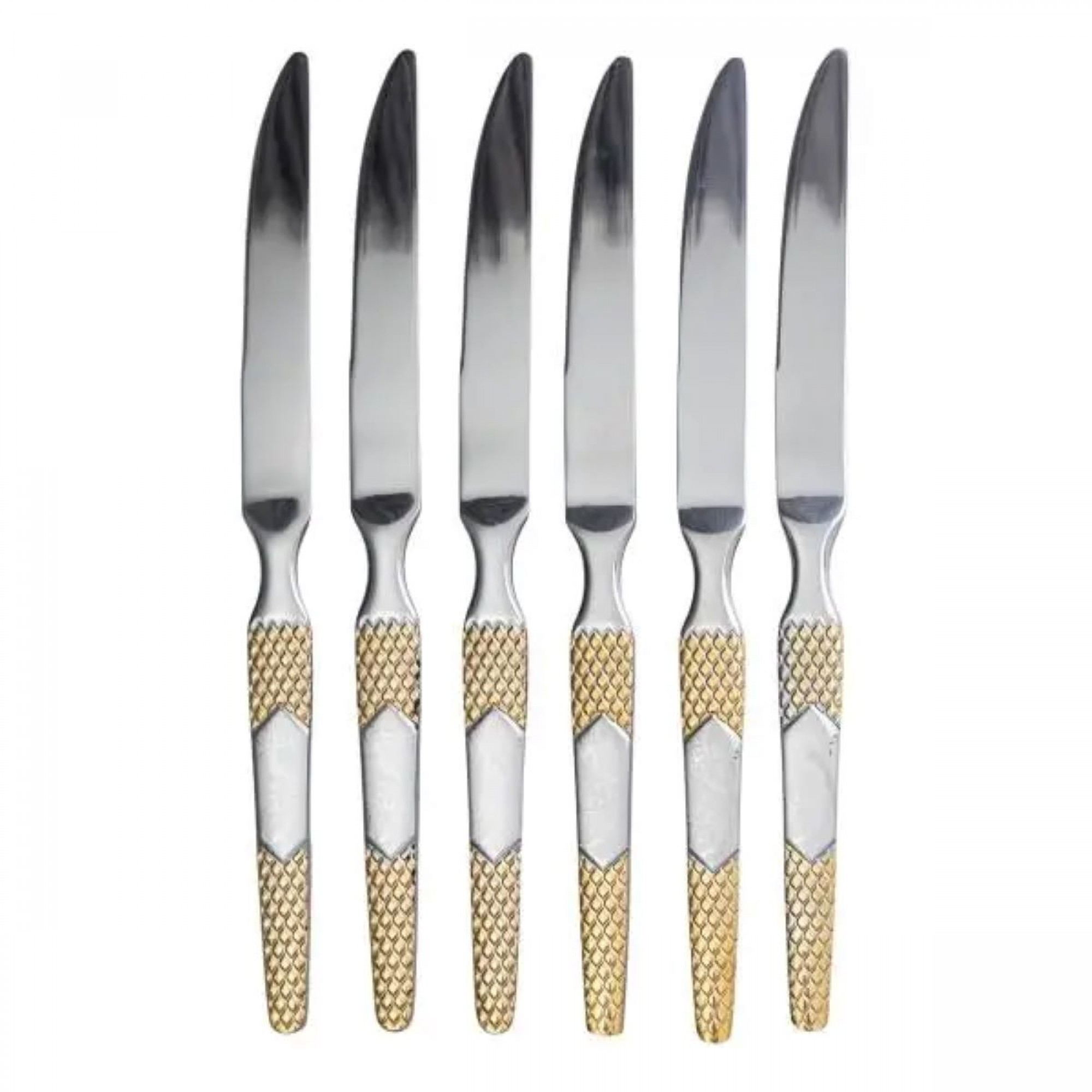 Набор столовых ножей включает 6 штук, упакованных в удобную блистерную упаковку для сохранности и транспортировки. Ножи имеют серебристое покрытие, которое придает им элегантный вид, а золотистая отделка на ручках и изящная гравировка делают каждый нож особенным. Дизайн сочетает классические элементы с современными акцентами, создавая стильный и функциональный предмет на вашем столе. Основные характеристики: Количество предметов в наборе: 6 шт.; Количество персон: 6; Длина: 22.7 см; Материал: нержавеющая сталь; Упаковка: пакет. Ножи идеально подходят для ежедневного использования во время приема пищи и для праздничных обедов. Их удобные ручки обеспечивают комфорт при пользовании, а размер лезвия оптимальный для нарезки различных блюд. Для ухода рекомендуется использовать мягкие моющие средства, которые не повреждают покрытие и гравировку. После мытья стоит вытирать ножи до суха, чтобы сохранить их блеск и продлить срок службы изделия.