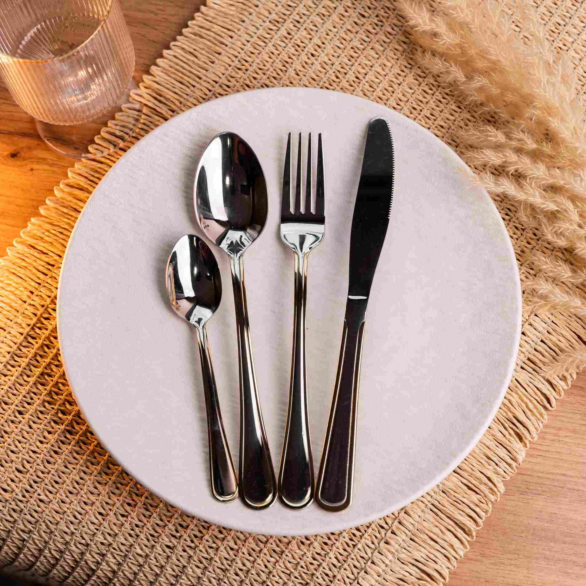 Комплект столовых приборов на 6 персон выполнен в классическом лаконичном стиле. Комплектация набора: столовые ложки - 6 шт (21,1 см) столовые вилки - 6 шт (21 см) столовые ножи - 6 шт (22,5 см) чайные ложки - 6 шт (15 см) Особенности: Материал: Нержавеющая сталь. Сплав устойчив к деформации и коррозии, подходит для длительного ежедневного использования. Качество полировки: Рабочие части (зубцы, черпаки и лезвия) имеют глянцевый блеск. Края приборов тщательно проработаны для комфортного использования. Эргономика: Фигурные рукояти расширяются до основания, обеспечивая удобство использования. Хранение: Набор находится в кейсе с индивидуальными ячейками, что обеспечивает хранение покрытия при хранении. Характеристики: Материал: нержавеющая сталь Количество предметов: 24 Вес набора: 1,9 кг