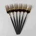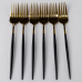 Элегантные столовые приборы, сочетающие в себе утонченный силуэт и современное исполнение. Особенности: Материал: качественная нержавеющая сталь с защитной PVD-напылением. Такое покрытие долговечно, устойчиво к истиранию и безопасно для контакта с пищей. Размер: Длина изделия - 21,5 см. Вилка имеет удлиненные зубцы и сбалансированный вес, что обеспечивает комфорт при употреблении основных блюд и салатов. Практичность: Несмотря на изящный вид, конструкция вилки обладает достаточной жесткостью и прочностью для ежедневного использования. Характеристики: Материал: нержавеющая сталь Длина: 21,5 см Вес набора: 200 г