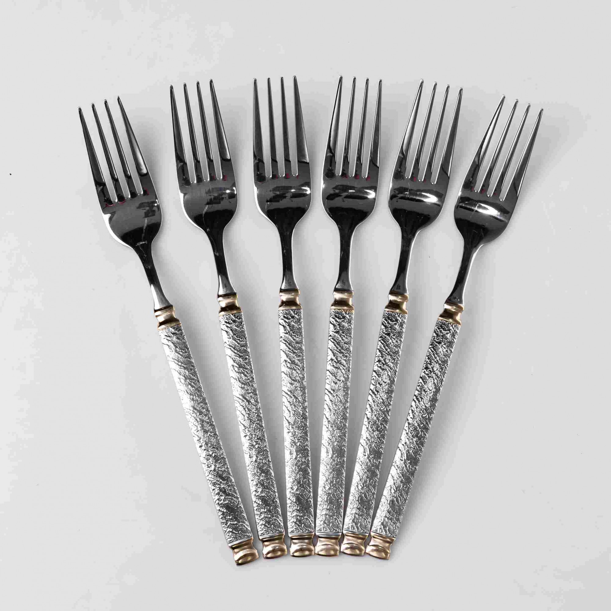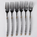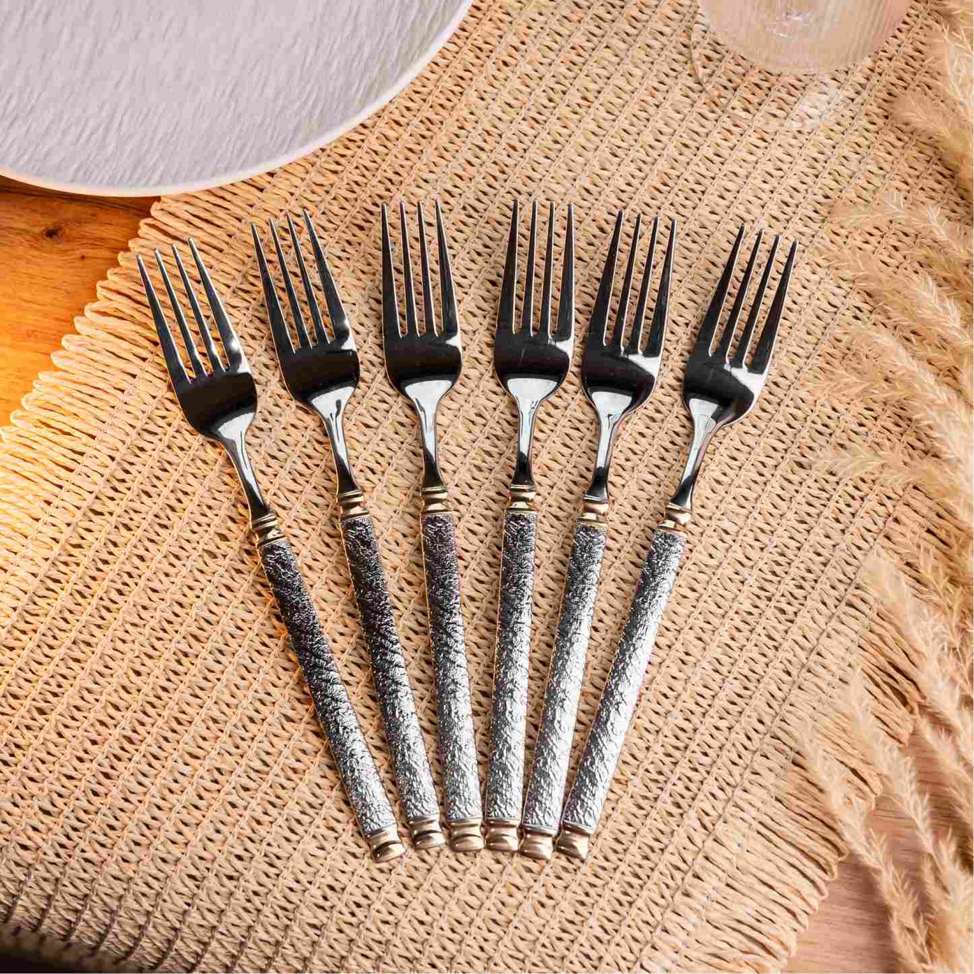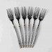 Полноразмерные столовые вилки подходят для повседневного использования и торжественной сервировки. Отличаются выразительной текстурой рукоятей и контрастными декоративными элементами. Особенности: Материал: Нержавеющая сталь. Материал устойчив к коррозии, деформации и воздействию органических кислот, содержащихся в продуктах. Рабочая часть: Классическая четырехзубная форма с зеркальной полировкой. Поверхность тщательно обработана для обеспечения гладкости и гигиеничности. Фактурная рукоятка: Имеет сложный рельефный узор, нанесенный методом объемного тиснения. Размер: Длина изделия составляет 21 см, что обеспечивает комфортный баланс и удобство при употреблении основных блюд и гарниров. Характеристики: Материал: нержавеющая сталь Длина: 21 см Вес набора: 200 г
