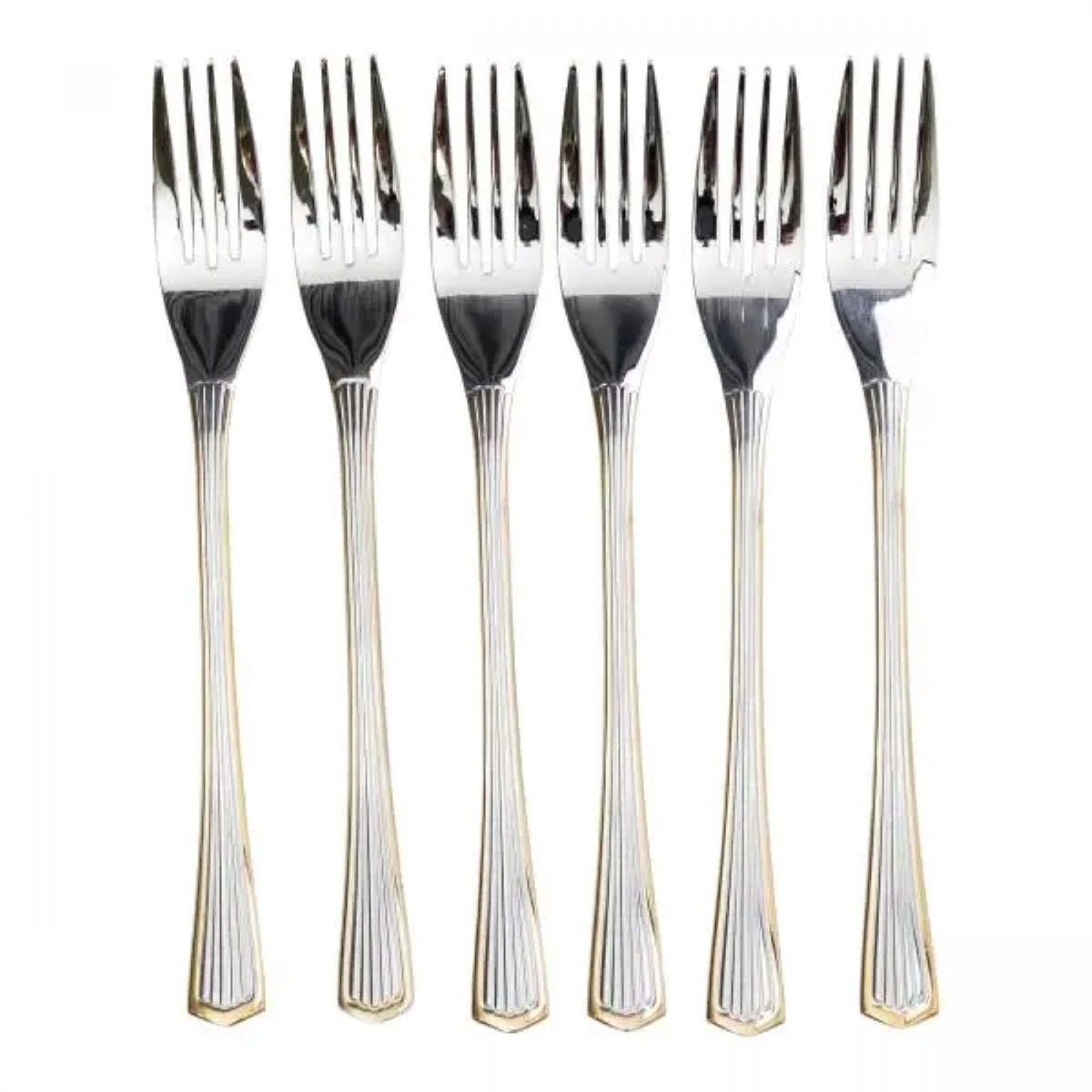 Набор столовых вилок содержит 6 штук, упакованных в блистерную упаковку. Вилки выполнены в классическом стиле, сочетая серебристую рабочую часть и золотистую ручку. Такой дизайн придает им изысканный вид и позволяет гармонично сочетаться с другими столовыми приборами. Основные характеристики: Количество предметов в наборе: 6 шт.; Количество персон: 6; Длина: 20.5 см; Материал: нержавеющая сталь; Упаковка: пакет. Изготовленные из нержавеющей стали, вилки отличаются прочностью, устойчивостью к коррозии и износостойкостью. Благодаря полированной поверхности они легко очищаются, а эргономичная форма ручки обеспечивает удобный хват во время использования. Золотистое покрытие ручки добавляет эстетической привлекательности, не влияя на практичность и долговечность приборов. Набор идеально подходит как для ежедневного использования, так и для сервировки праздничного стола. Блистерная упаковка гарантирует защиту вилок во время транспортировки и удобство хранения. Все предметы легко моются вручную или в посудомоечной машине без потери блеска и качества покрытия.