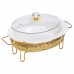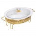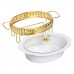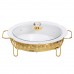 Фарфоровый овальный мармит предназначен для подачи горячих блюд с сохранением их температуры в течение длительного времени. Емкость изготовлена из керамики, которая хорошо удерживает тепло и равномерно прогревает содержимое. Стеклянная крышка удобной ручкой позволяет наблюдать за блюдом, не снимая его, сохраняя при этом аромат и тепло. Металлическая подставка обеспечивает стойкость и имеет специальное место для свечи-таблетки, используемой для обогрева. Такой способ поддержания температуры удобен во время длительных трапез, праздничных обедов или фуршетов, ведь он не пересушивает и не прижаривает блюда. Конструкция продумана так, чтобы тепло распределялось равномерно и безопасным способом. Основные характеристики мармита: Размер с подставкой: 37×26×17 см; Размер без подставки: 32×26×13 см; Объем: 2 л; Материал мармита: фарфор; Материал крышки: стекло; Материал подставки: металл. Фарфоровый мармит является не только практичным, но и эстетически привлекательным выбором для любого стола, обеспечивая удобство и стиль во время сервировки блюд. Купить мармит керамический можно с доставкой по всей Украине.