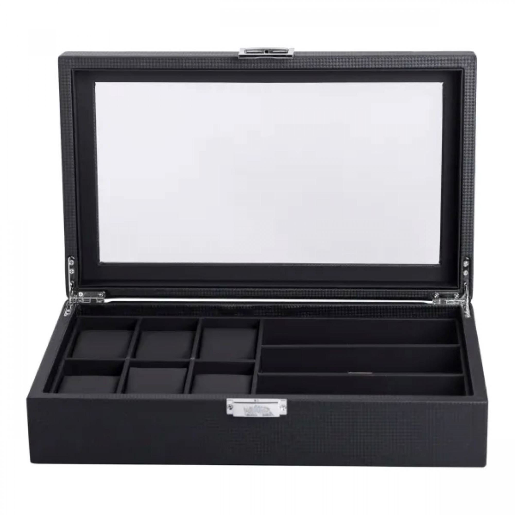 Шкатулка для наручных часов и очков размером 35,5х21х9,5 см - элегантное и функциональное решение для хранения аксессуаров. Шкатулка имеет 9 отсеков, которые позволяют удобно организовать коллекцию часов и каждую пару очков в отдельных ячейках. Внутренняя отделка выполнена из экокожи и отлично подходит для различных металлов, которые используются в изготовлении корпусов, а также защищает линзы от царапин и повреждений. Шкатулка отличается стильным дизайном, размер подушечек подойдет для гибких и жестких браслетов. Отсеки для очков имеют оптимальный размер для большинства популярных моделей. Крышка органайзера оснащена накидным замком, предотвращающим случайное открывание, что особенно важно для дорогих и хрупких экземпляров. Элементы фурнитуры изготовлены из нержавеющей стали, точки крепления тщательно проработаны. Характеристики: Материал отделки: экокожа Материал покрытия: экокожа Количество отсеков: 9 Количество ярусов: 1 Размеры: 35,5х21х9,5 см Вес: 1100 г