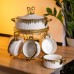 Суповой сервиз из высококачественного фарфора станет украшением любого стола и придаст сервировке нотку изысканности. Элегантное сочетание белого цвета с золотыми и черными акцентами делает набор особенно нарядным и современным. В комплект входит супница с крышкой и шесть суповых тарелок, на прочной металлической подставке с золотым покрытием. Благодаря удобной форме и продуманному дизайну сервиз не только красив, но и практичен в использовании. Основные характеристики супового сервиза: Материал: фарфор + металл; Размер: 25×25×33 см; Объем супницы: 2 литра; Объем тарелок: 400 мл; Диаметр супницы: 22 см. Диаметр тарелок: 11см. Такой набор прекрасно подойдет для семейных обедов, праздничных ужинов или торжественных мероприятий. Он станет отличным подарком на свадьбу, новоселье или юбилей, подчеркивая вкус и внимание к деталям хозяев дома.