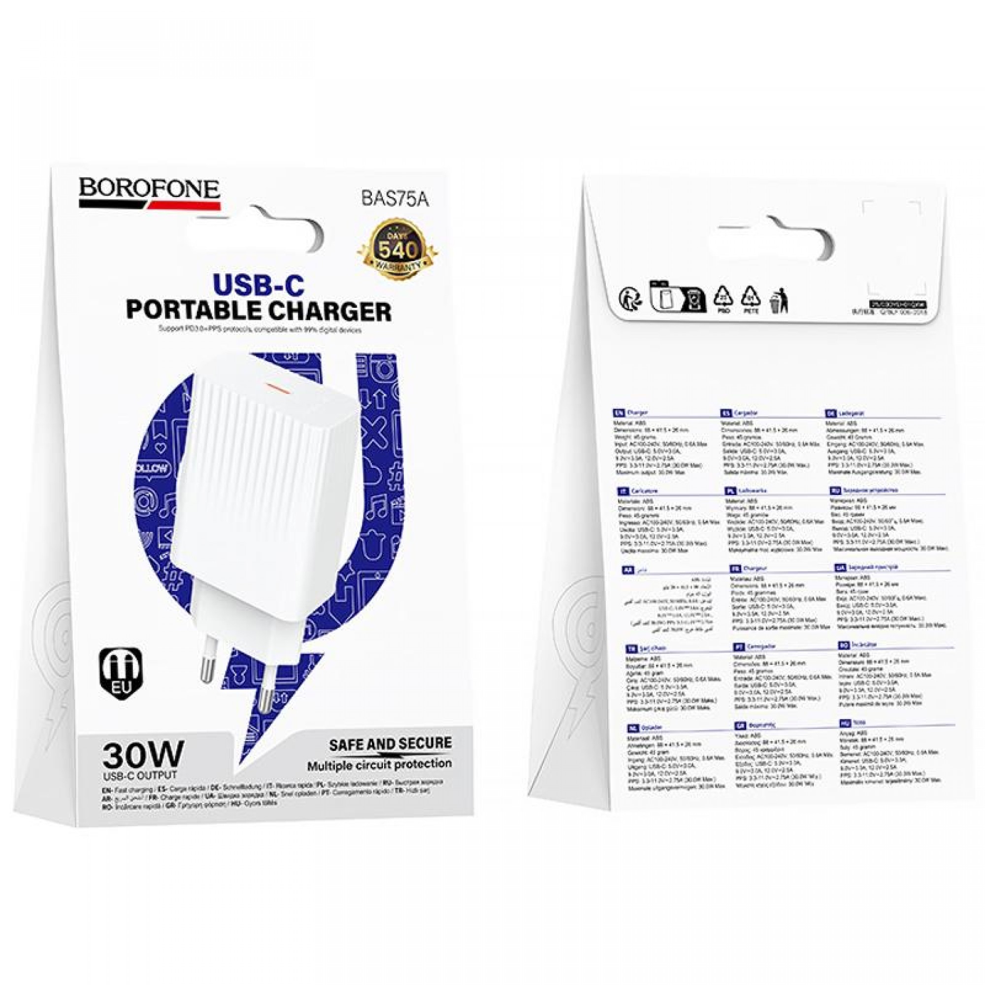 Зарядное устройство Borofone BAS75A оснащено одним USB-C портом, что позволяет использовать его с современными устройствами, поддерживающими технологию Power Delivery. Это обеспечивает быструю и безопасную зарядку, что особенно важно для пользователей, которые ценят свое время и хотят всегда оставаться на связи.