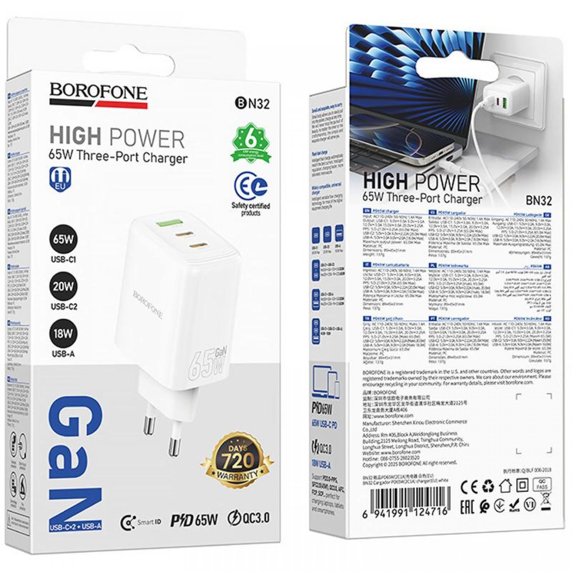 Зарядное устройство Borofone BN32 Cargador PD65W оснащено одним USB-A и двумя USB-C портами, что позволяет одновременно заряжать несколько устройств. Это делает его идеальным выбором для пользователей, которым необходимо поддерживать заряд сразу нескольких гаджетов. Благодаря поддержке технологии Power Delivery, устройство обеспечивает быструю зарядку, что особенно важно для современных смартфонов и планшетов.