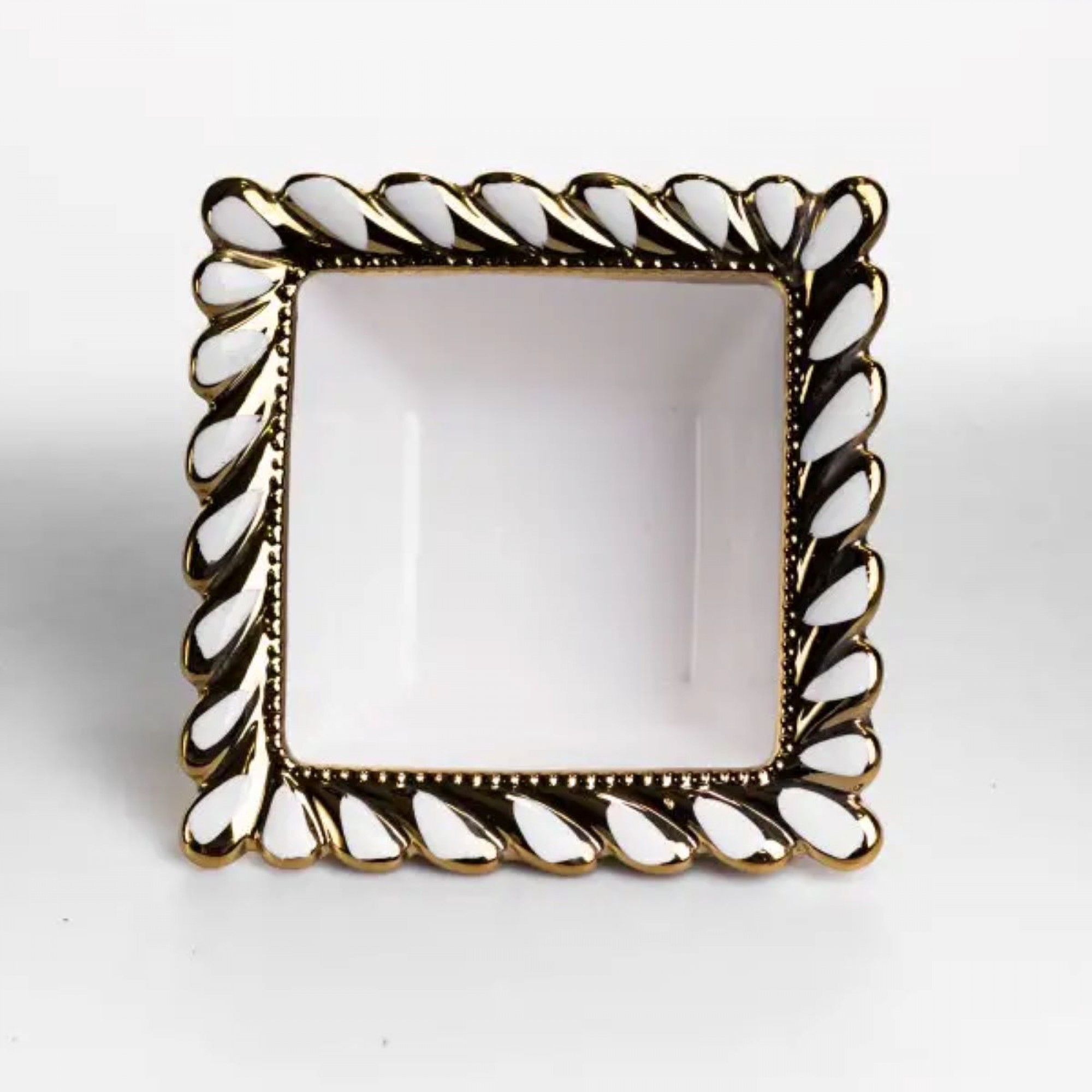Глубокая квадратная тарелка Tiffany из фарфора привлекает внимание четкой геометрией и компактным форматом. Размер 15×15 см и высота 7 см делают ее удобной для порционной подачи блюд, где важна не только функциональность, но и аккуратный вид на столе. Тарелка подходит для ежедневного использования: в ней удобно подавать супы, салаты, гарниры или десерты. Благодаря глубине 7 см содержимое хорошо удерживается внутри, а квадратная форма помогает эффективно использовать пространство на столе или сервировке. Вес 400 г обеспечивает баланс между легкостью и стойкостью при использовании. Край тарелки оформлен рельефным узором в виде переплетенного каната по всему периметру. Контрастное сочетание светлой основы с золотистыми акцентами подчеркивает форму изделия и придает четкость контуру. Такой декор выглядит выразительно, но не перегружает общий вид, поэтому тарелка легко сочетается с разной посудой в сервировке. Характеристики: Материал: фарфор Форма: квадратная Размеры: 15 × 15 см Объем 400 мл Высота: 7 см Вес: 400 г